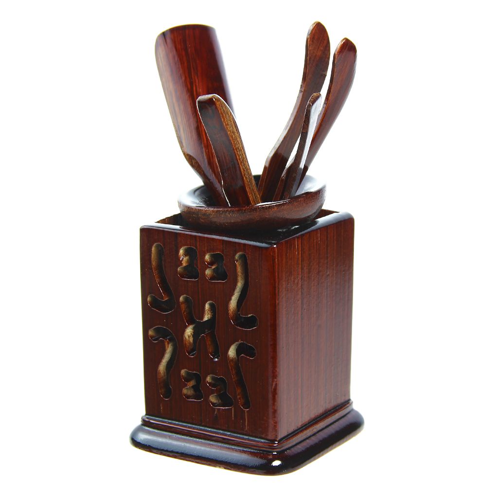 Набор чайных принадлежностей из темного дерева в четырехгранной подставке с прорезным орнаментом, включает чайную иглу, пинцет, лопатку и совочек
