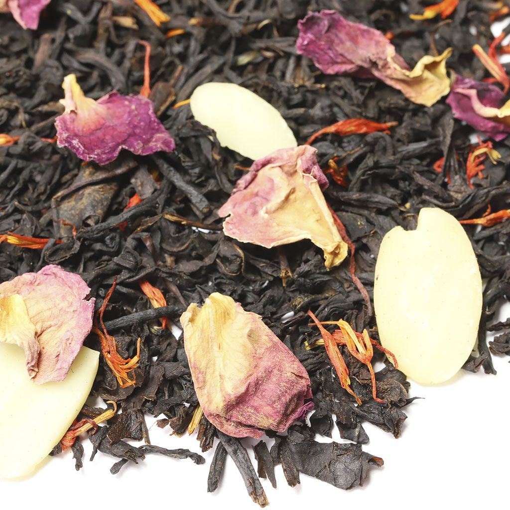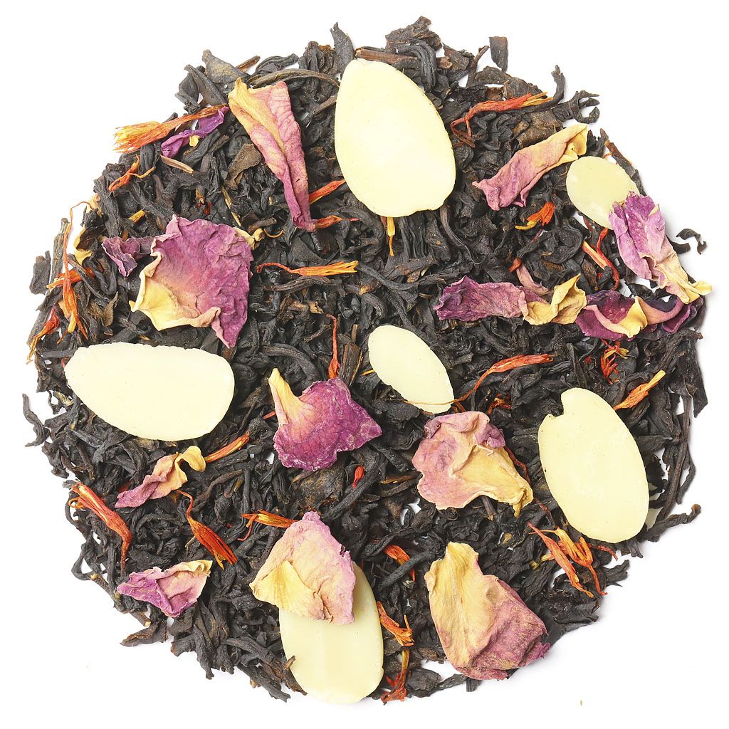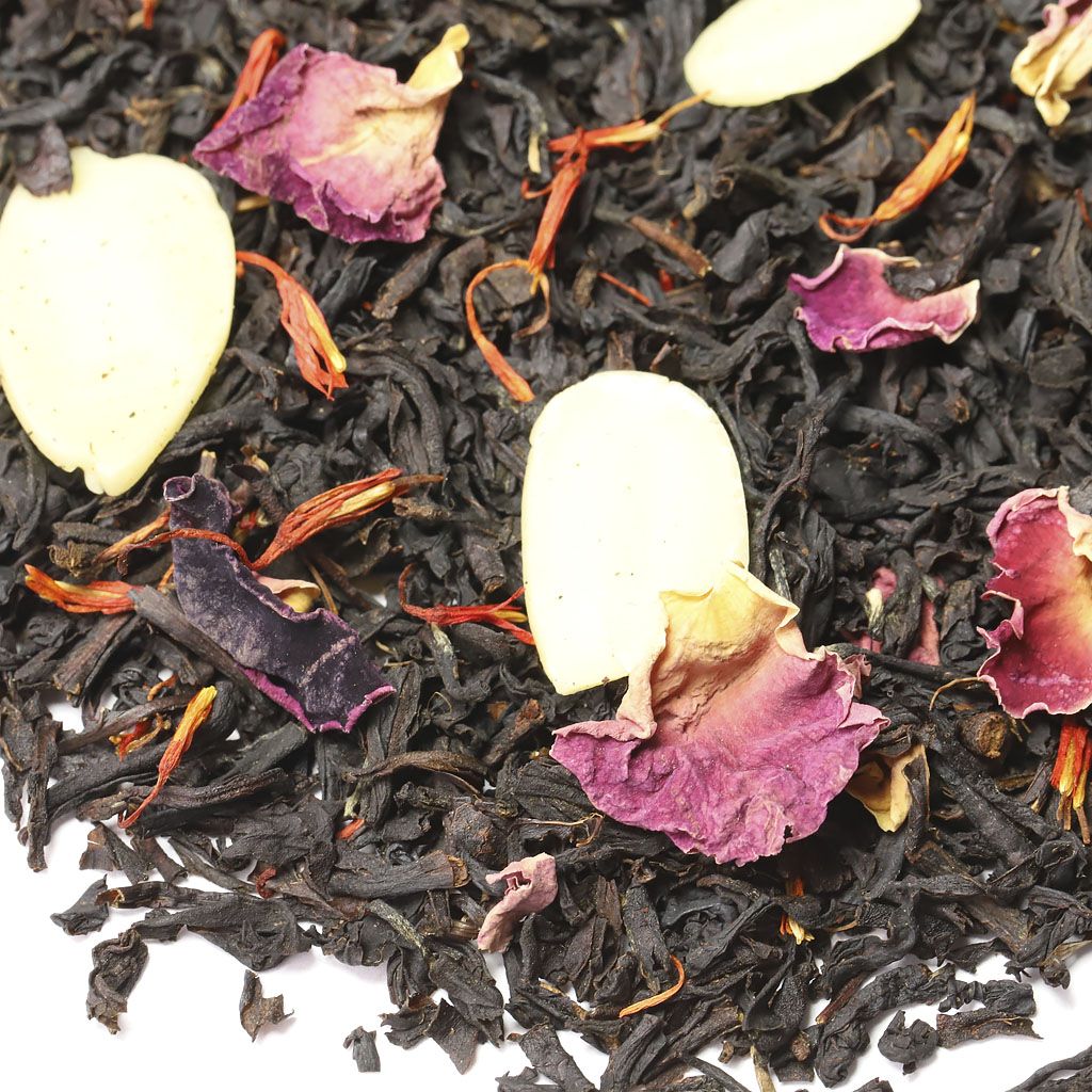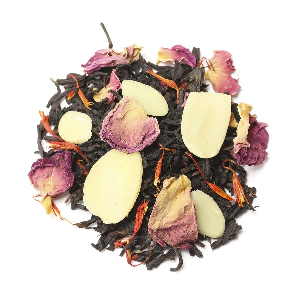 Чай черный индийский, слайсы миндаля, лепестки розы, лепестки сафлора, аромат миндаля и сливок.