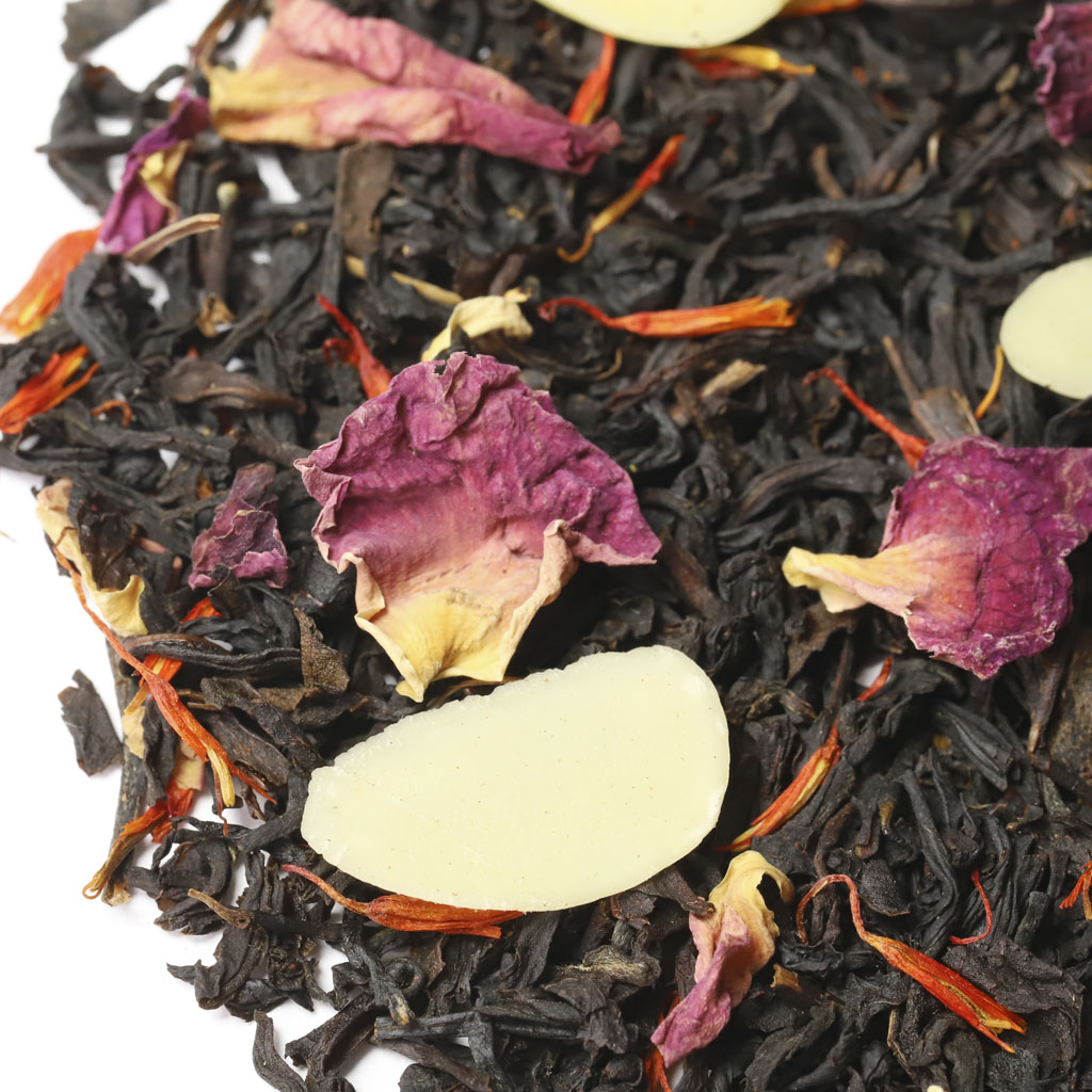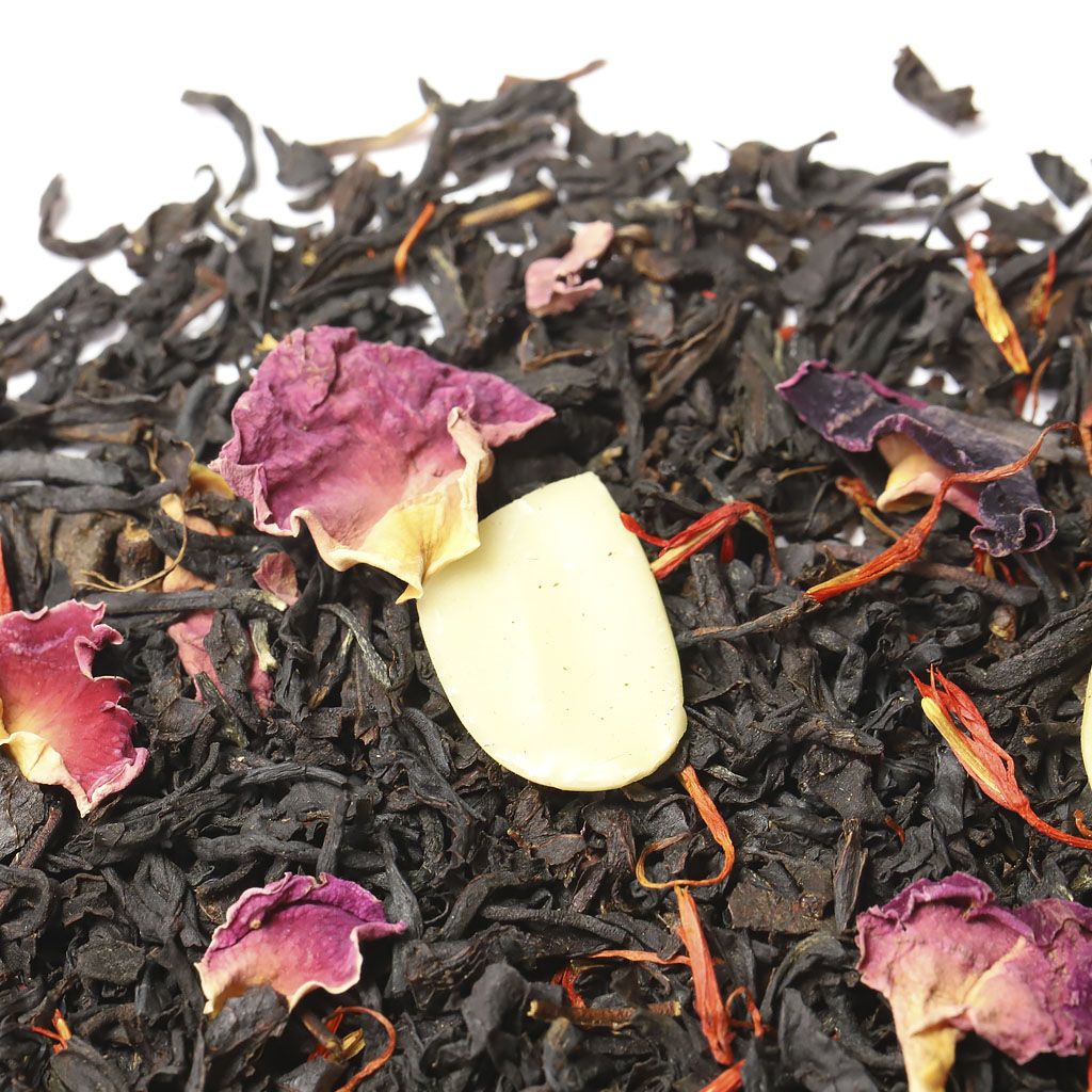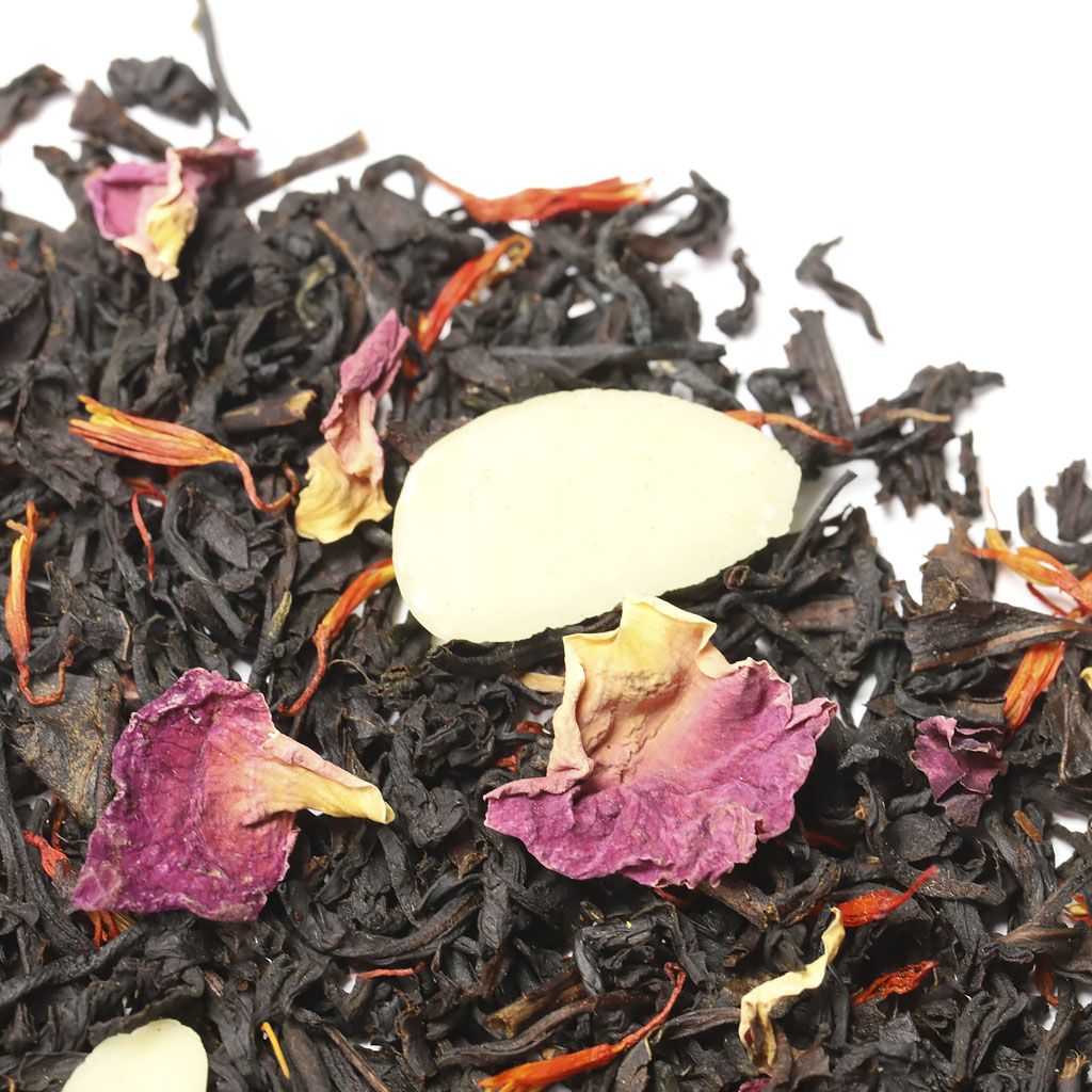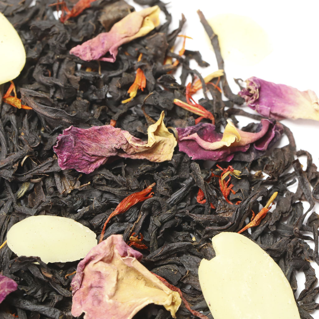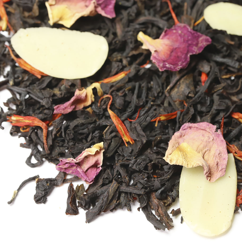 Чай черный индийский, слайсы миндаля, лепестки розы, лепестки сафлора, аромат миндаля и сливок.