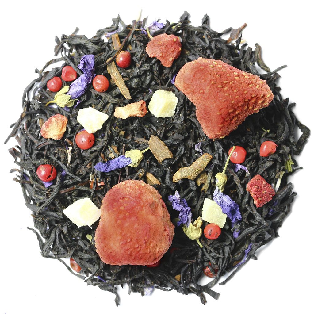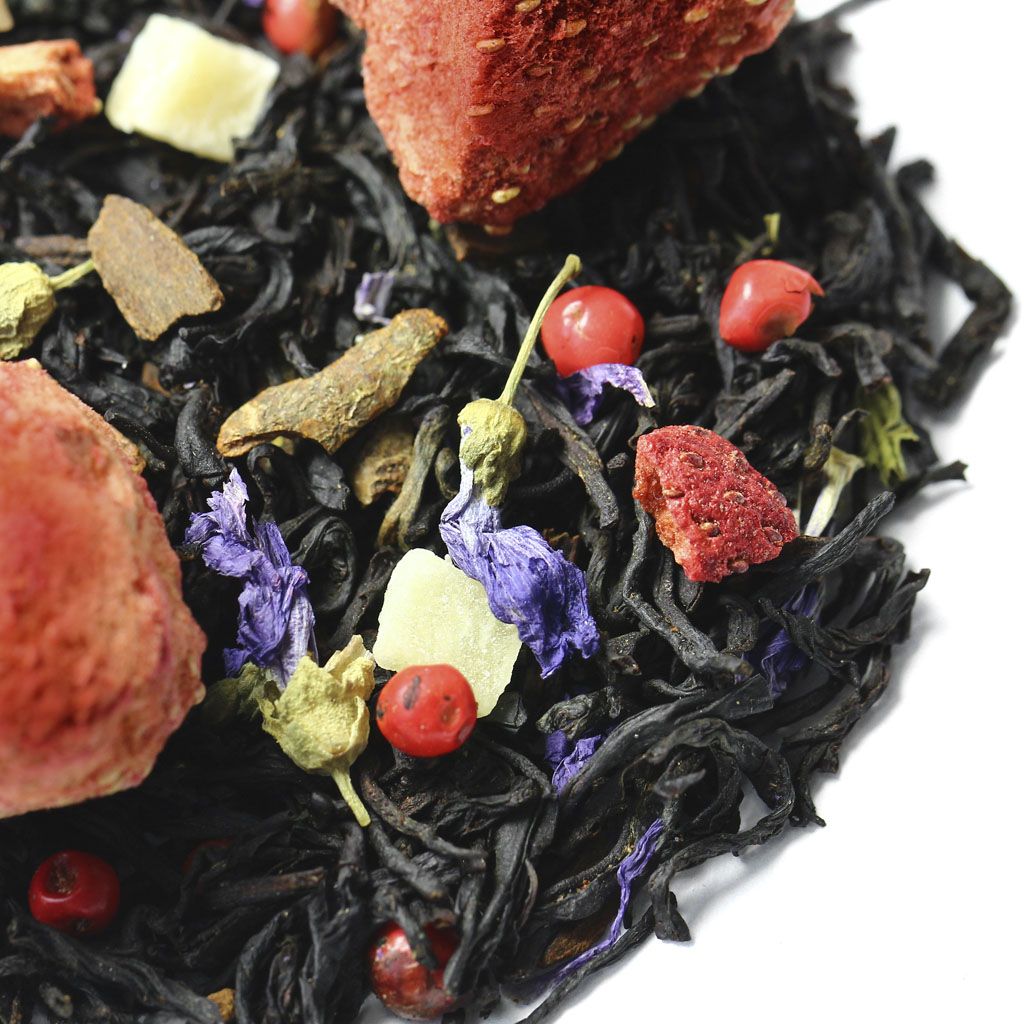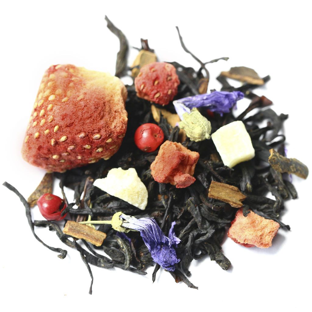 Чай черный индийский ассам, целые ягоды клубники, кусочки ананаса, кусочки корицы, кусочки клубники, цветы мальвы, перец розовый недробленый, аромат сладкой клубники