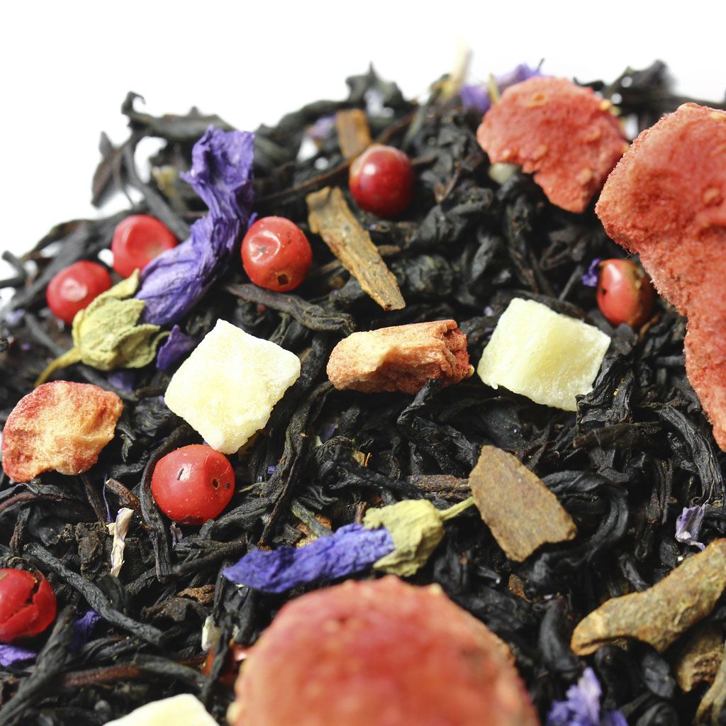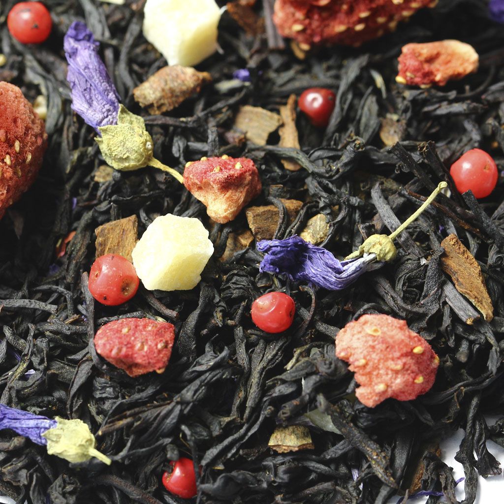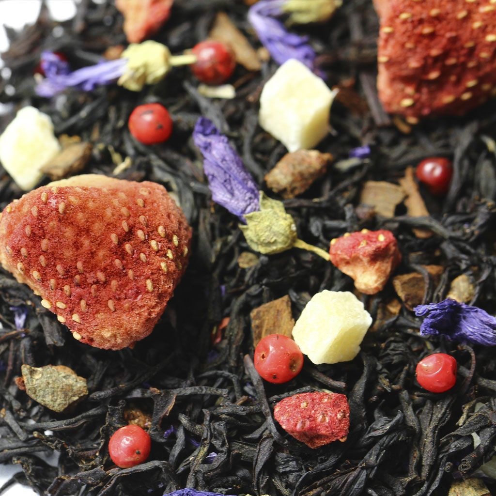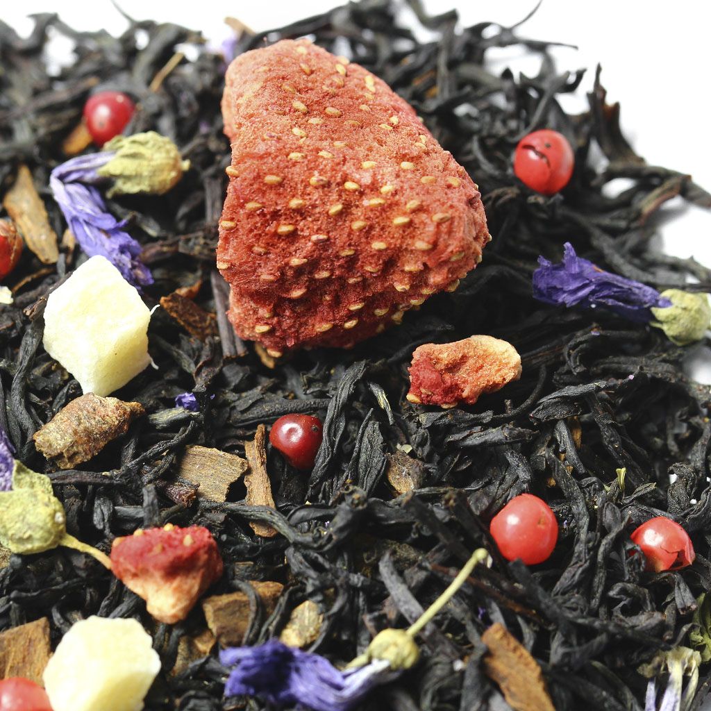 Чай черный индийский ассам, целые ягоды клубники, кусочки ананаса, кусочки корицы, кусочки клубники, цветы мальвы, перец розовый недробленый, аромат сладкой клубники