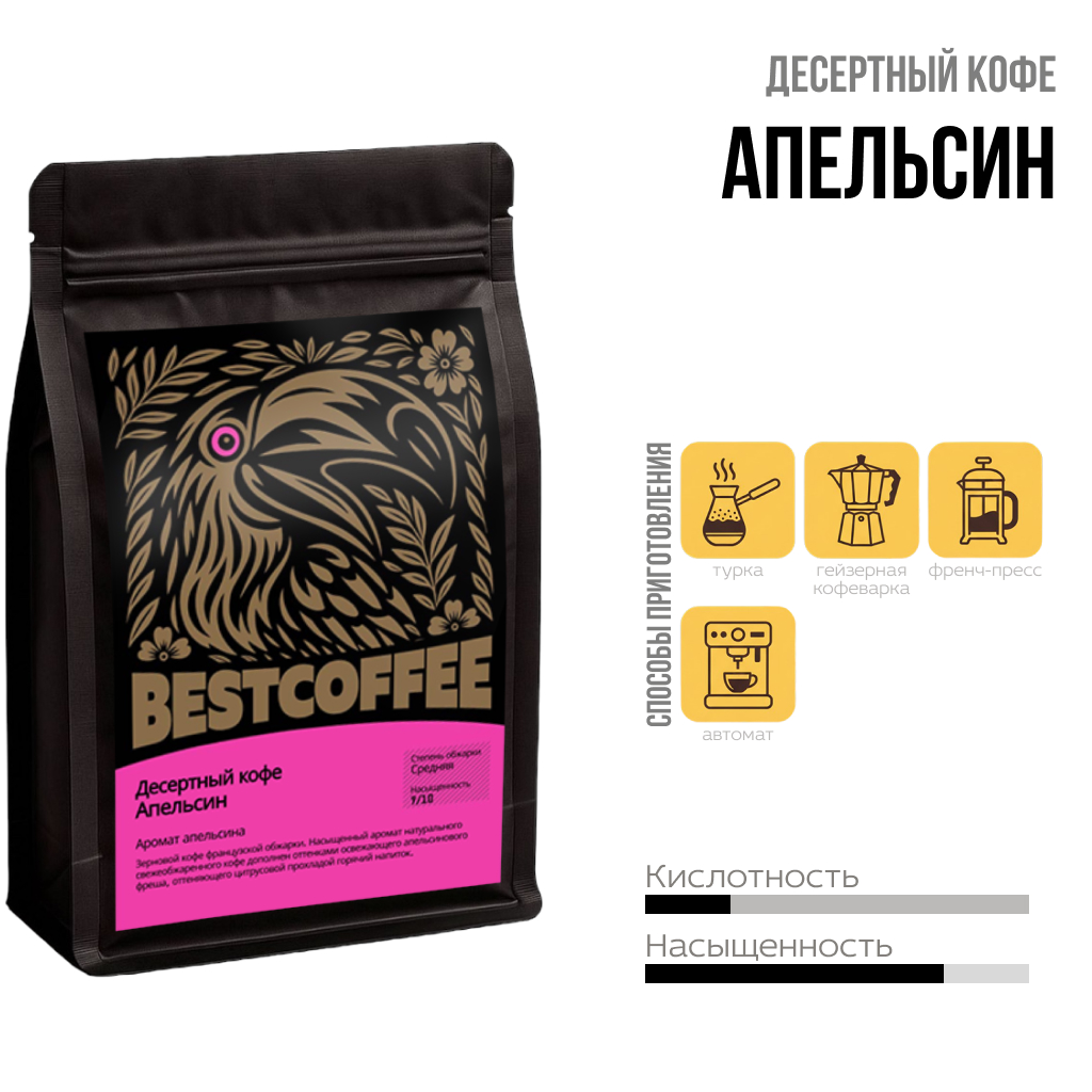 Зерновой кофе французской обжарки. Насыщенный аромат натурального свежеобжаренного кофе дополнен оттенками освежающего апельсинового фреша, оттеняющего цитрусовой прохладой горячий напиток.