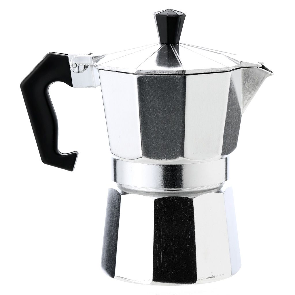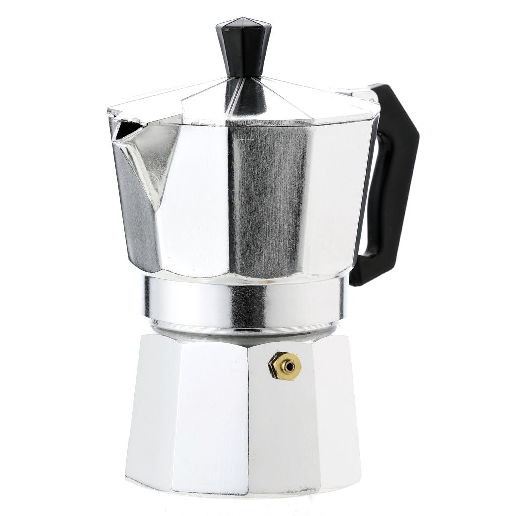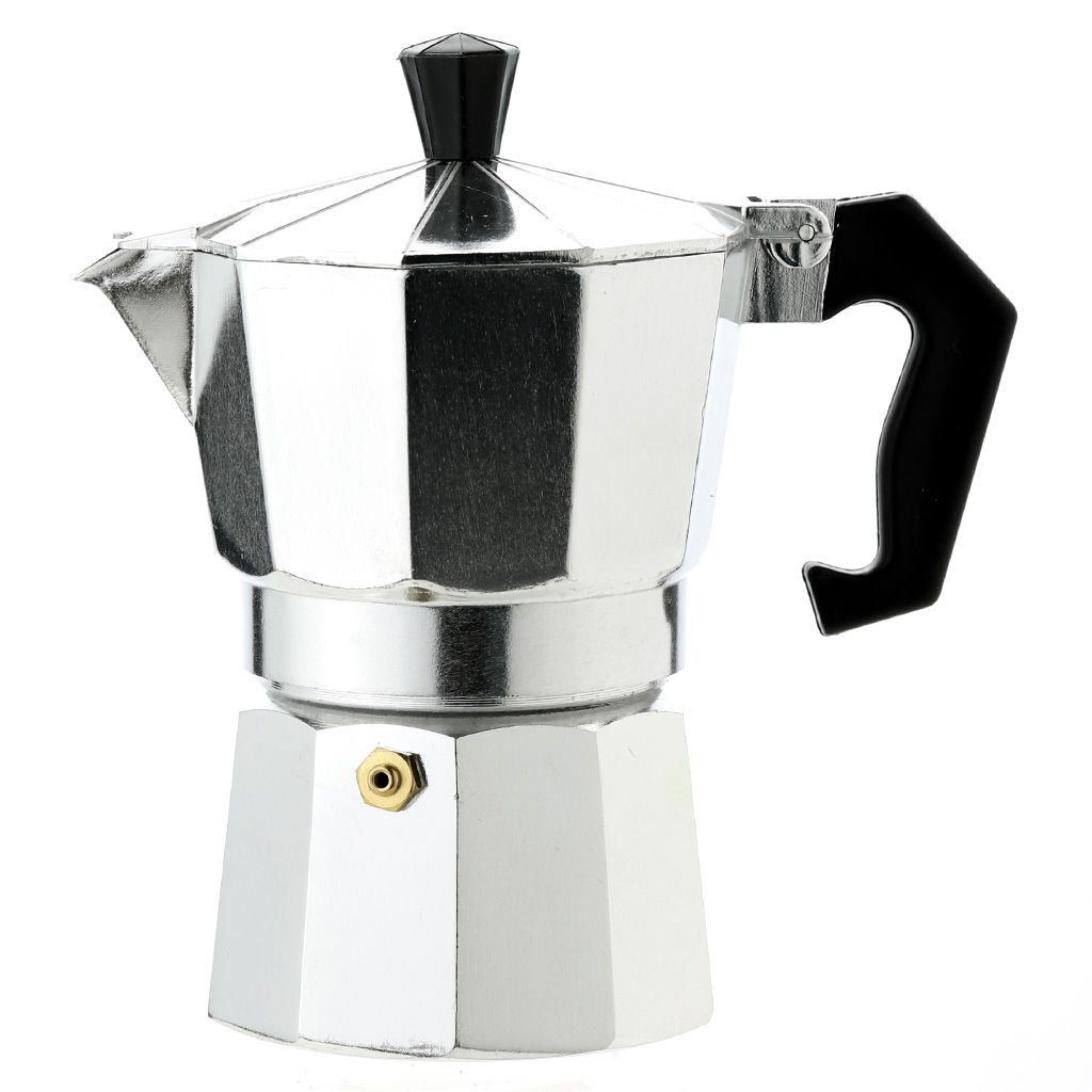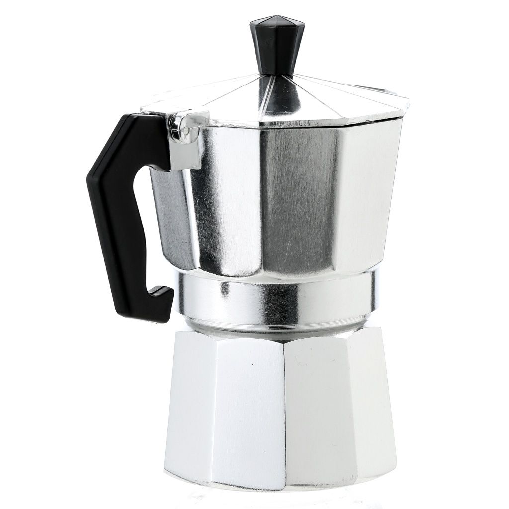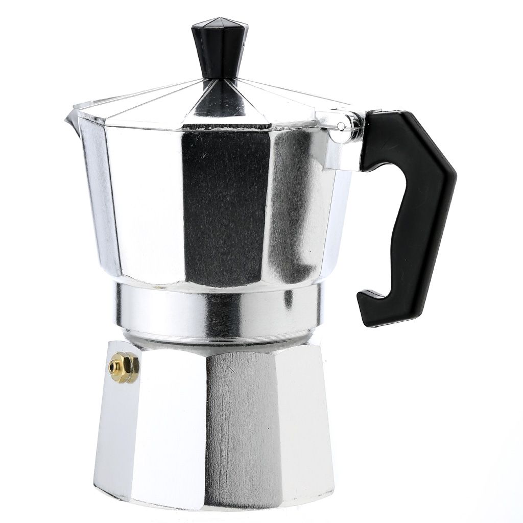Кофеварка гейзерная алюминиевая на 3 чашечки, граненная, в форме песочных часов, с пластиковой ручкой.