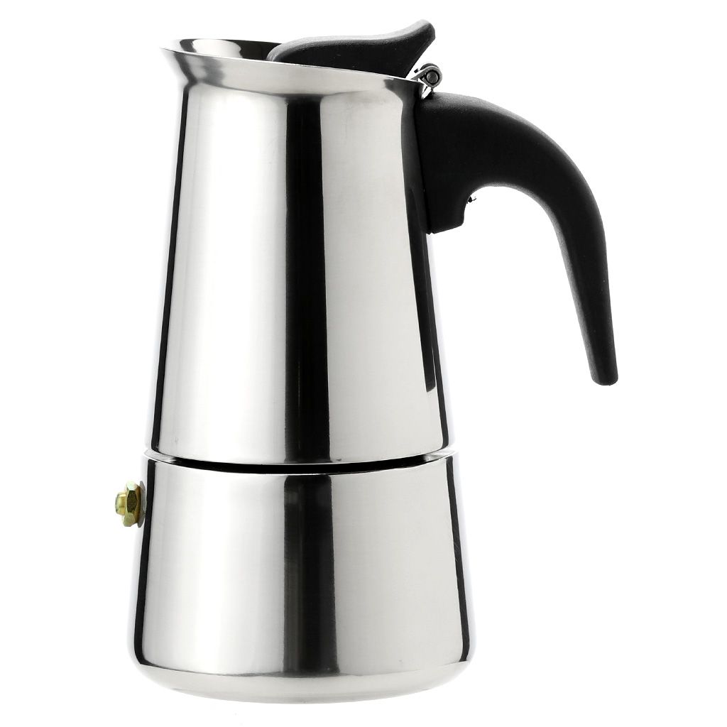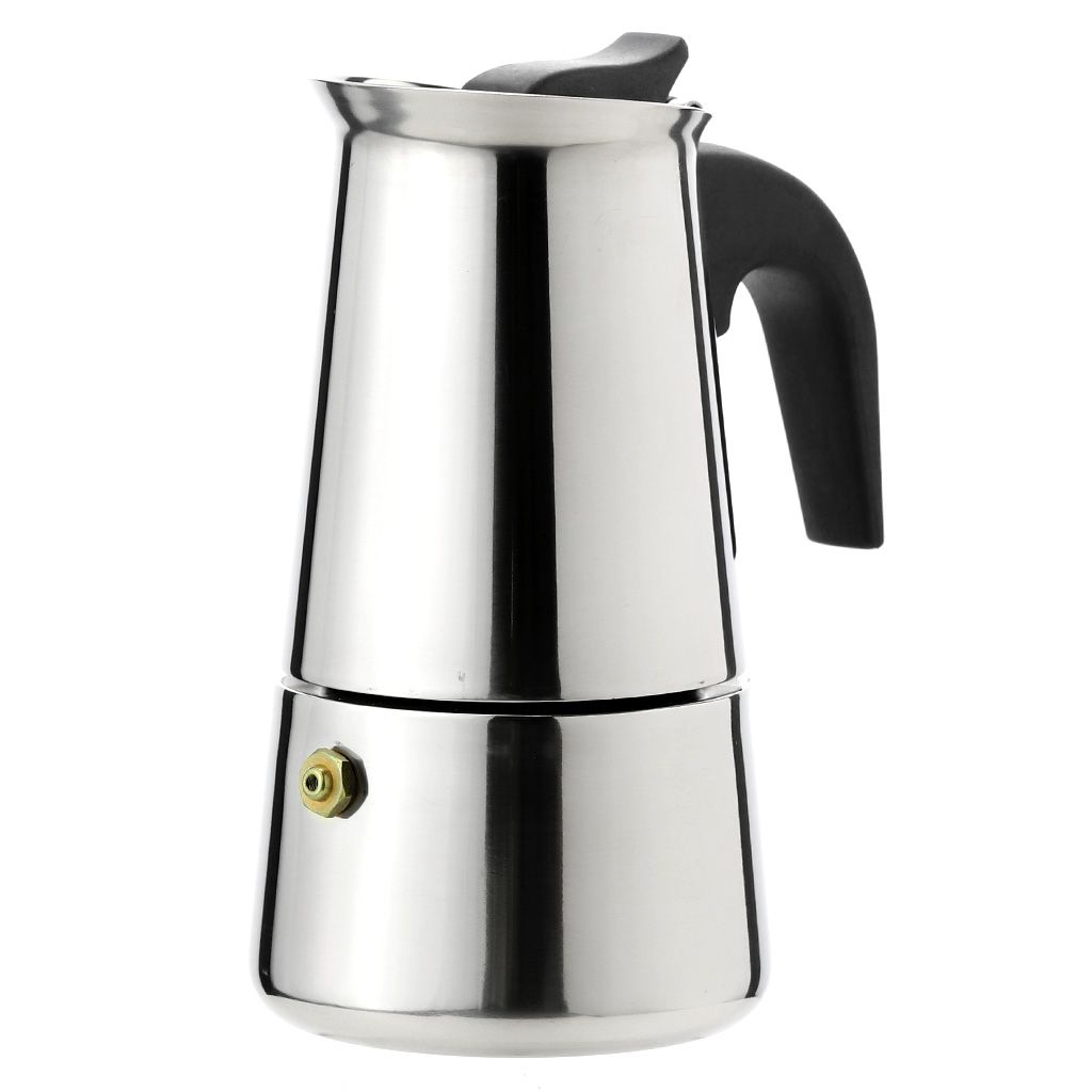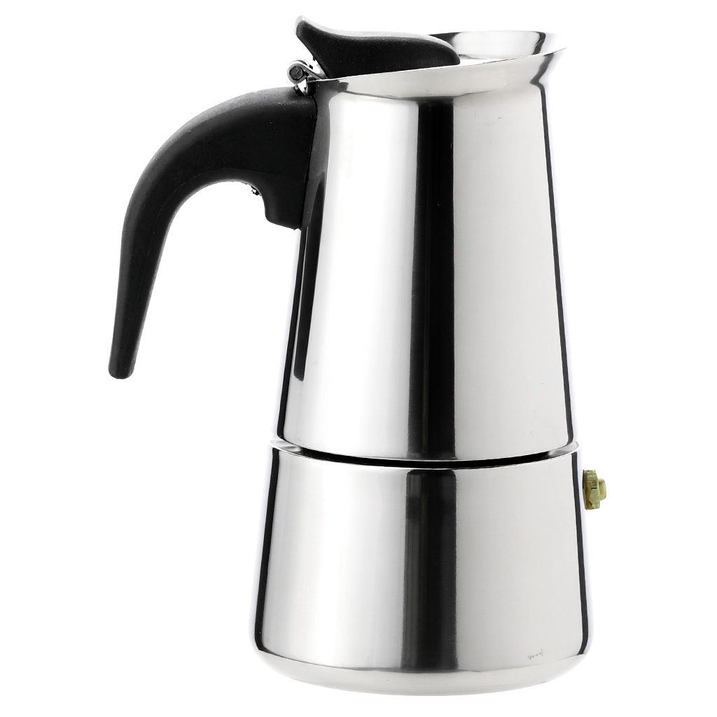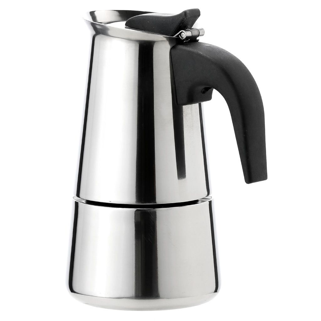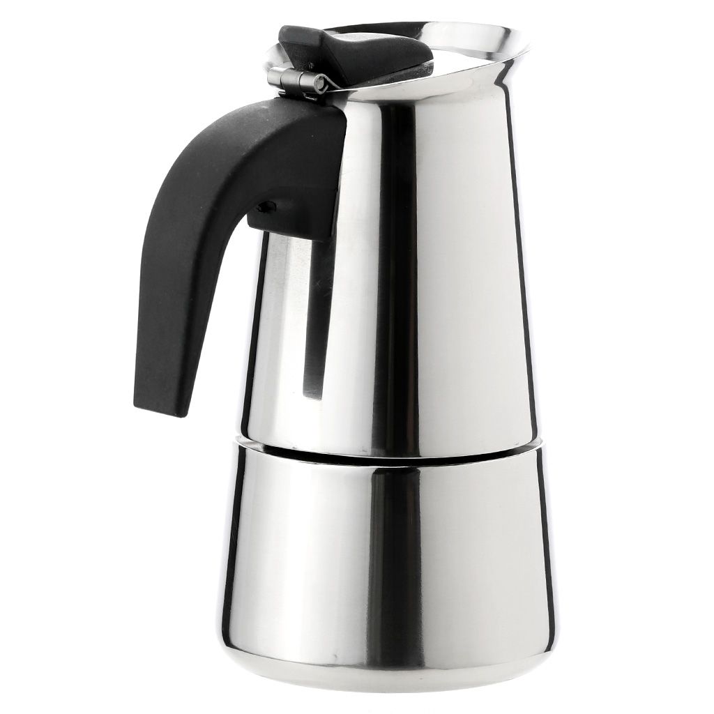 Кофеварка гейзерная конической формы, с пластиковой ручкой.