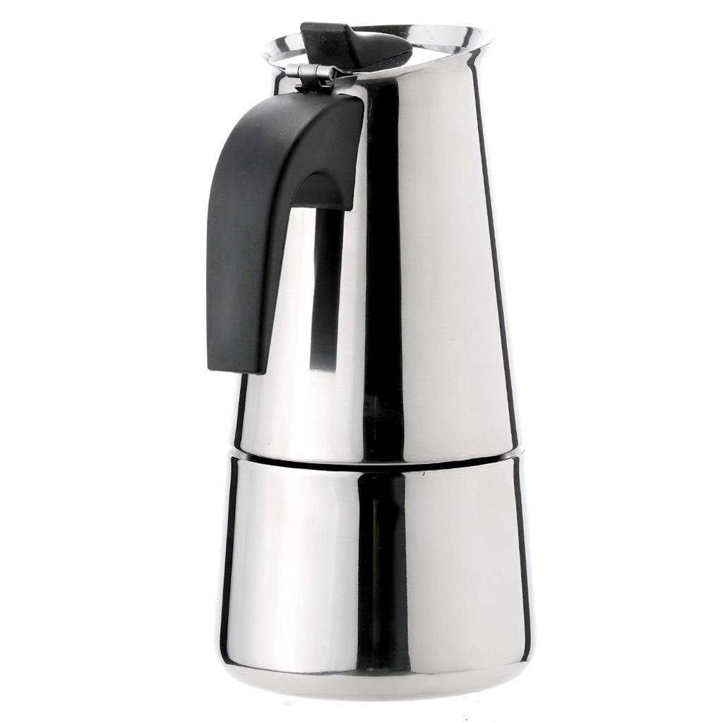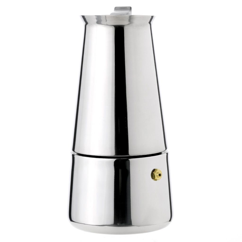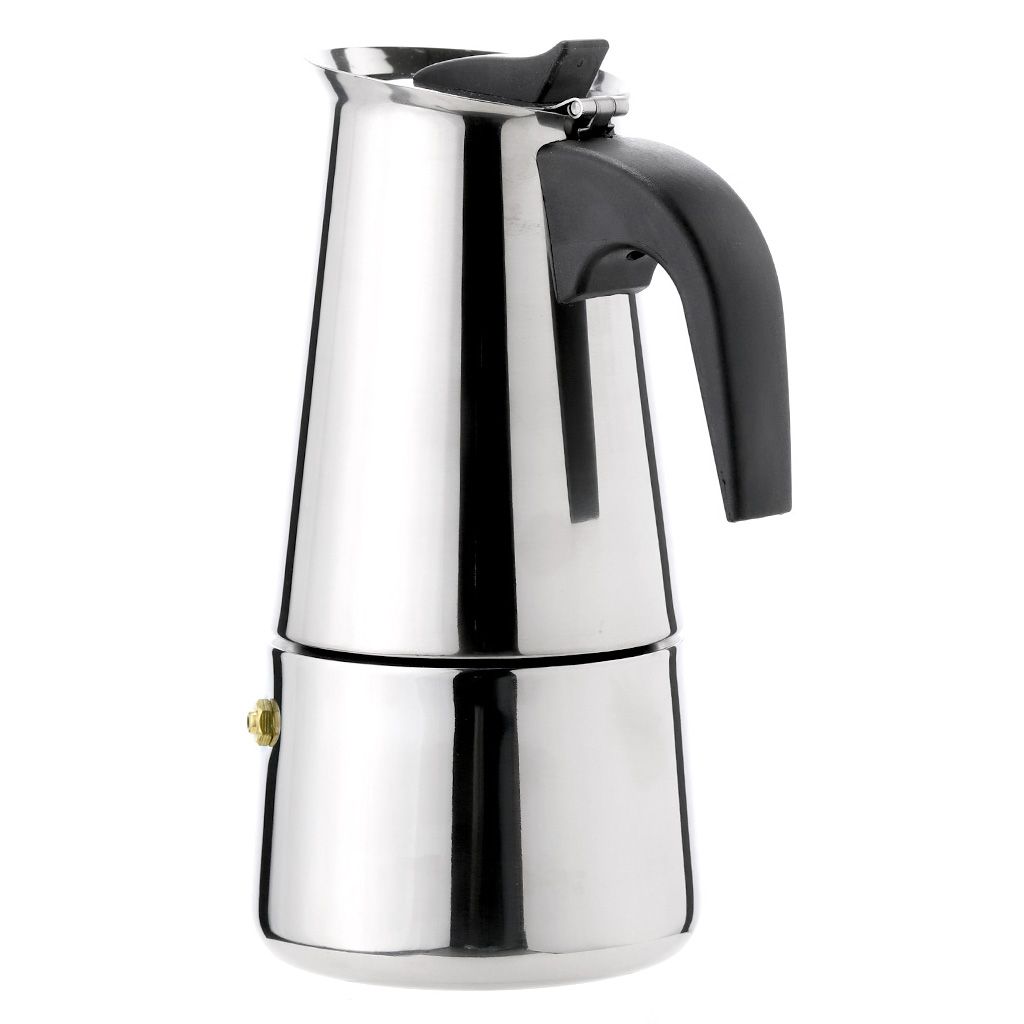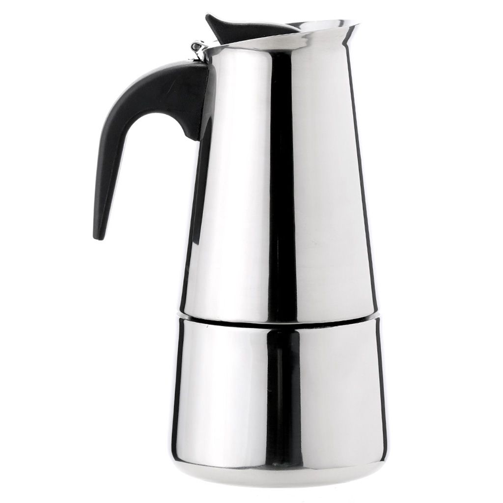 Кофеварка гейзерная конической формы, с пластиковой ручкой.