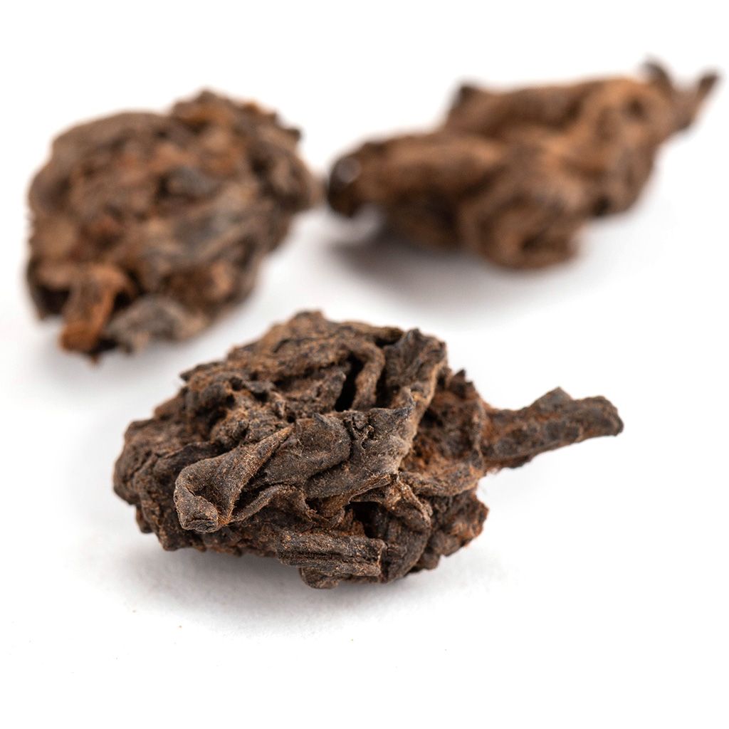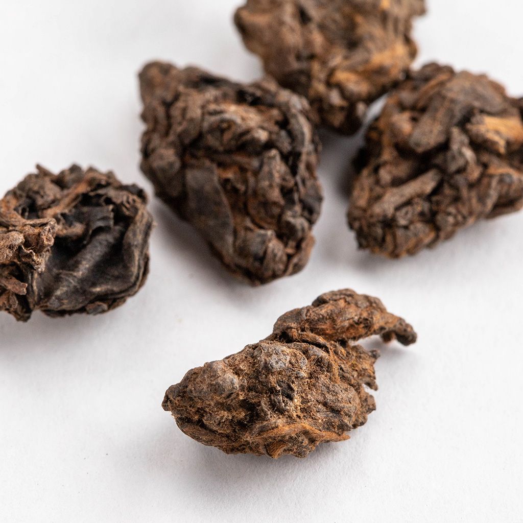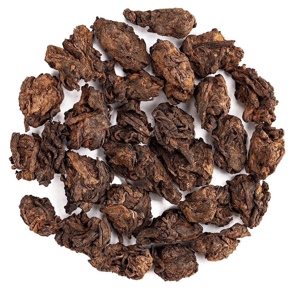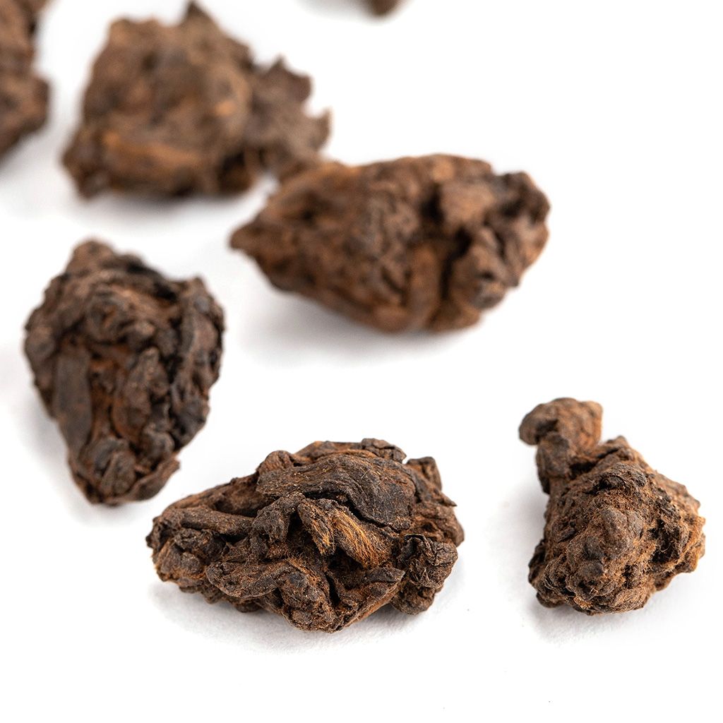Внешний вид этого чайного продукта не слишком привлекательный, однако это никоим образом не сказывается на его вкусовых свойствах. Это спрессованный, комковой чай с ярким, незабываемым ароматом. Чай изготавливается из листьев диких чайных деревьев, произрастающих в китайской провинции Юннань.