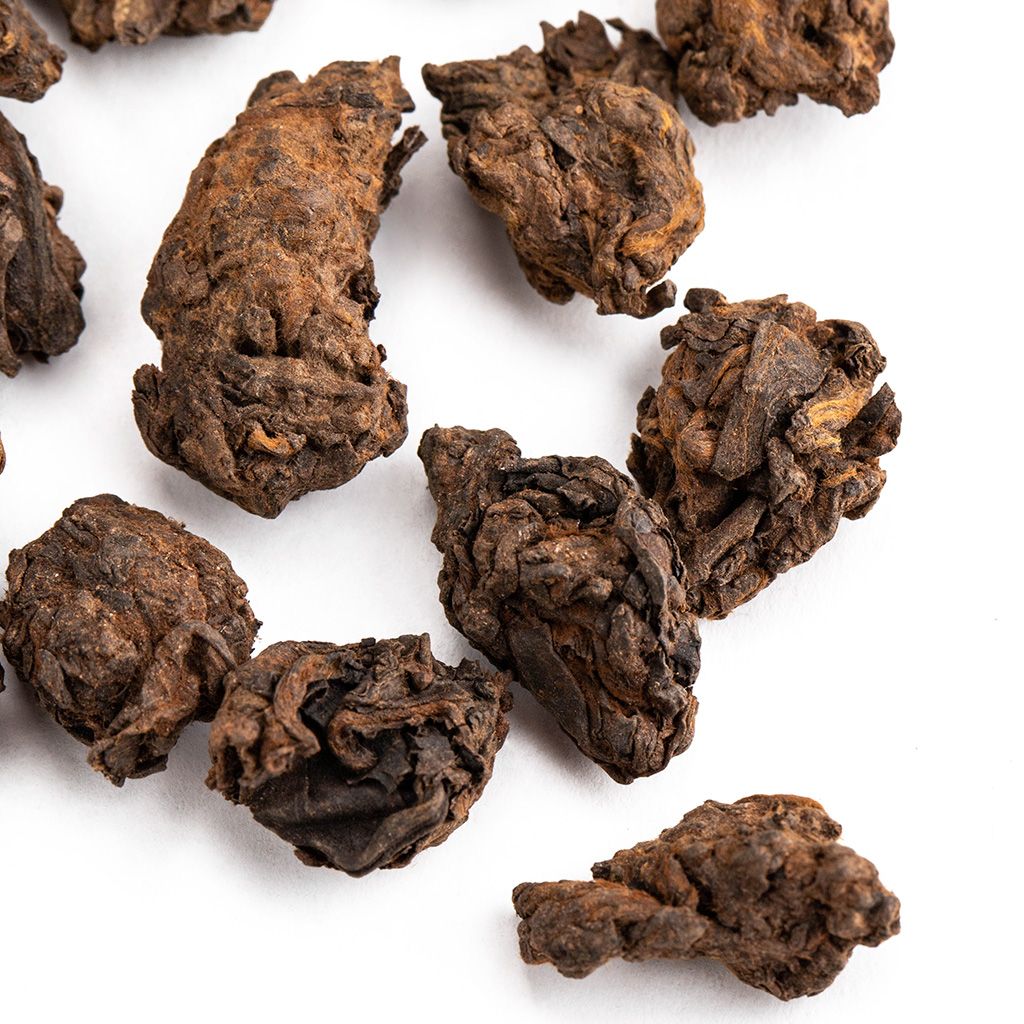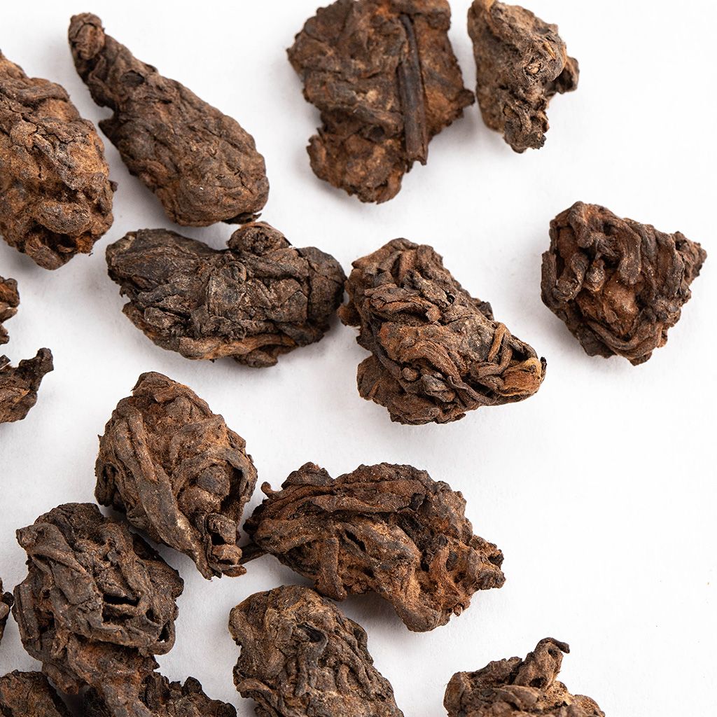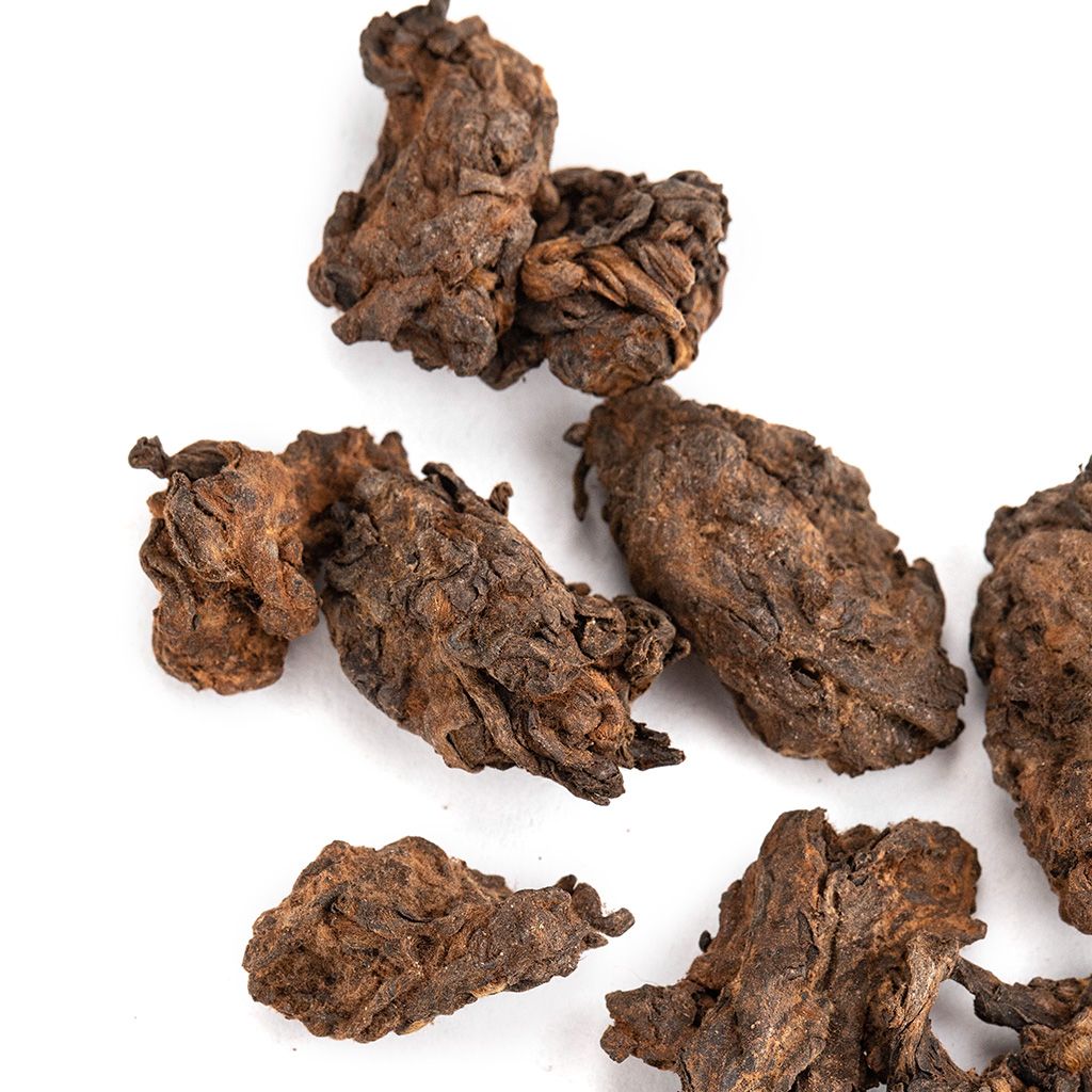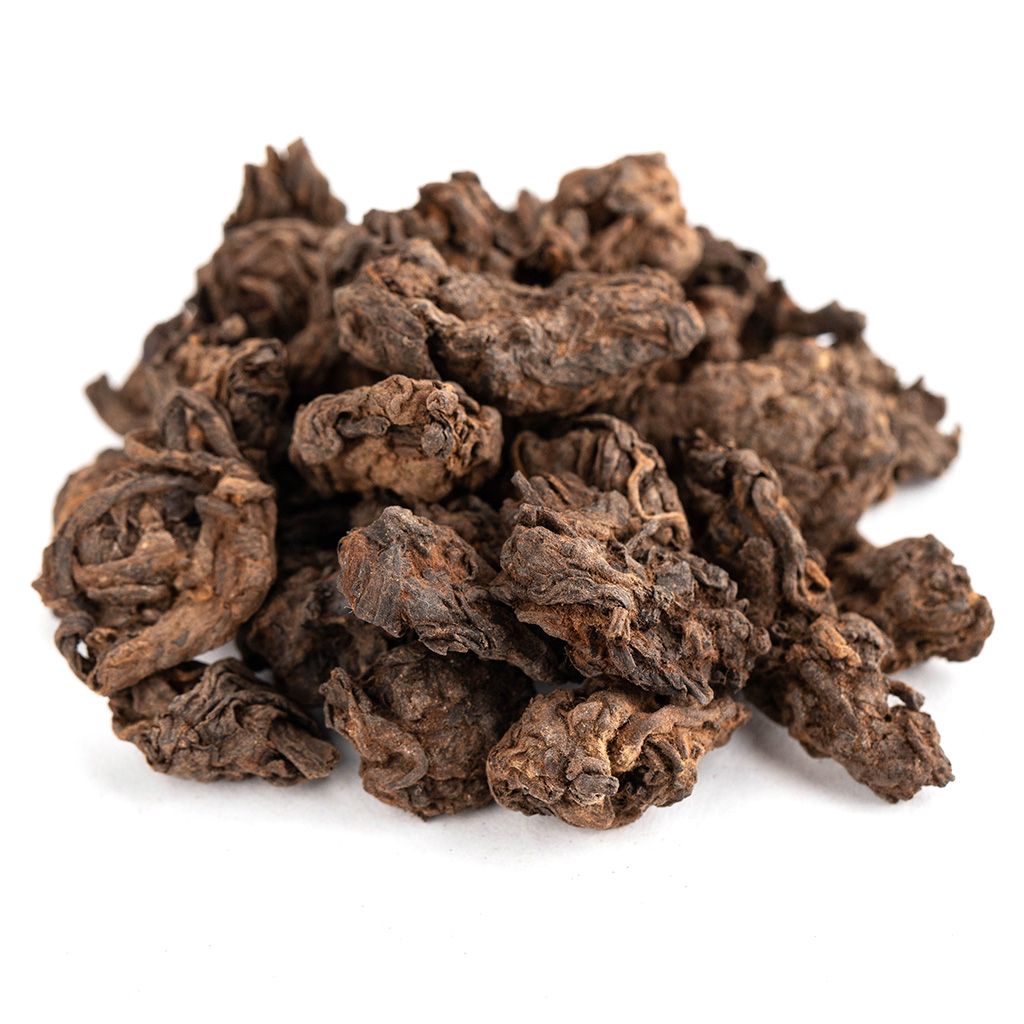 Внешний вид этого чайного продукта не слишком привлекательный, однако это никоим образом не сказывается на его вкусовых свойствах. Это спрессованный, комковой чай с ярким, незабываемым ароматом. Чай изготавливается из листьев диких чайных деревьев, произрастающих в китайской провинции Юннань.
