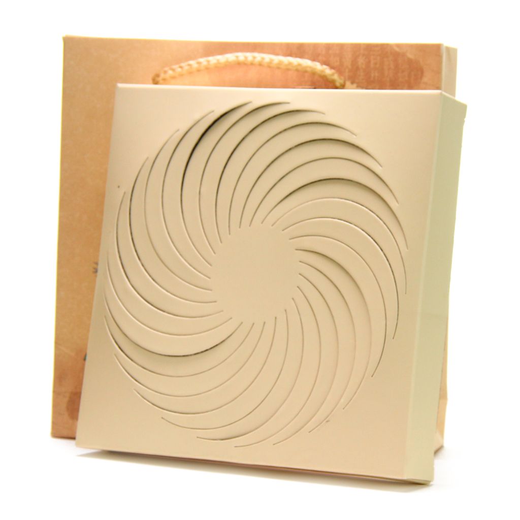 Картонная коробка с ложементом в виде спиральных прорезей под блинчик пуэра 200 г. Упакована в бумажный пакет.