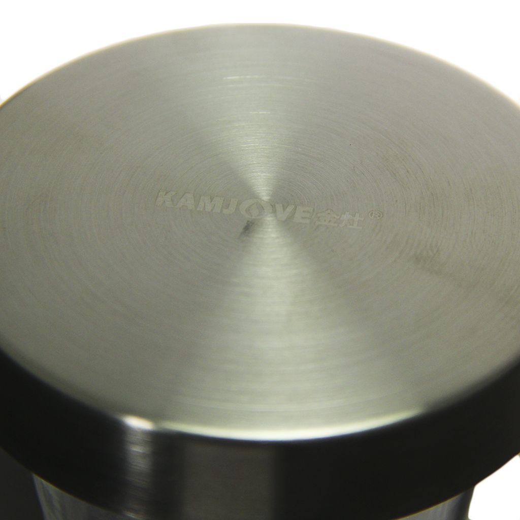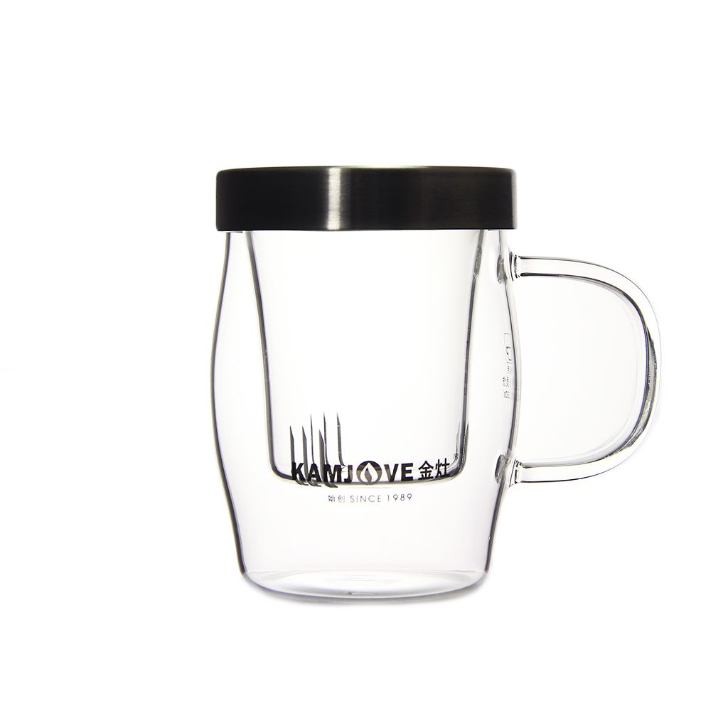Стеклянная чашка плавной сглаженной формы с ручкой прямоугольной сглаженной формы. Внутри стеклянная заварочная колба с силиконовым ободком. С не закручивающейся металлической крышкой