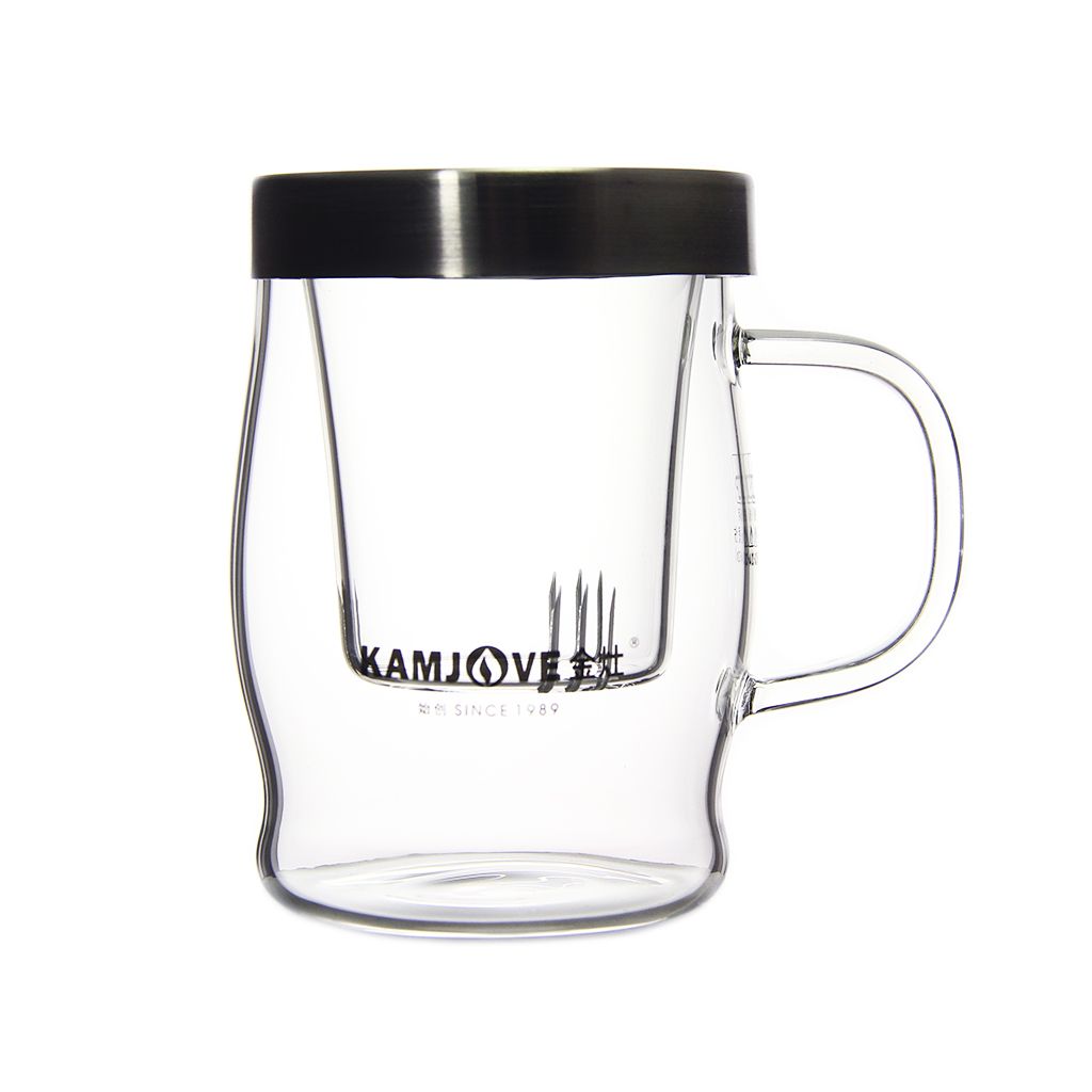 Стеклянная чашка плавной сглаженной формы с ручкой прямоугольной сглаженной формы. Внутри стеклянная заварочная колба с силиконовым ободком. С не закручивающейся металлической крышкой