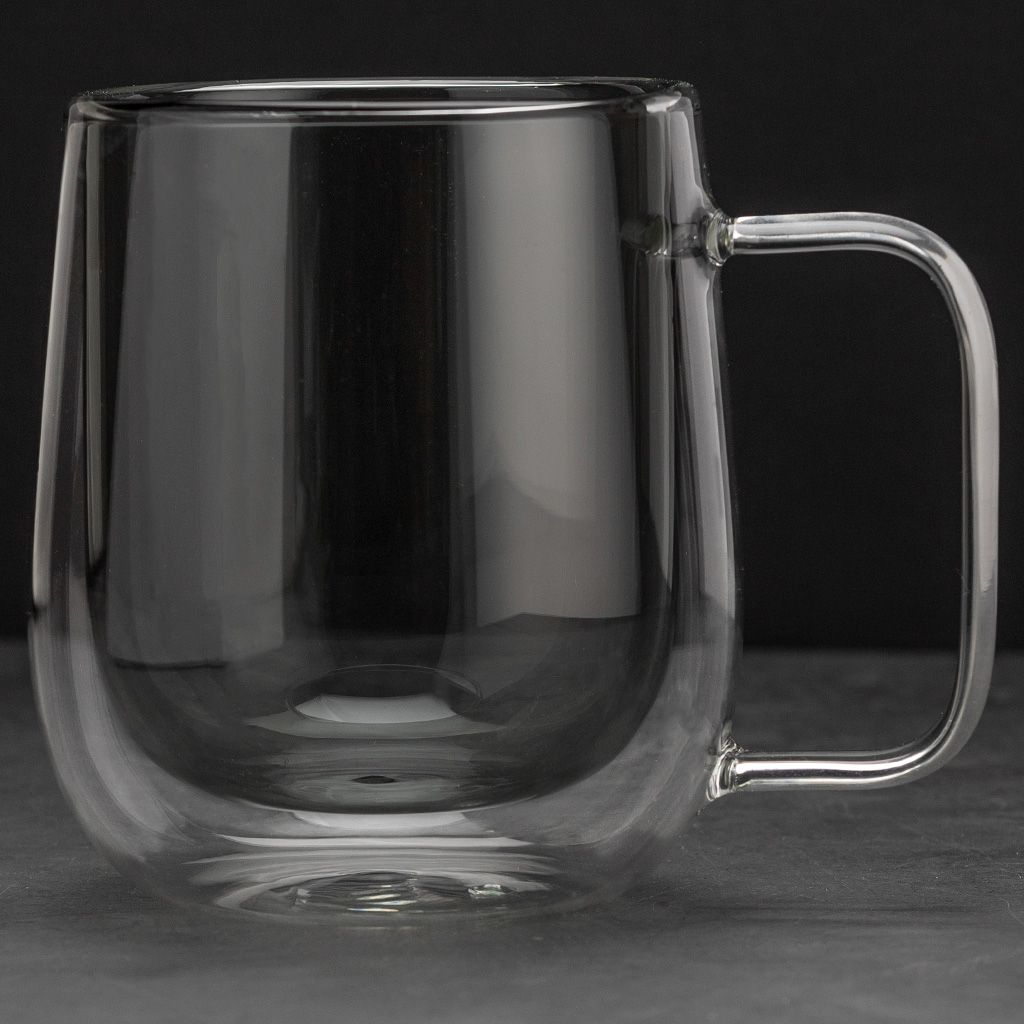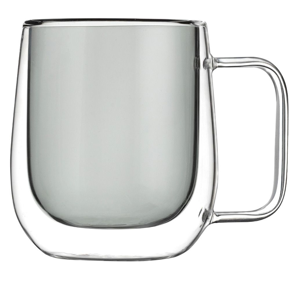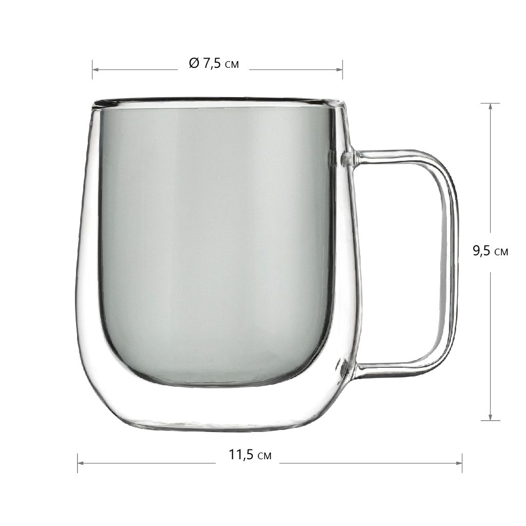 Кружка с двойными стенками объемом 300 мл для чая, кофе и других горячих или холодных напитков. Изделие выполнено из жаростойкого стекла, внутренние стенки графитового цвета.