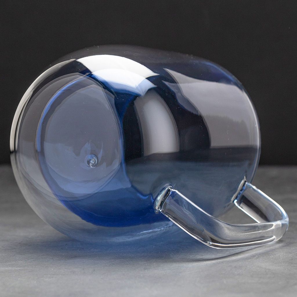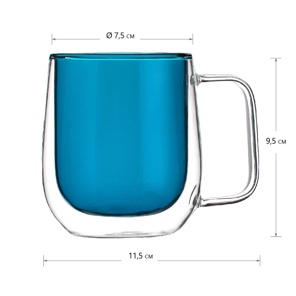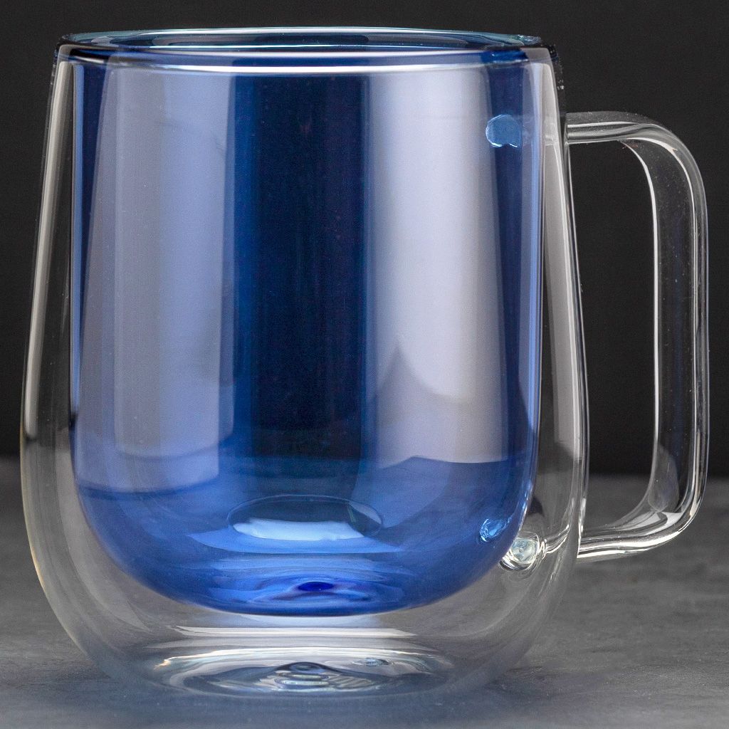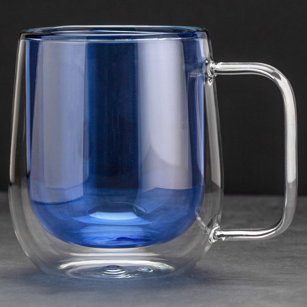 Кружка с двойными стенками объемом 300 мл для чая, кофе и других горячих или холодных напитков. Изделие выполнено из жаростойкого стекла, внутренние стенки синего цвета.