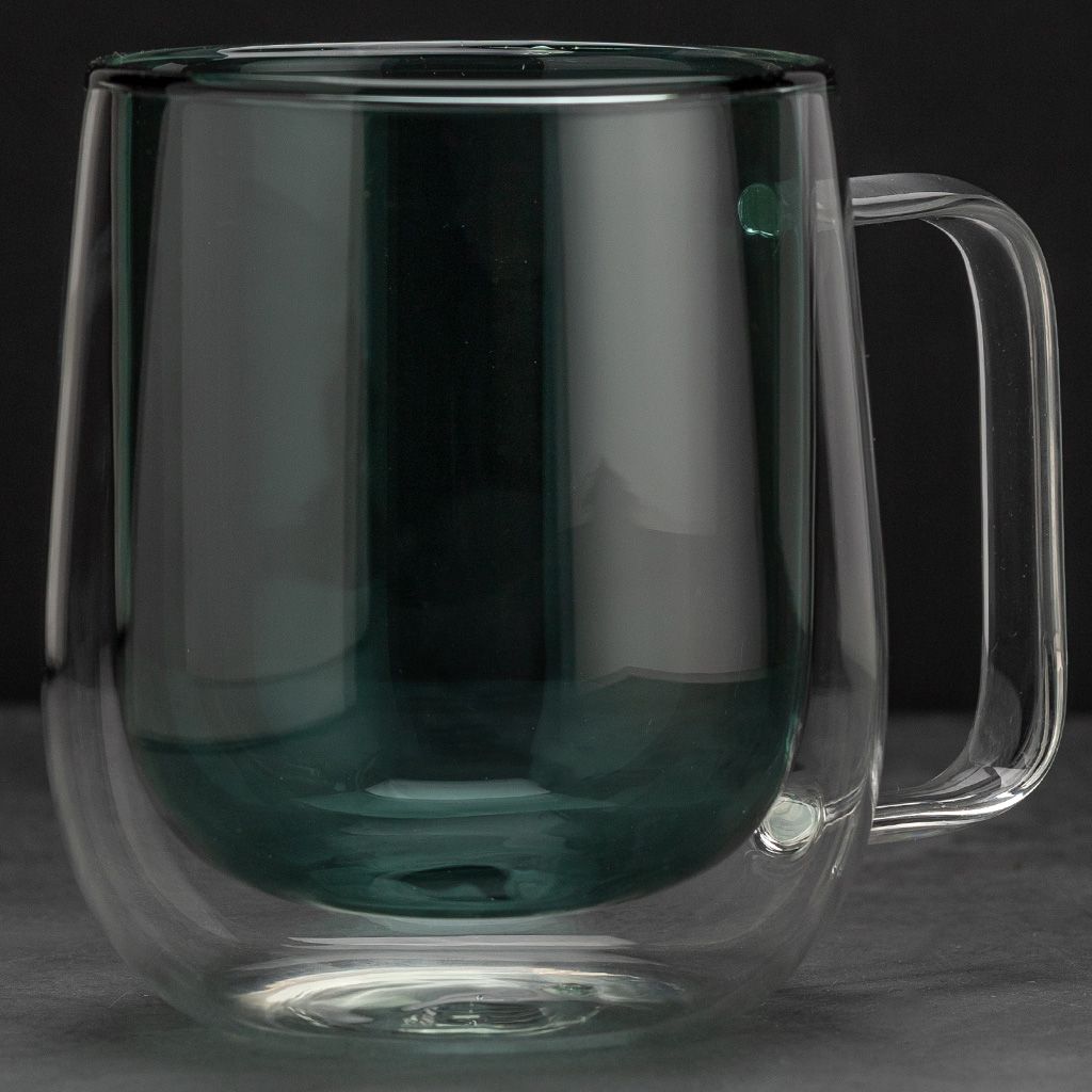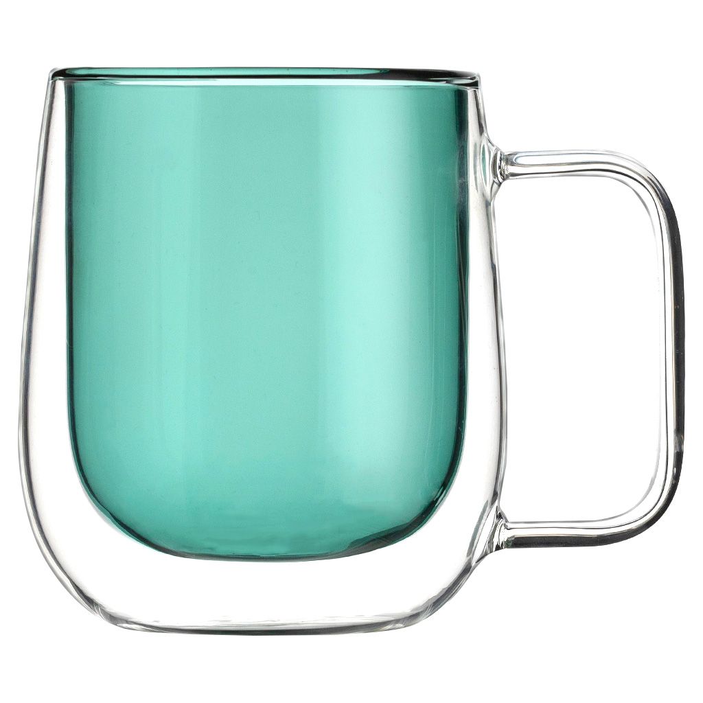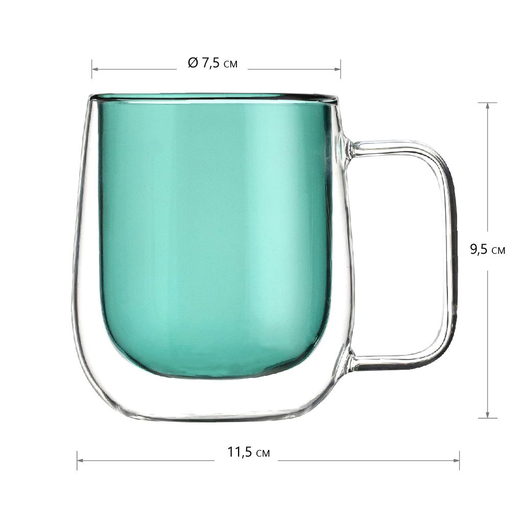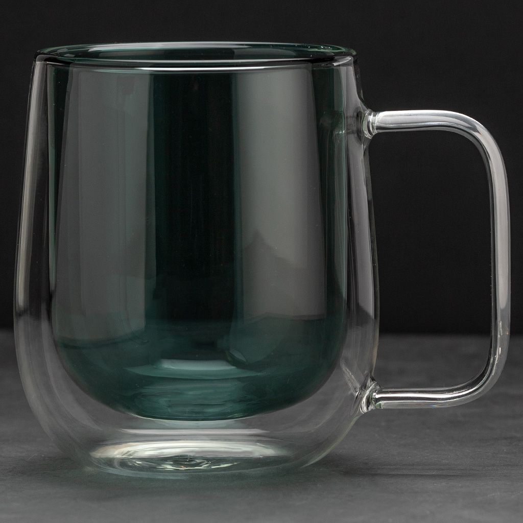 Кружка с двойными стенками объемом 300 мл для чая, кофе и других горячих или холодных напитков. Изделие выполнено из жаростойкого стекла, внутренние стенки зеленого цвета.