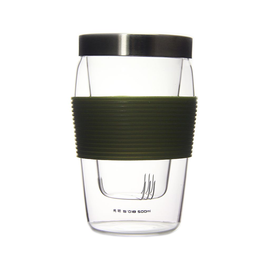 Высокая стеклянная кружка плавной конической, слегка расширяющейся в верхней трети, формы, плотно охватывается силиконовой накладкой, которая не позволит выскользнуть чашке из рук и уберегает от обжигания. Внутри стеклянная заварочная колба с силиконовым ободком. С не закручивающейся металлической крышкой