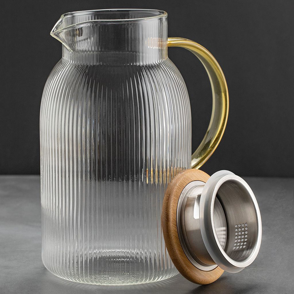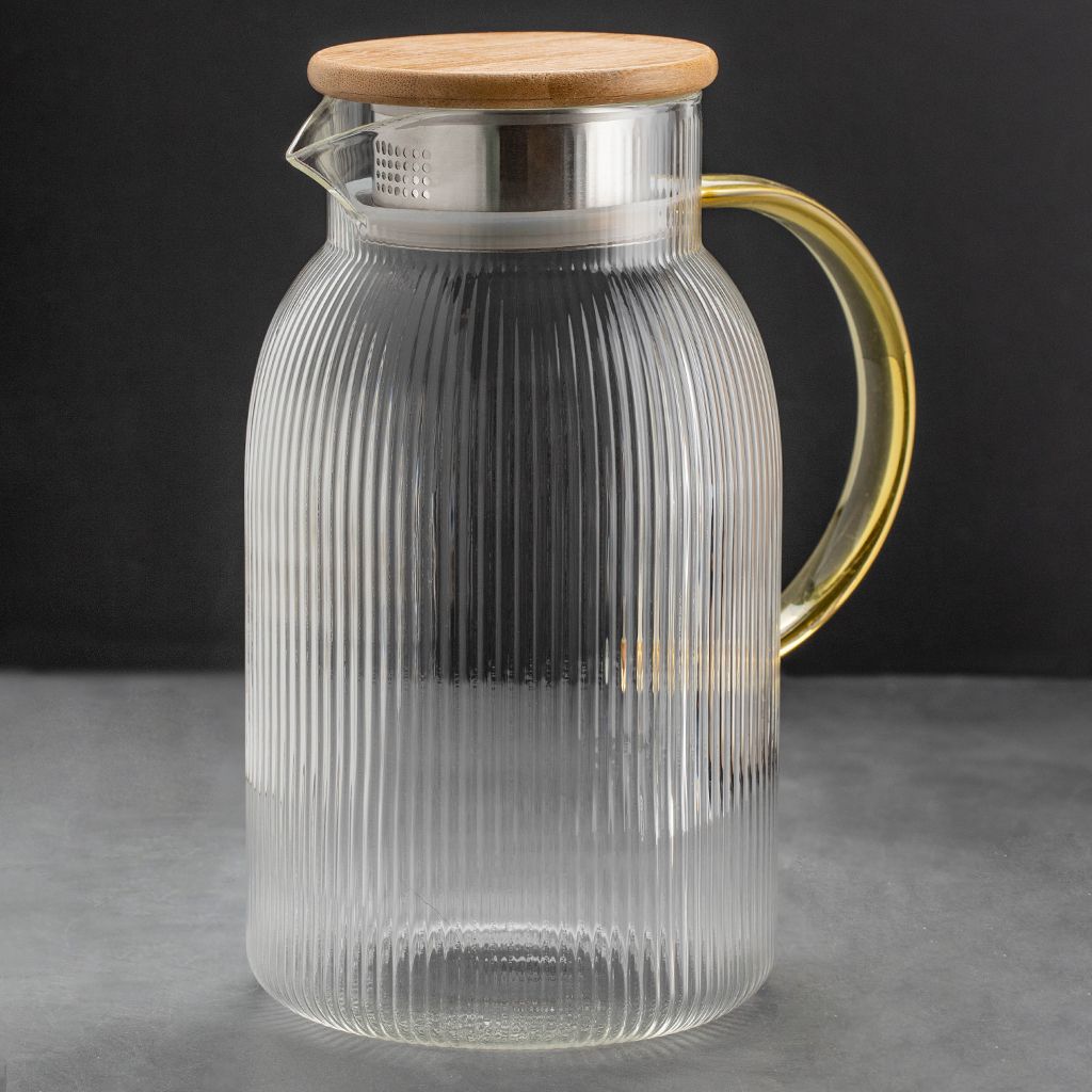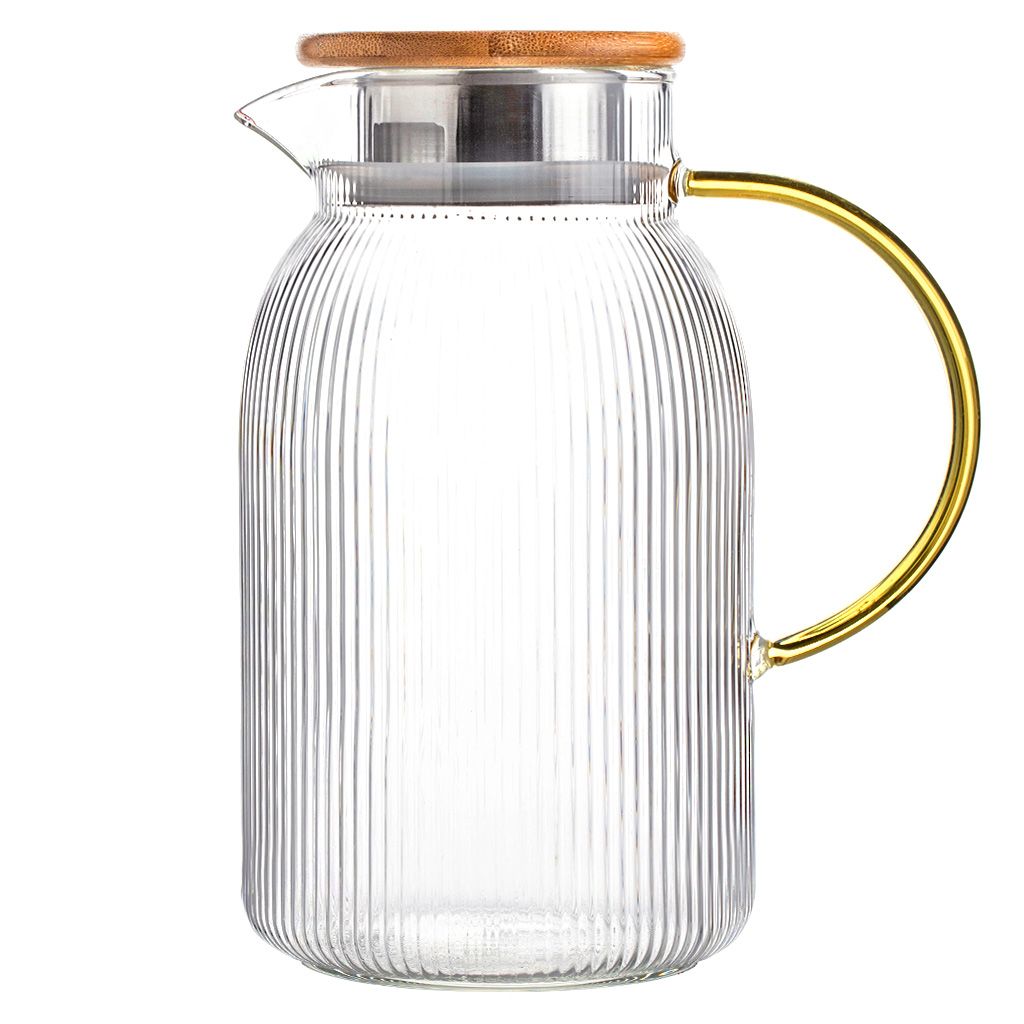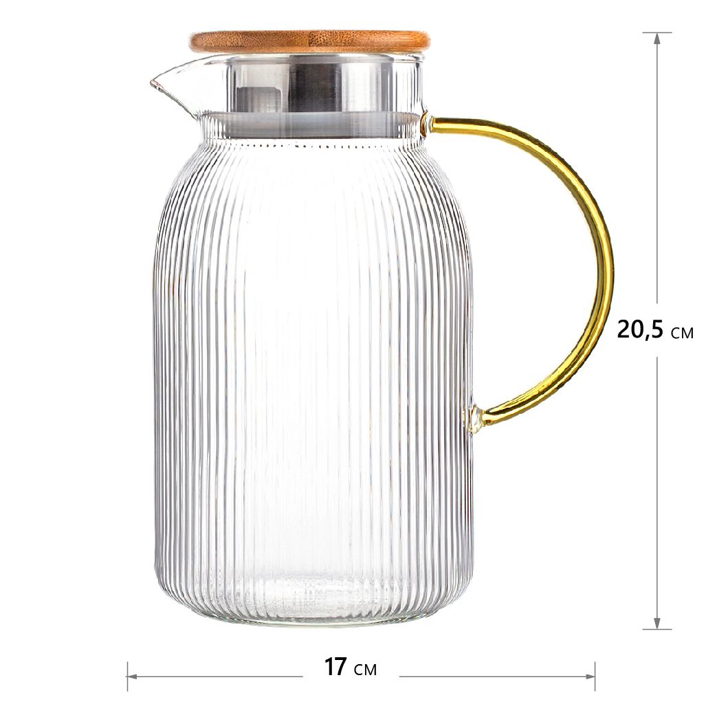 Дизайнерский кувшин Аристократ станет оригинальным украшением вашего стола. Фактурное стекло выглядит эффектно, а золотой оттенок ручки придает силуэту аристократический характер. Чайник изготовлен из прочного термостойкого стекла. Вы можете использовать данную модель как для холодных, так и для согревающих напитков. Лимонады, чай и чайные напитки, морсы, соки, вода, коктейли, глинтвейн - это лишь часть вариаций, которыми вы можете удивить свою семью, друзей, детей или коллег. Если вы ищете подарок на новоселье, день рождения, годовщину, свадьбу, День матери или по любому другому случаю, фактурный кувшин для напитков станет отличным вариантом.