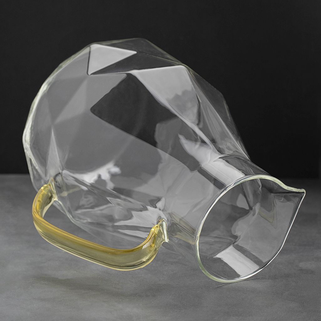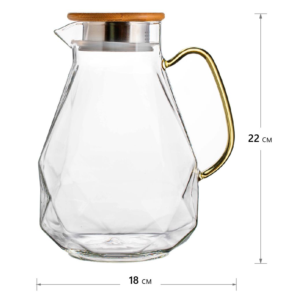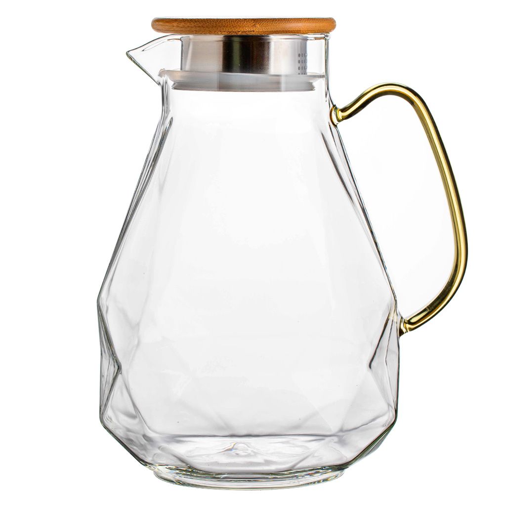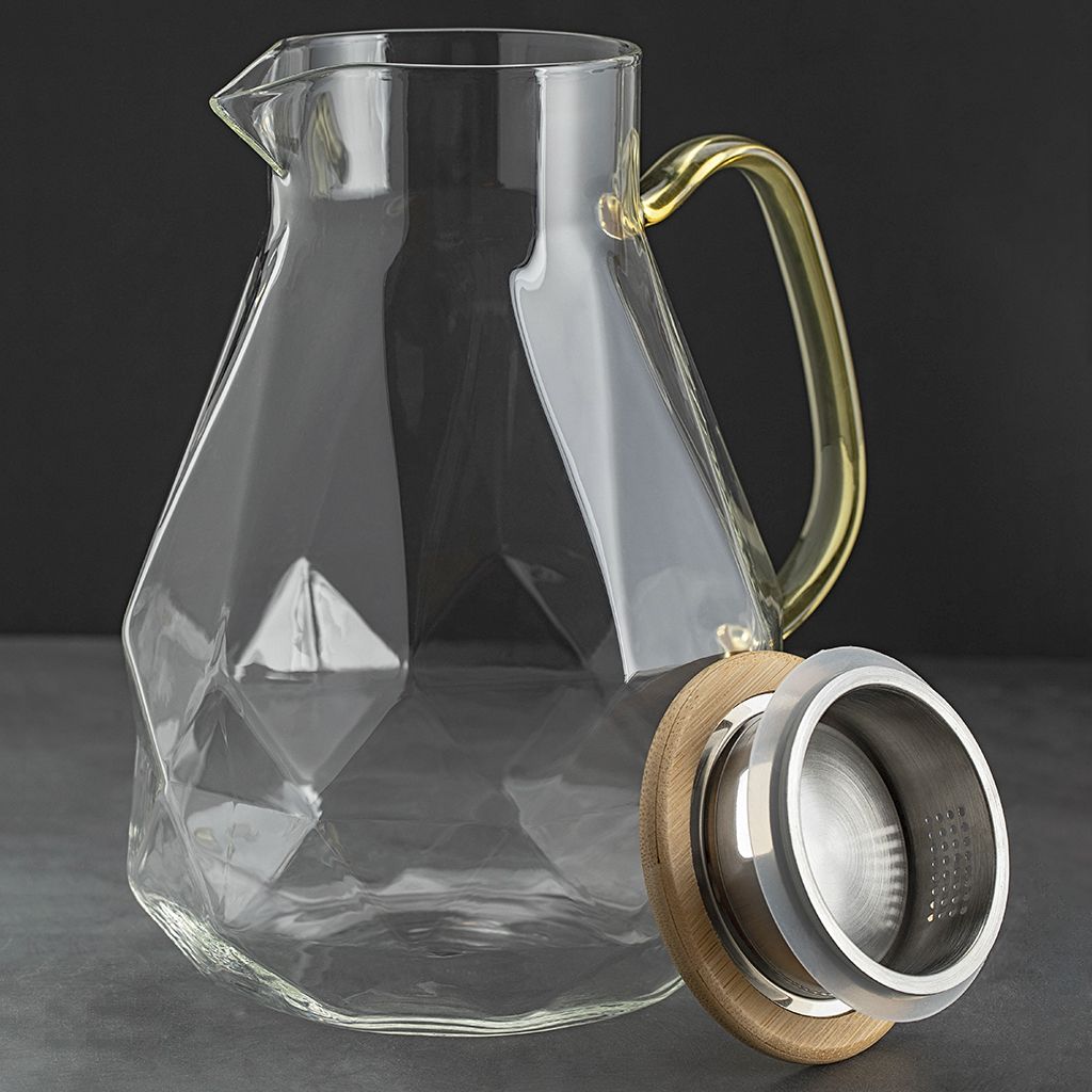 Дизайнерский кувшин Бриллиант станет оригинальным украшением вашего стола. Фактурное стекло выглядит эффектно, а золотой оттенок ручки придает силуэту аристократический характер. Чайник изготовлен из прочного термостойкого стекла. Вы можете использовать данную модель как для холодных, так и для согревающих напитков. Лимонады, чай и чайные напитки, морсы, соки, вода, коктейли, глинтвейн - это лишь часть вариаций, которыми вы можете удивить свою семью, друзей, детей или коллег. Если вы ищете подарок на новоселье, день рождения, годовщину, свадьбу, День матери или по любому другому случаю, фактурный кувшин для напитков станет отличным вариантом.