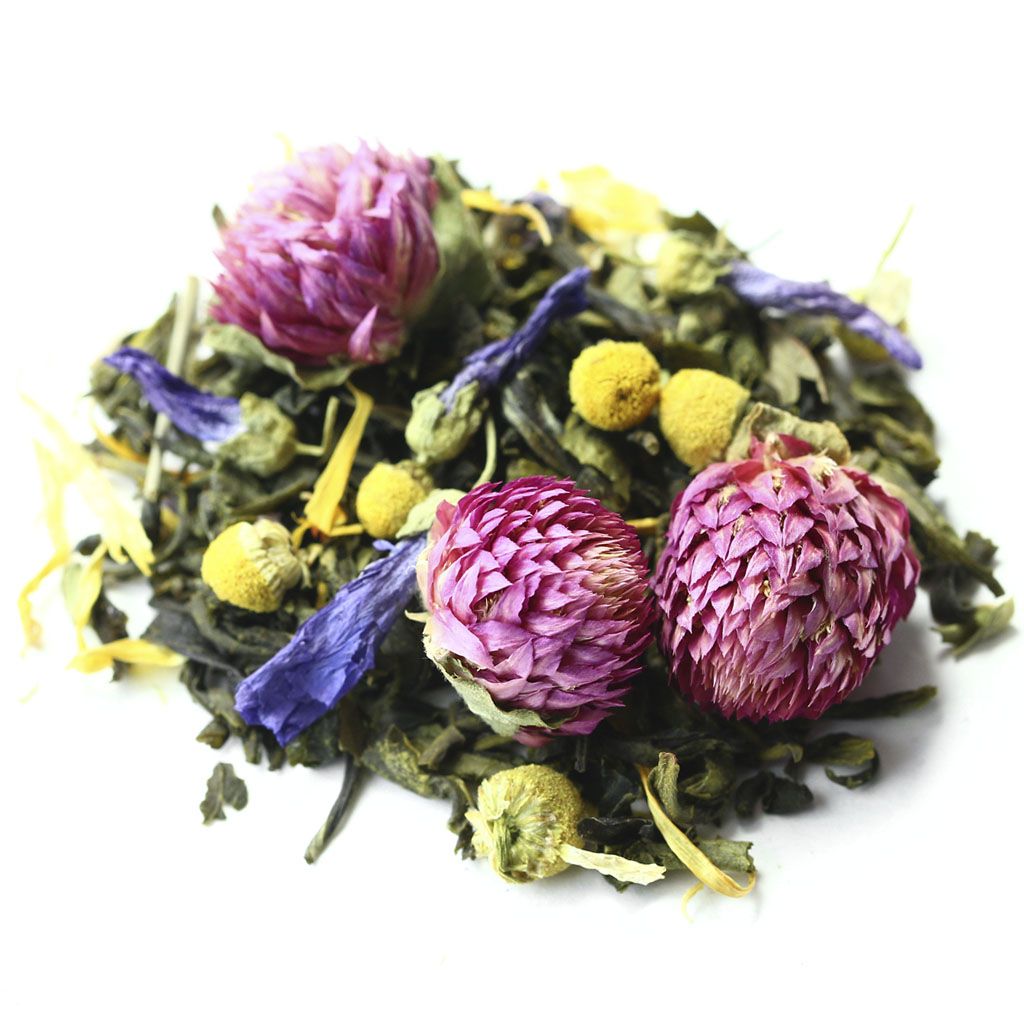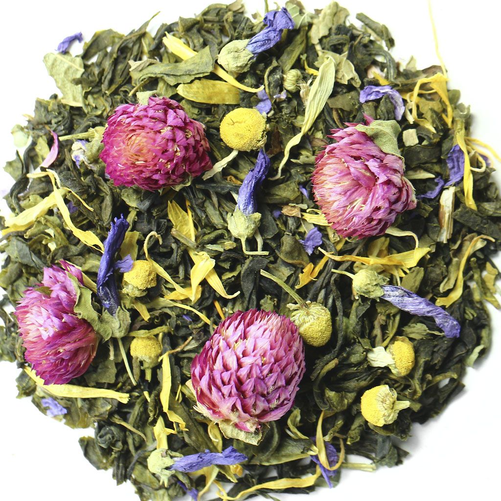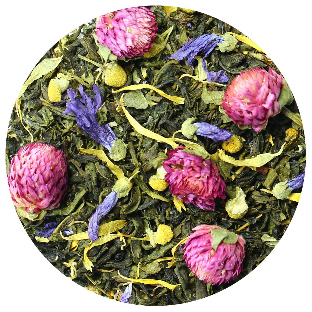 Чай зеленый китайский крупнолистовой, чай зеленый китайский Ганпаудер, листья мяты, цветы клевера, цветы ромашки, цветы мальвы, лепестки календулы, мелисса, листья черной смородины, аромат цветущего луга.