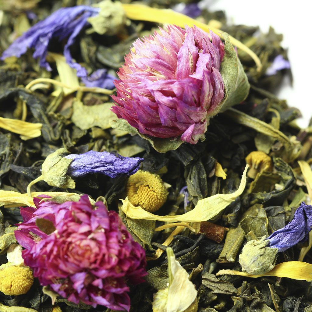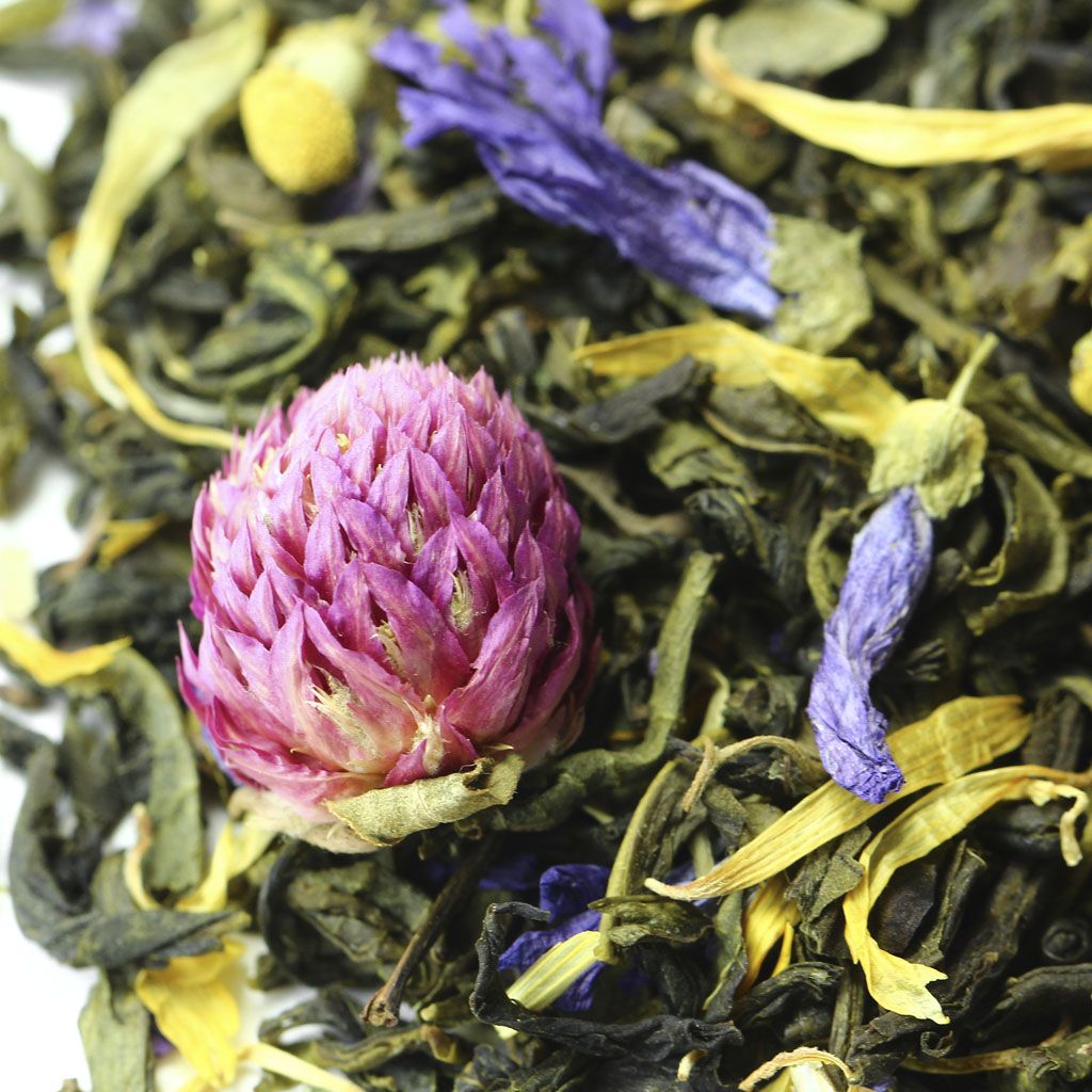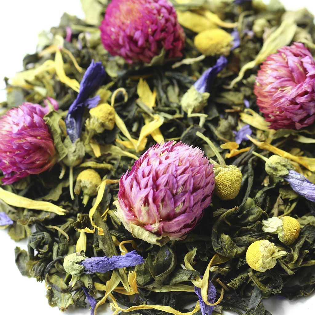 Шарики зеленого чая Ганпаудер в сочетании с крупнолистовым зеленым чаем, выглядят гармонично на фоне крупных сиреневых цветков клевера и желтых ромашек.