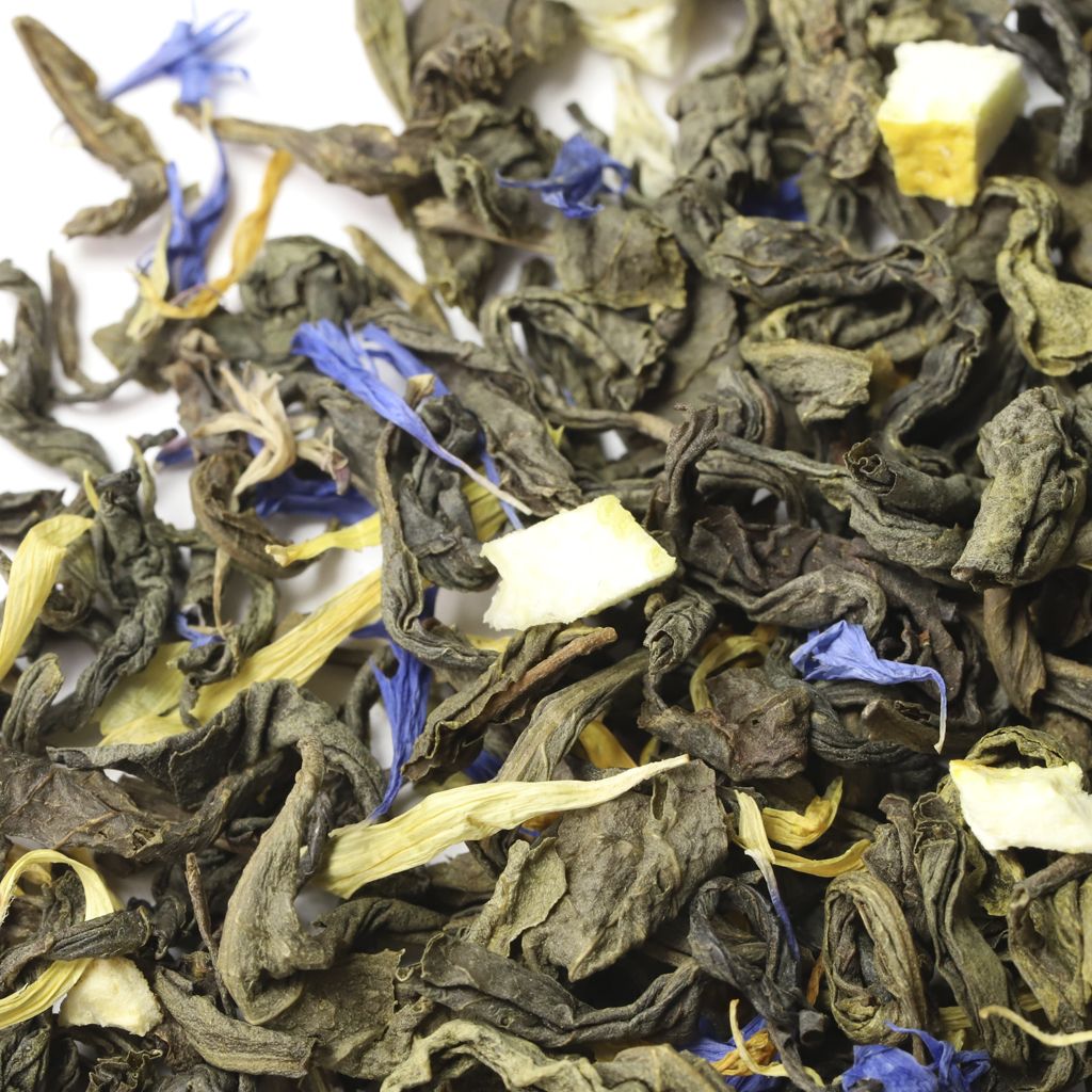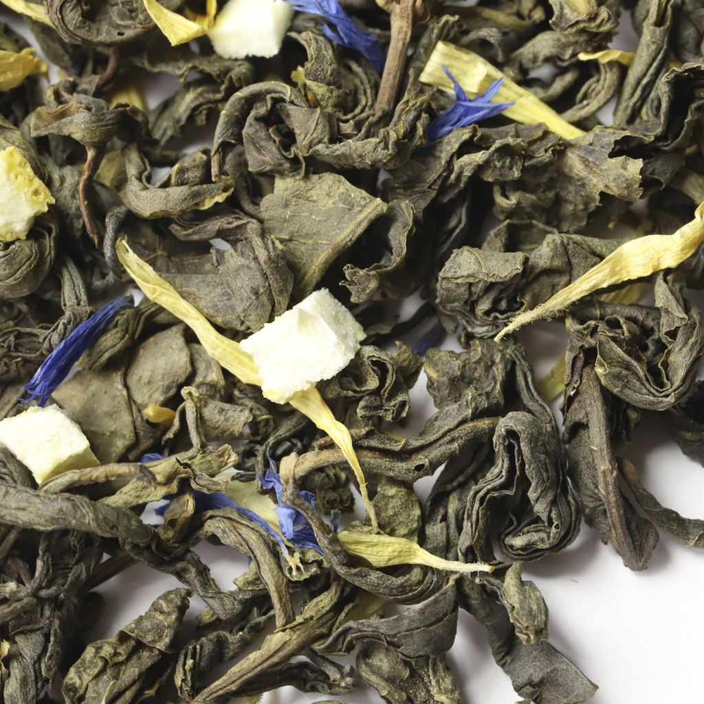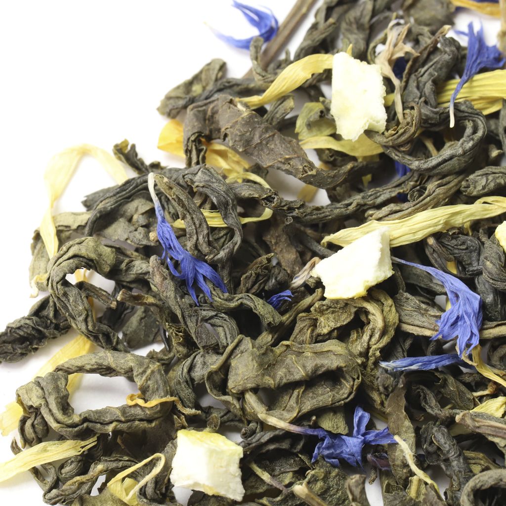 Чай зеленый китайский крупнолистовой, цедра лимона, листья мяты, лепестки василька синего, лепестки календулы, аромат лимона и перечной мяты.