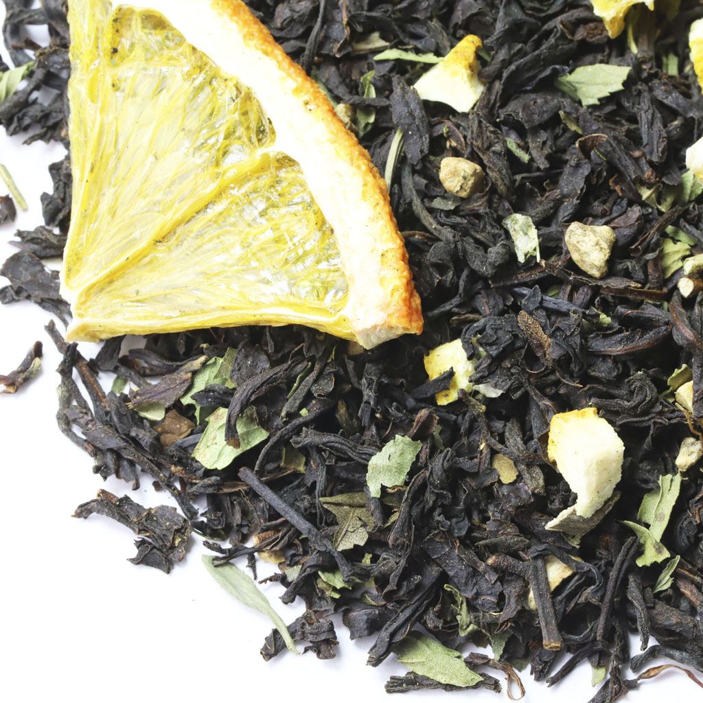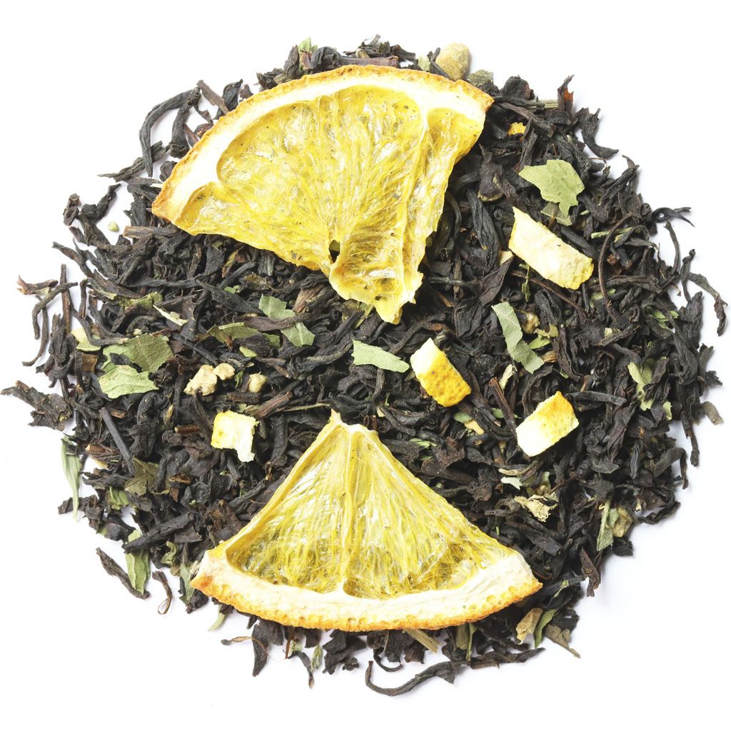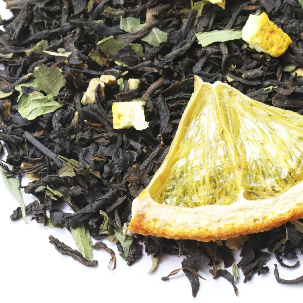 Необычное сочетание ментоловой прохлады мяты, пикантного согревающего имбиря и дольки апельсина восхитительно ощущаются на основе базового вкуса цейлонского высокогорного черного чая.