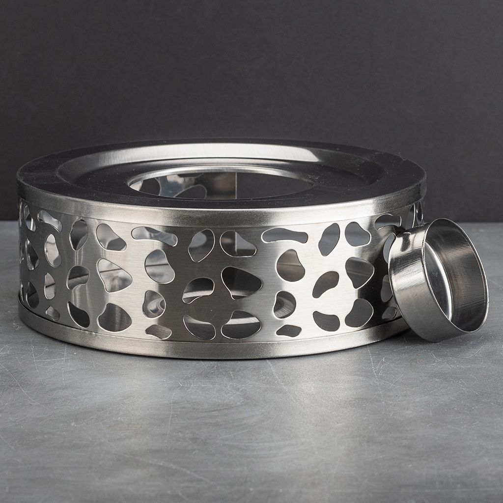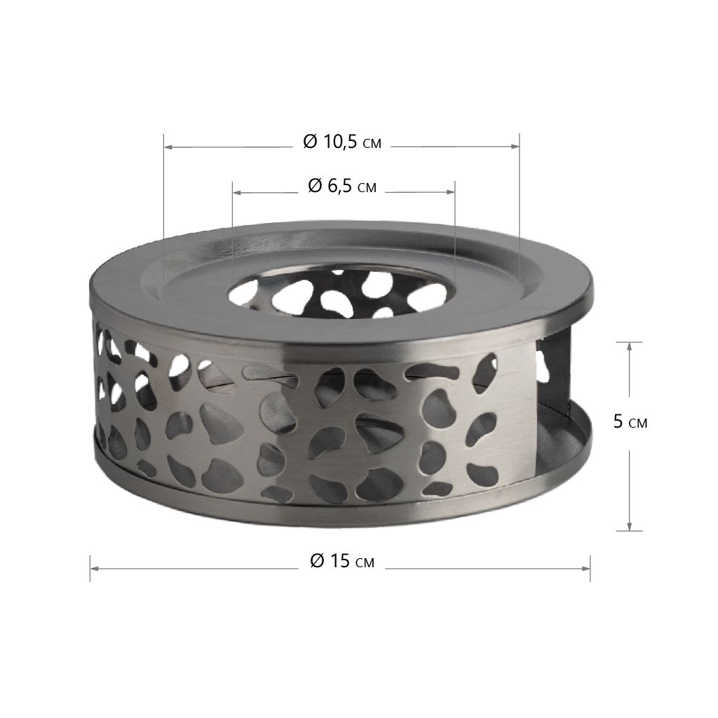 Металлическая горелка круглой формы, с отверстиями по боковой поверхности, высотой 5 см, диаметр основания 15 см. В комплект входит алюминиевая гильза для свечки.