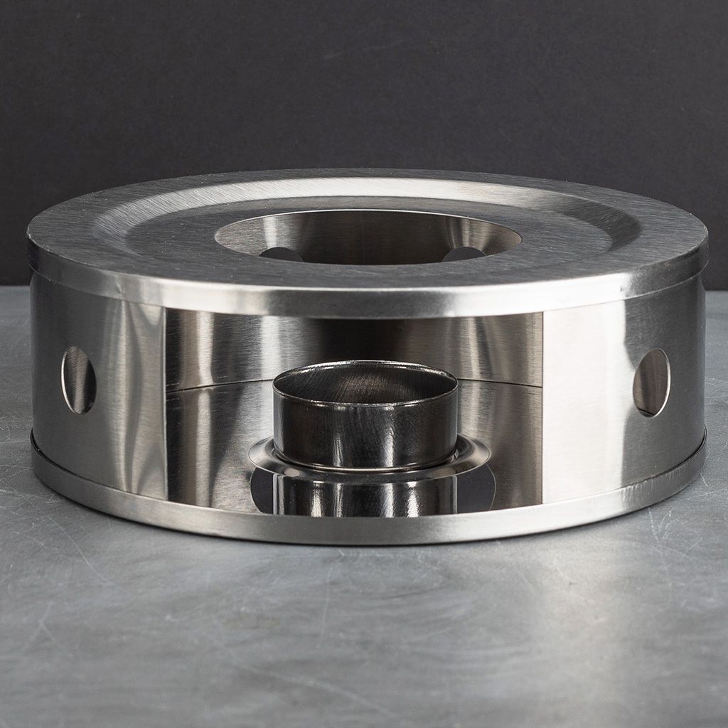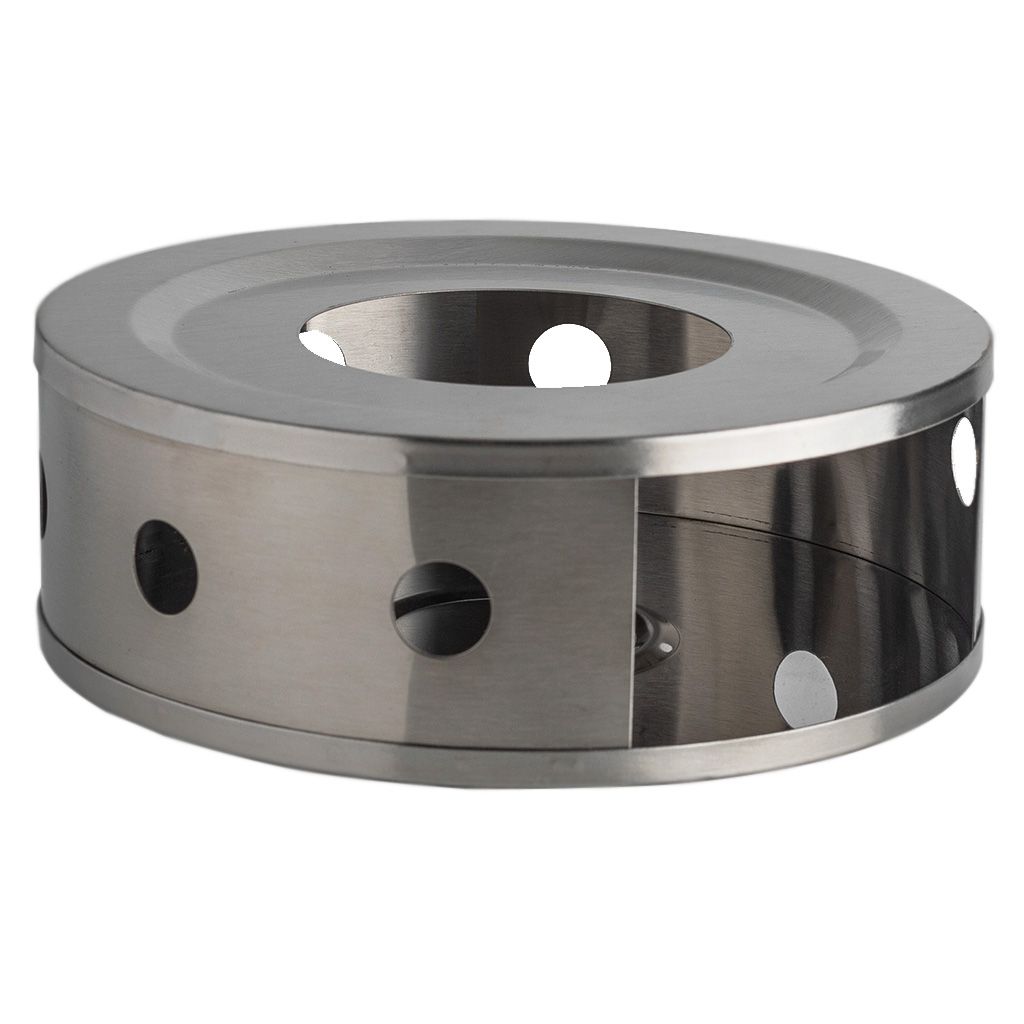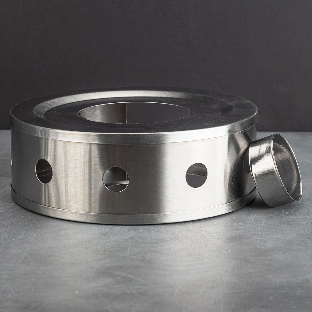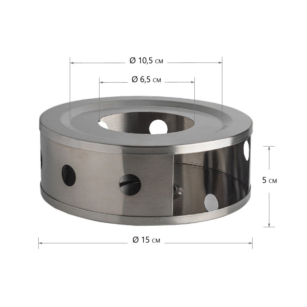 Металлическая горелка круглой формы, с отверстиями по боковой поверхности, высотой 5 см, диаметр основания 15 см. В комплект входит алюминиевая гильза для свечки.