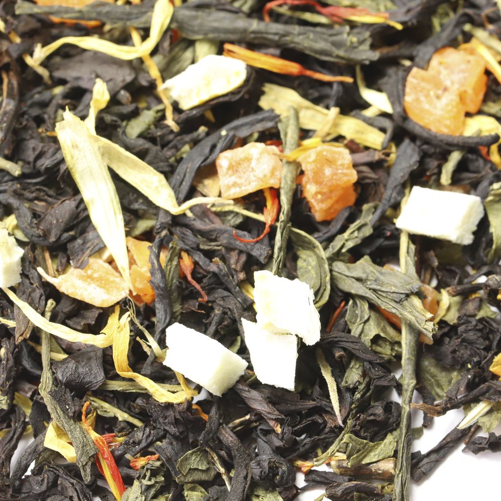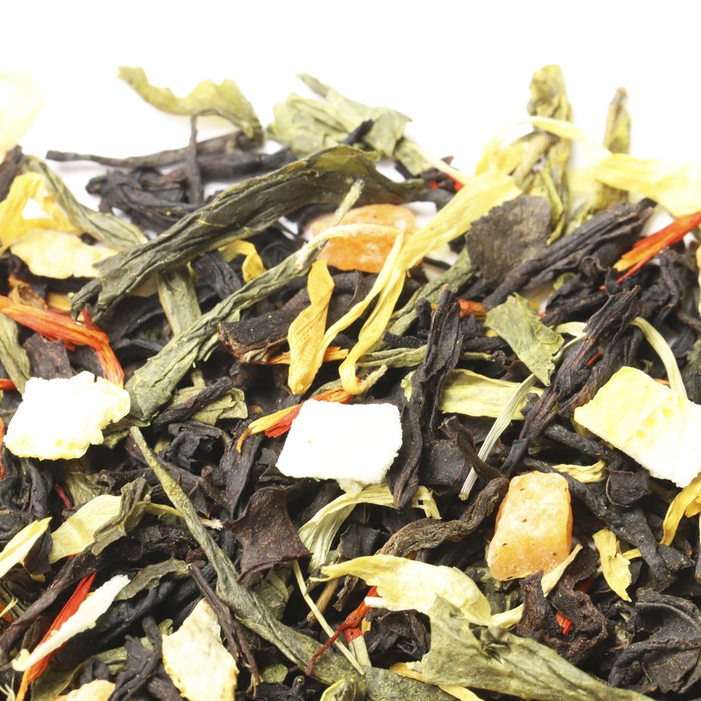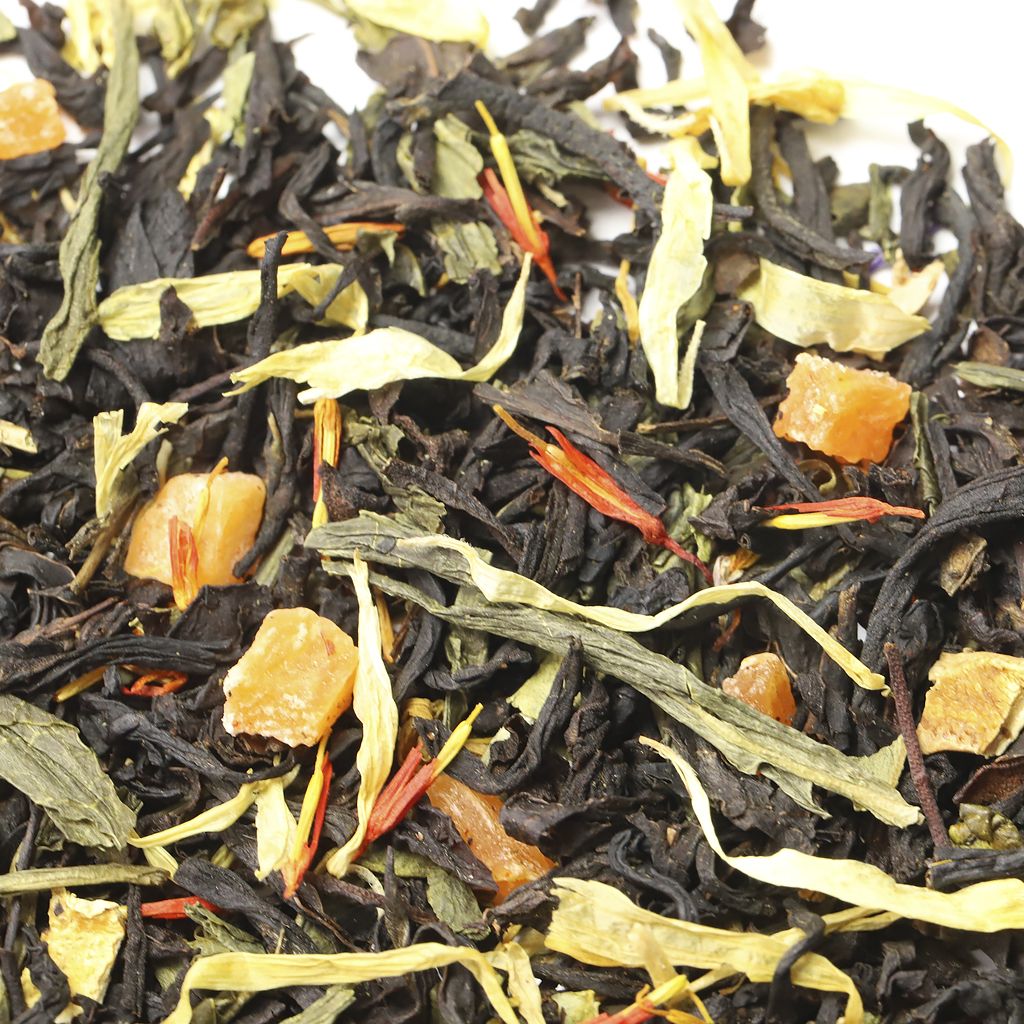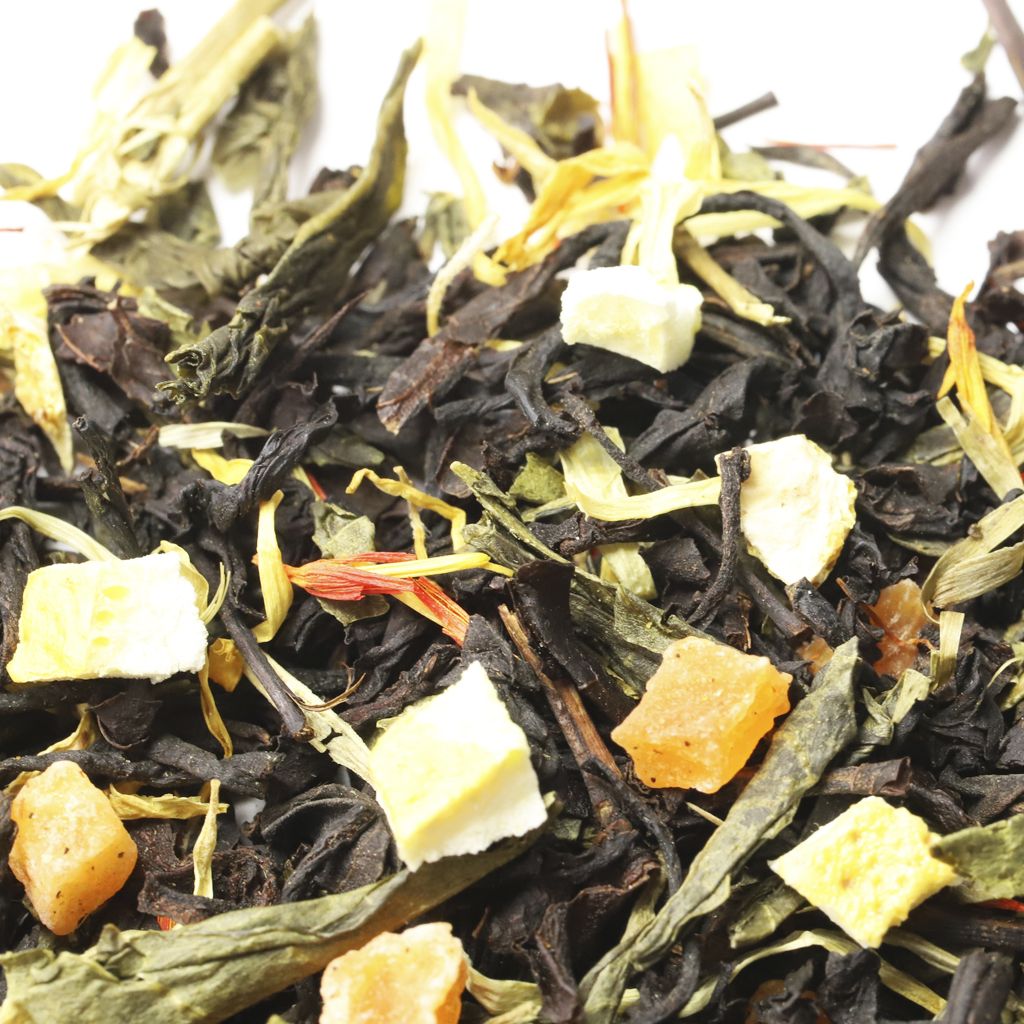 Чай черный индийский ассам, чай зеленый китайский сенча, кусочки ананаса, цедра лимона, лепестки календулы, лепестки сафлора, аромат дикого персика.