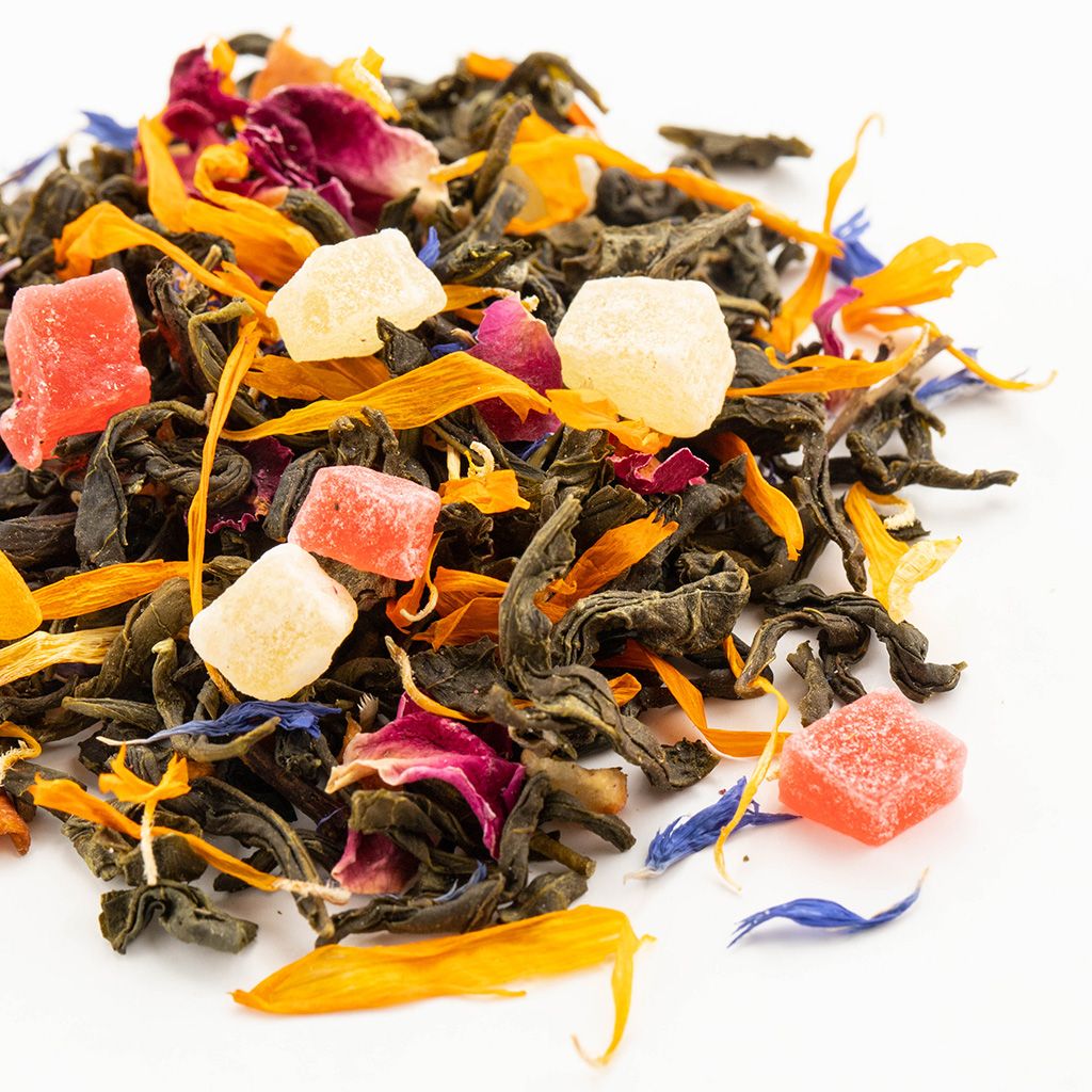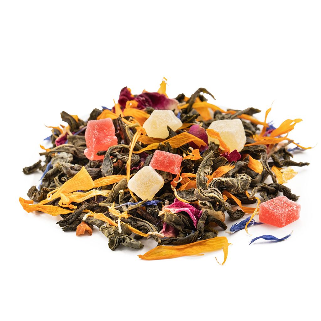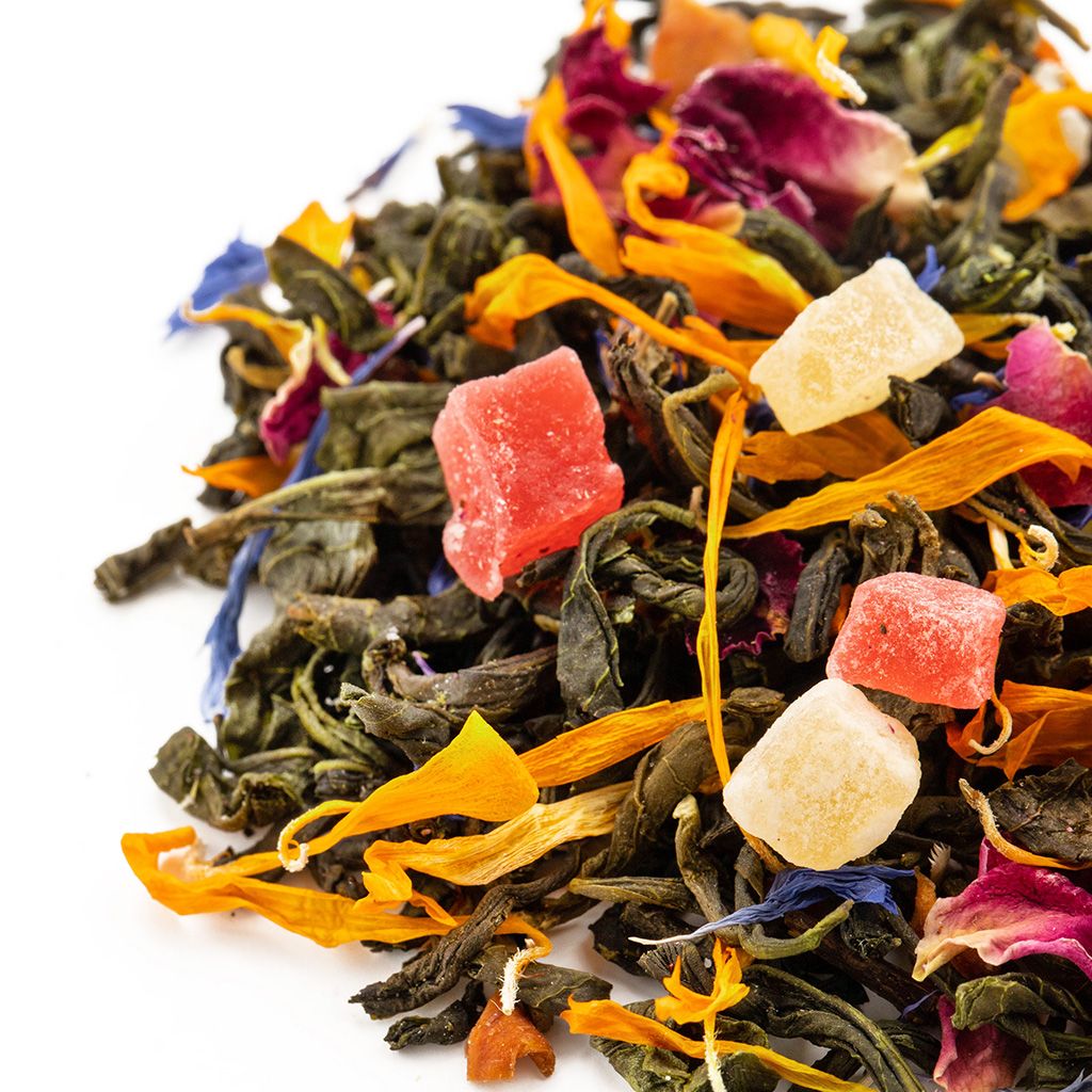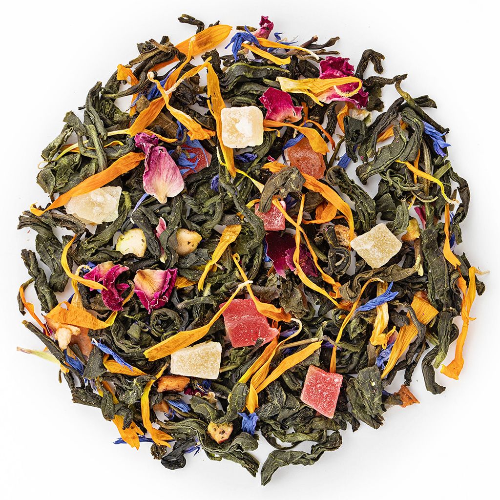 Яркий эффектный купаж на основе зеленого китайского чая с кусочками ананаса, папайи и яблок дополнен лепестками красной розы, календулы и василька.