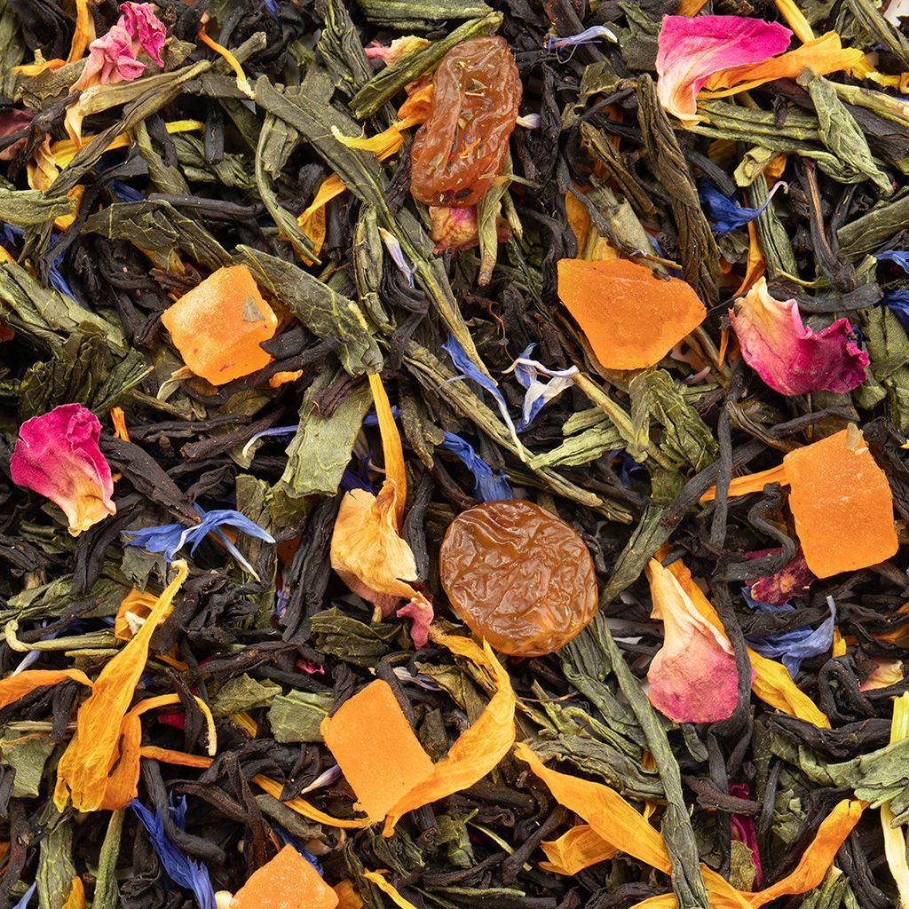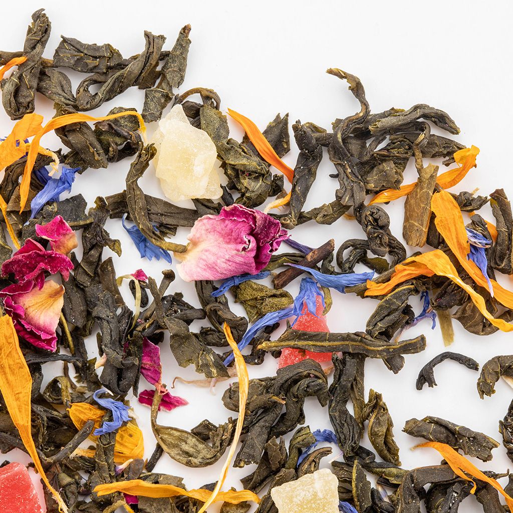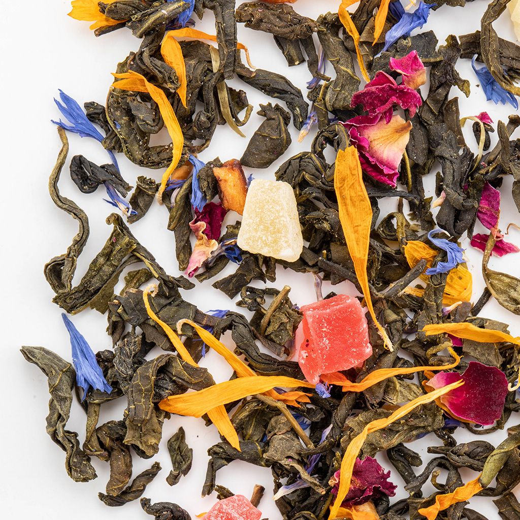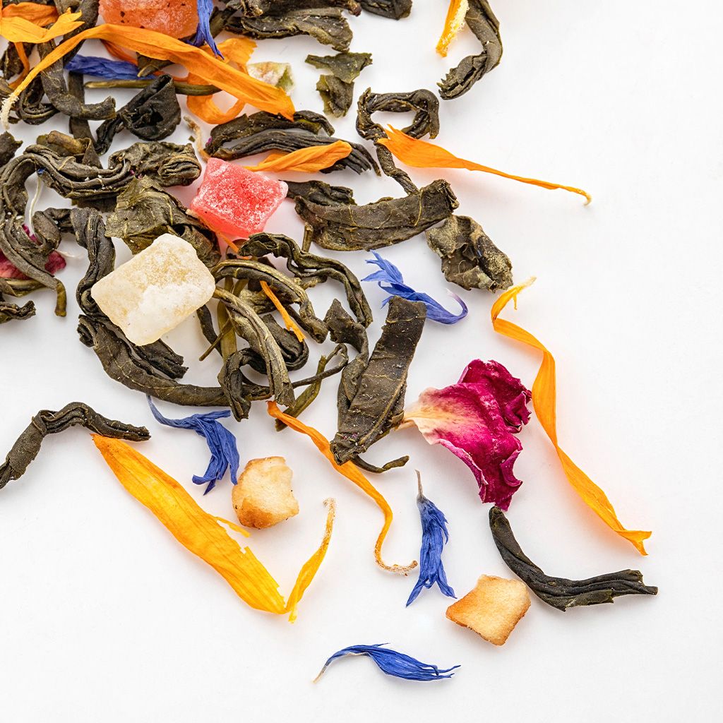 Яркий эффектный купаж на основе зеленого китайского чая с кусочками ананаса, папайи и яблок дополнен лепестками красной розы, календулы и василька.