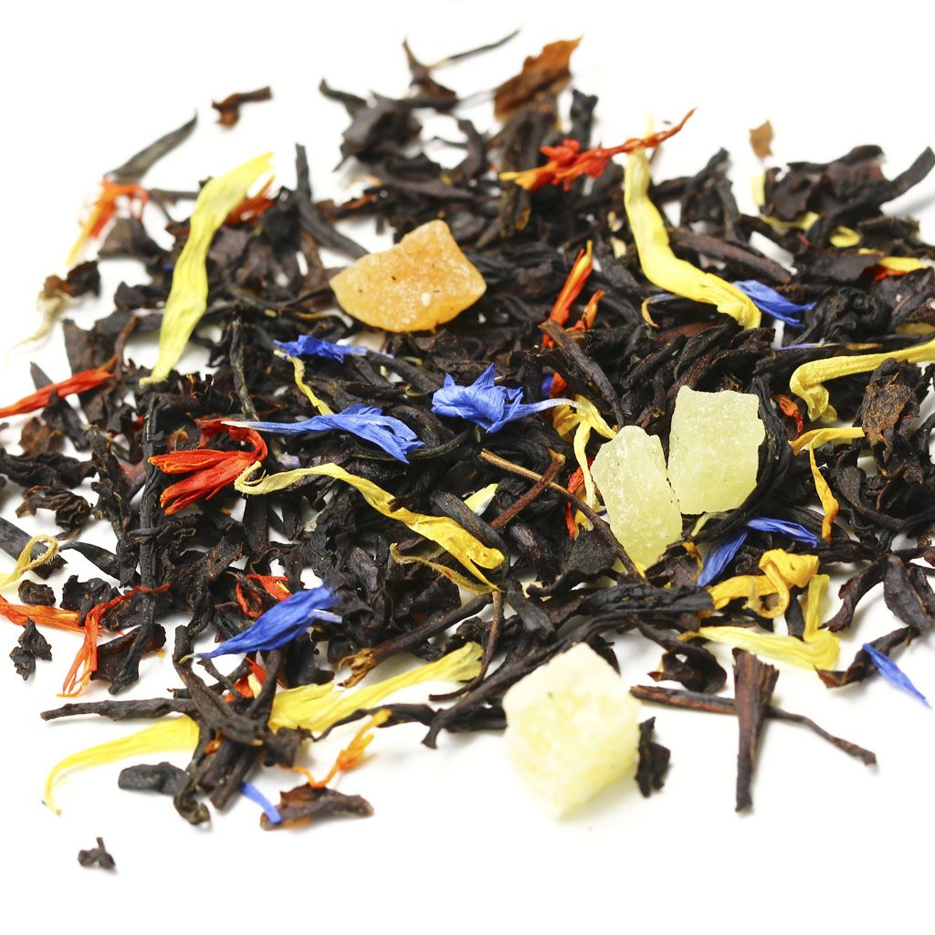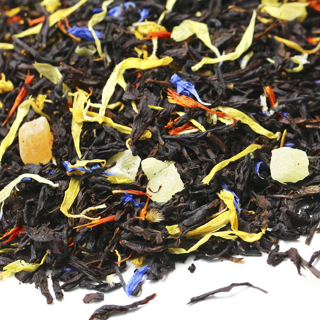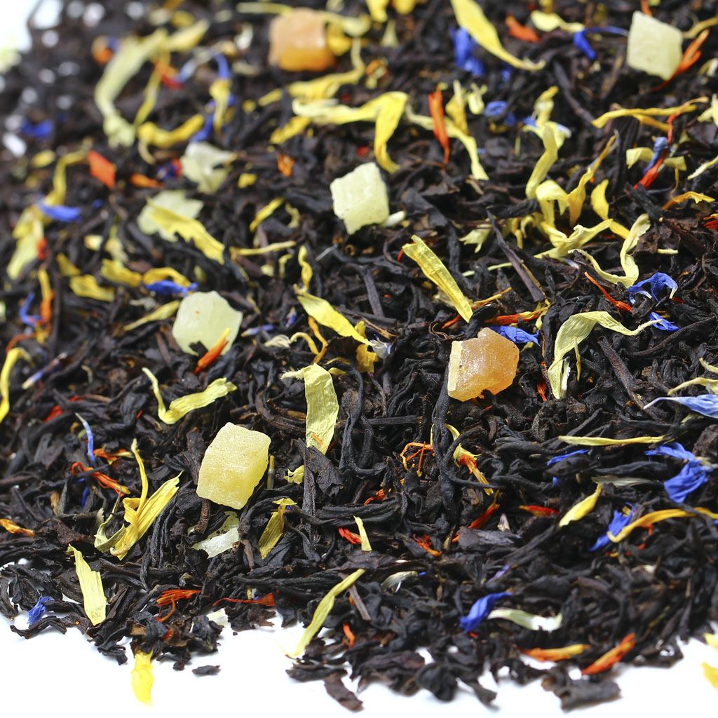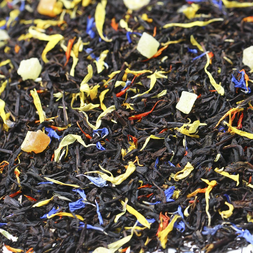 Россыпь черного чая, выращенного на Цейлоне, "острове чая", дополнена кусочками ананаса, лепестками календулы, синего и красного василька.