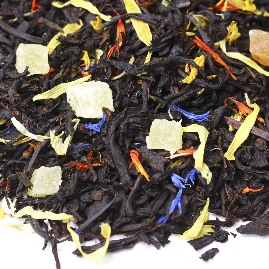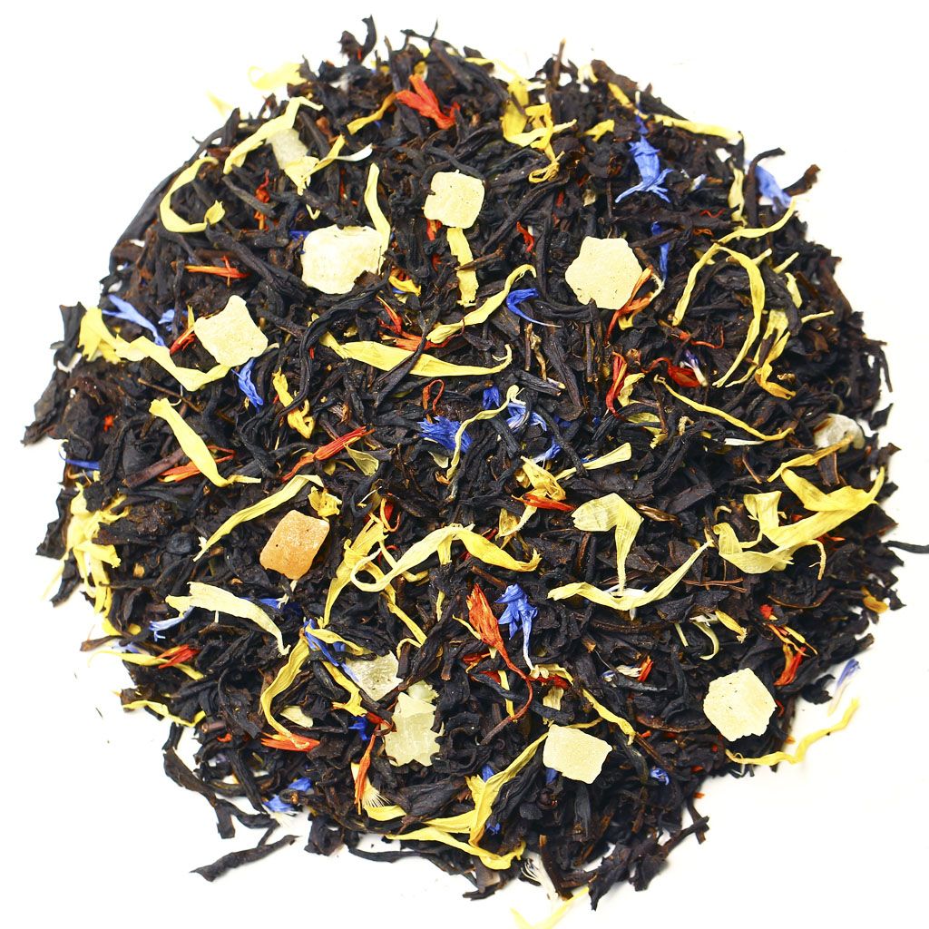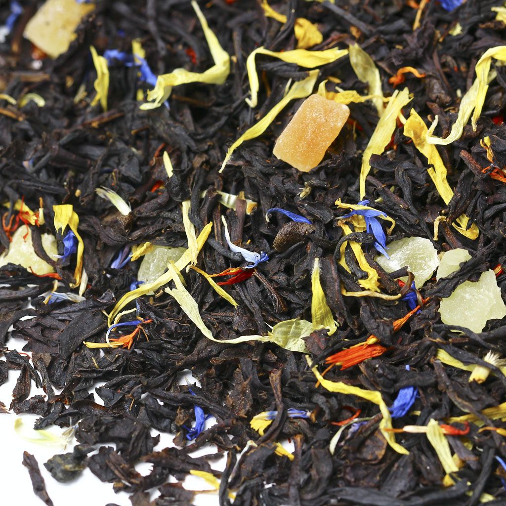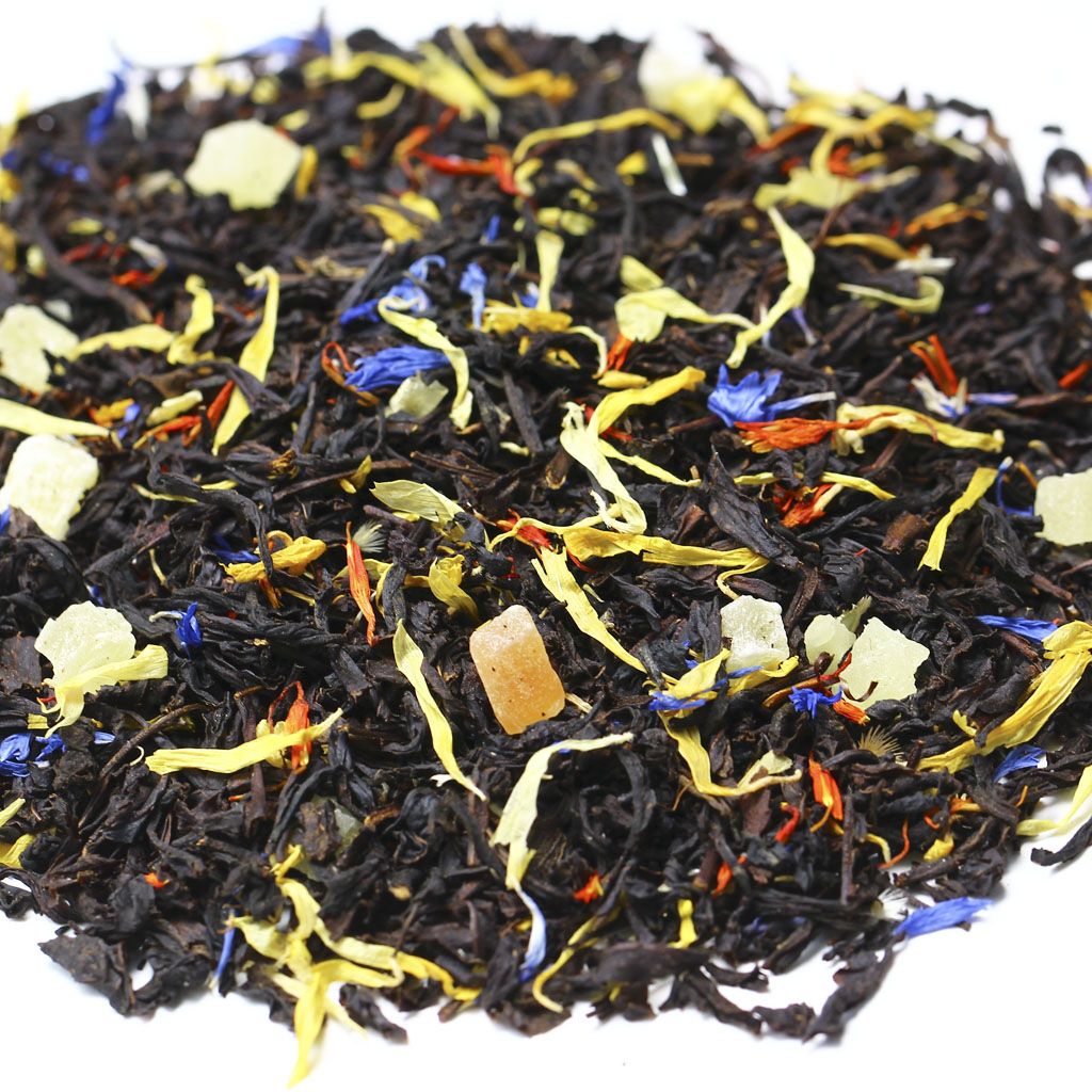 Россыпь черного чая, выращенного на Цейлоне, "острове чая", дополнена кусочками ананаса, лепестками календулы, синего и красного василька.