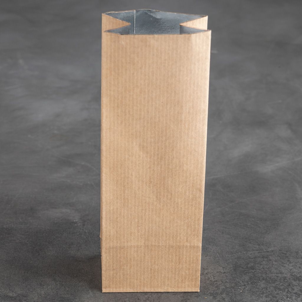 Коричневый крафт пакет 70*40*210 мм для чая и кофе. Имеет 2 слоя. Внешний слой: крафт бумага. Внутренний слой: фольгированный.