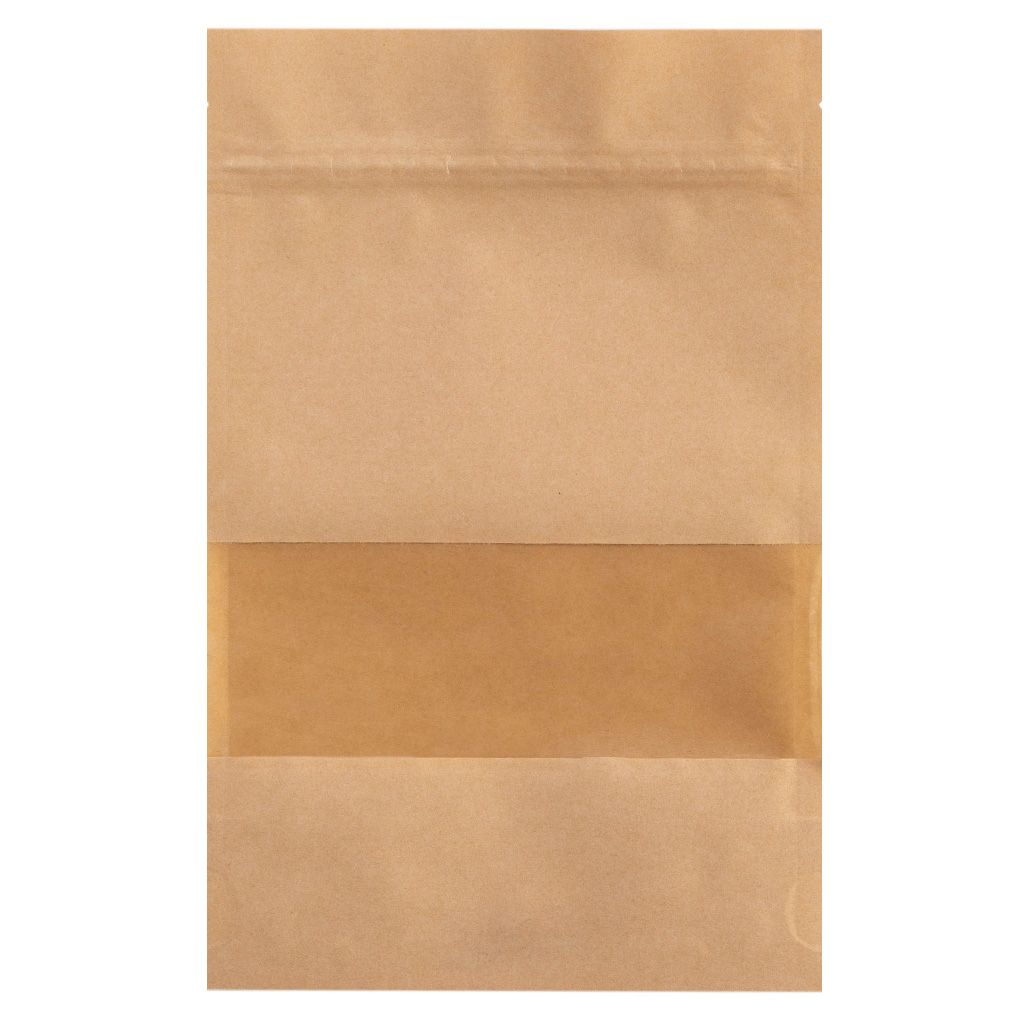 Пакет для чая дой-пак с прозрачным окном и с зипом, внешний слой крафтовый.