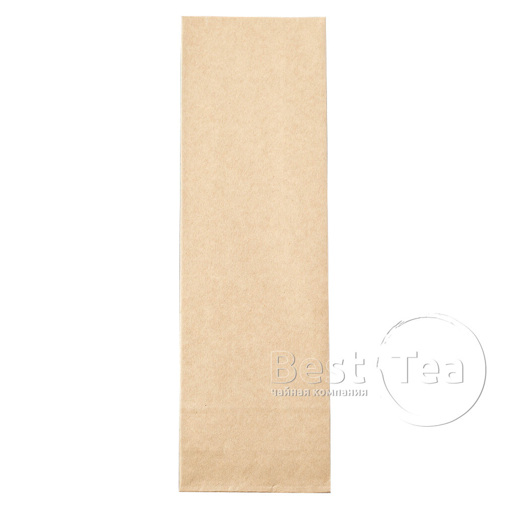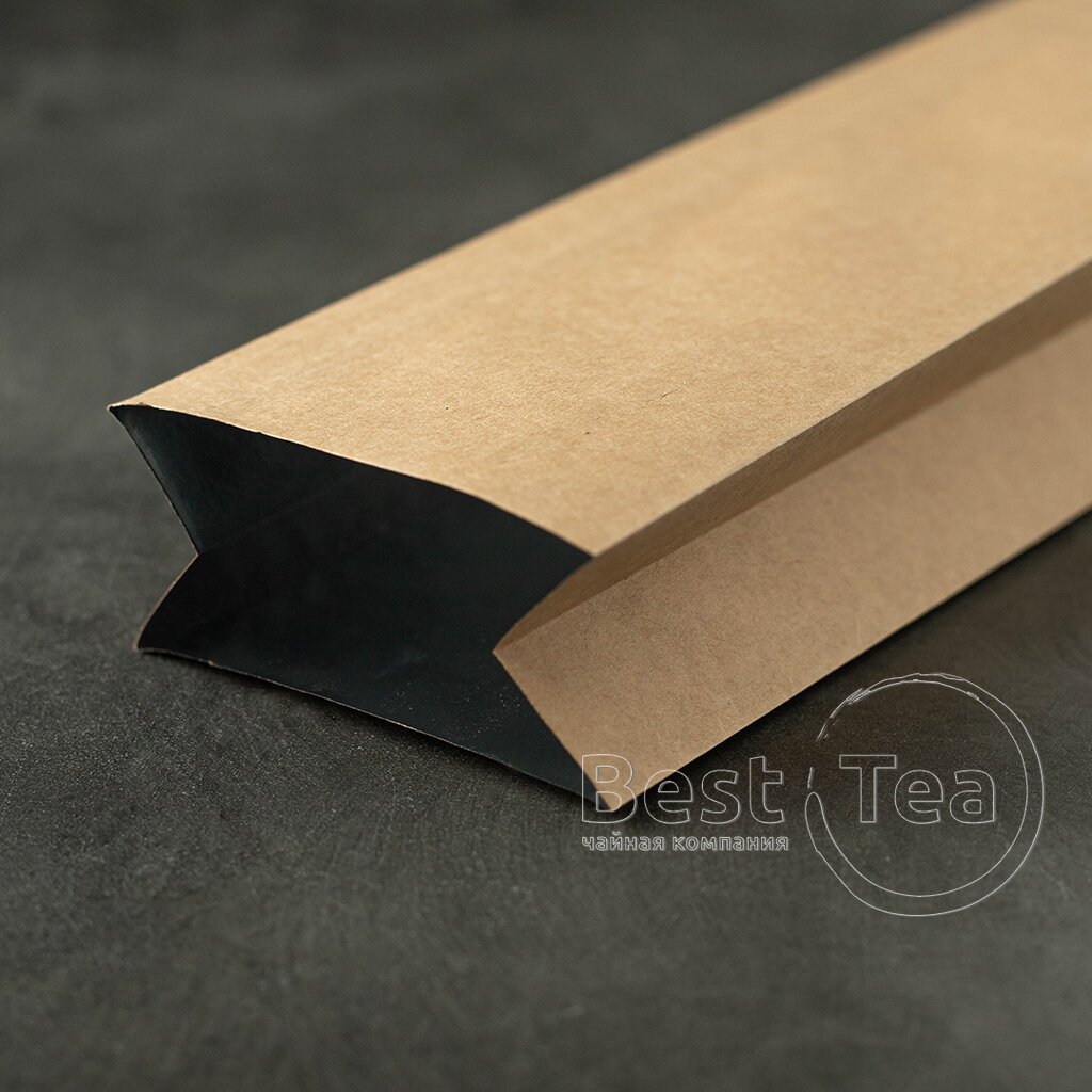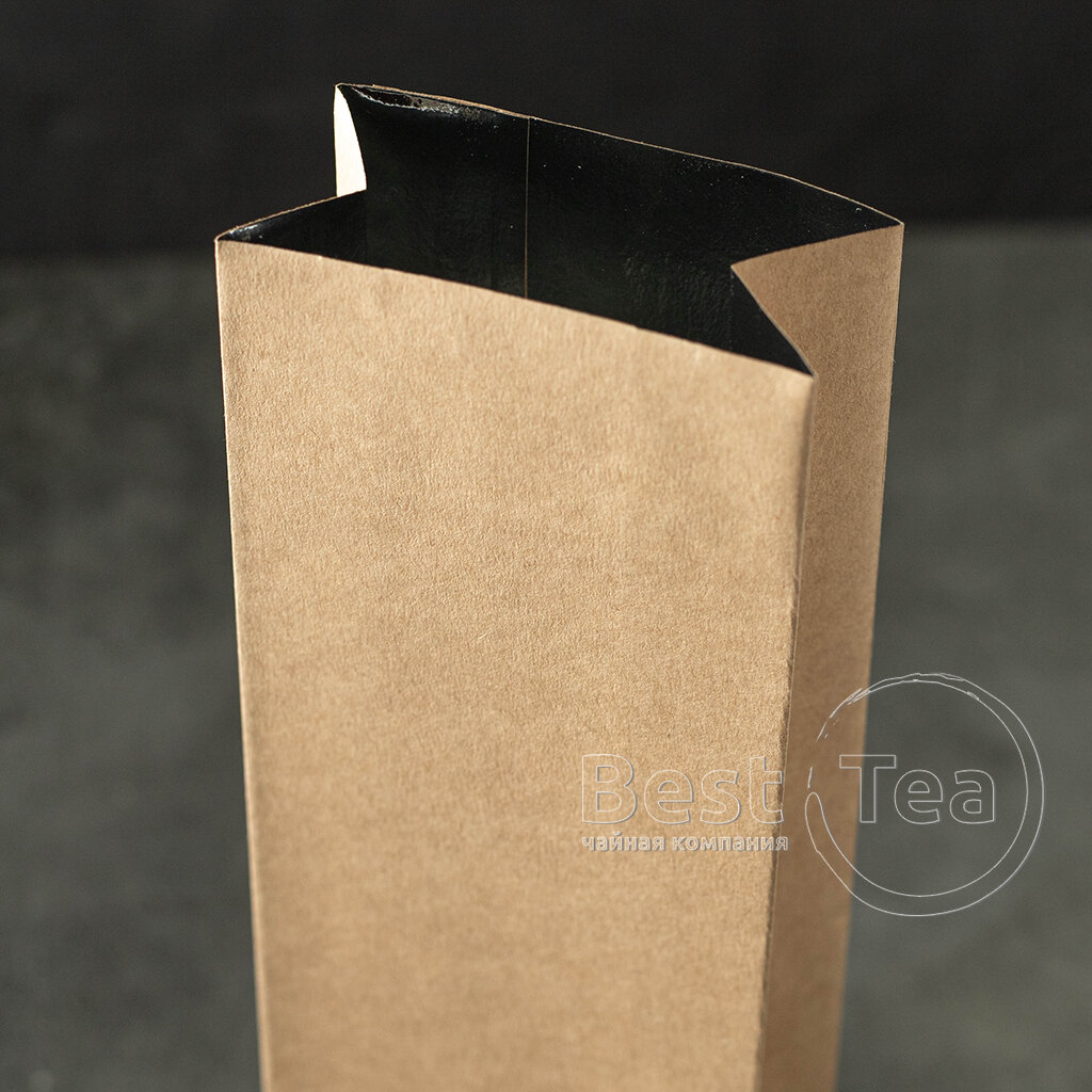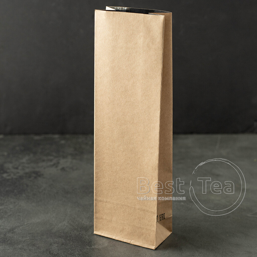 Пакетик для чая с металлическим внутренним слоем и внешним слоем из крафтовой бумаги. Вмещает 100 г. Может использоваться с клип-лентой.