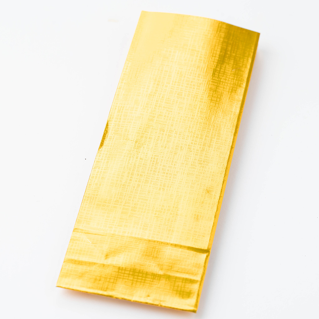 Пакетик для чая с бумажным внутренним слоем и внешним слоем из фольгированной бумаги. Может использоваться с клип-лентой.