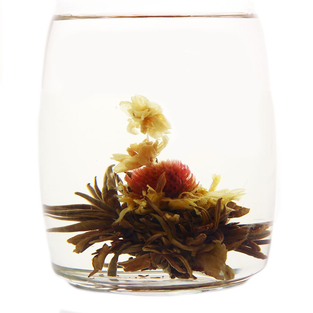 Китайский связанный чай, напоминающий форму фонарика. При заваривании чай имеет не только нежный жасминовый аромат и вкус, но и удивительно красивые цветки розового амаранта, желтой календулы и белого жасмина. 100 г чая = 14 - 16 шариков