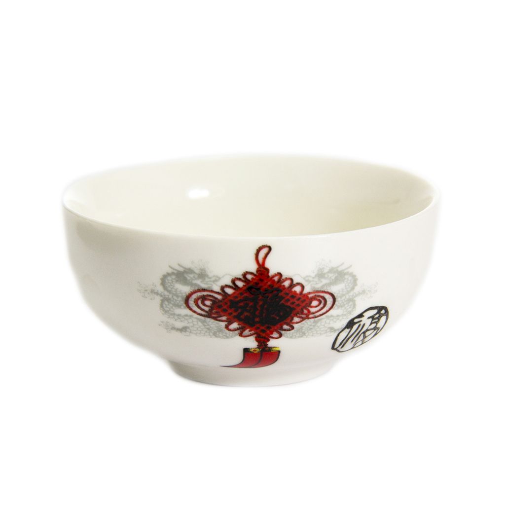 Пиала из белого фарфора, низкая широкая, с изображением амулета и двух драконов