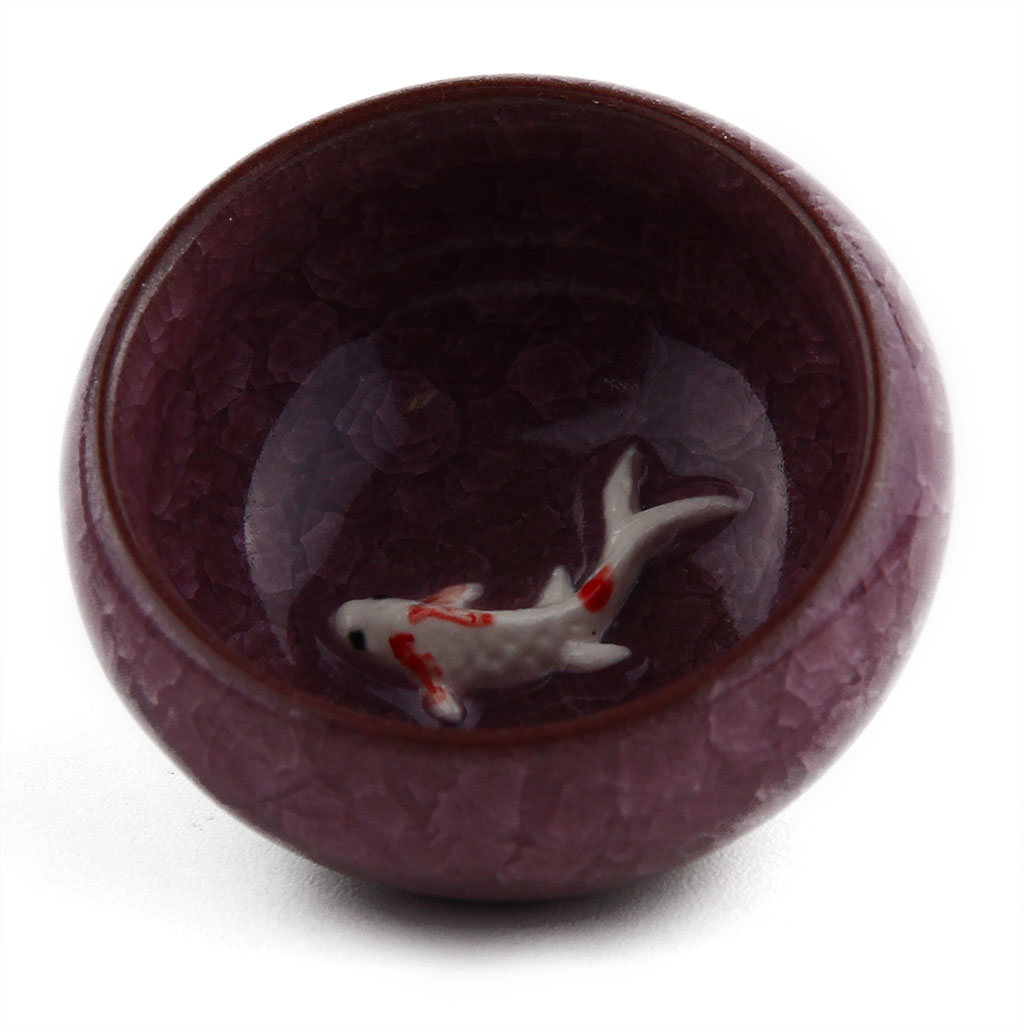 Глиняная пиалка, покрытая розовой глазурью кракле, с керамической 3D рыбкой на донышке