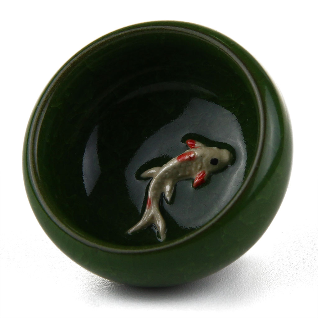 Глиняная пиалка, покрытая зеленой глазурью кракле, с керамической 3D рыбкой на донышке