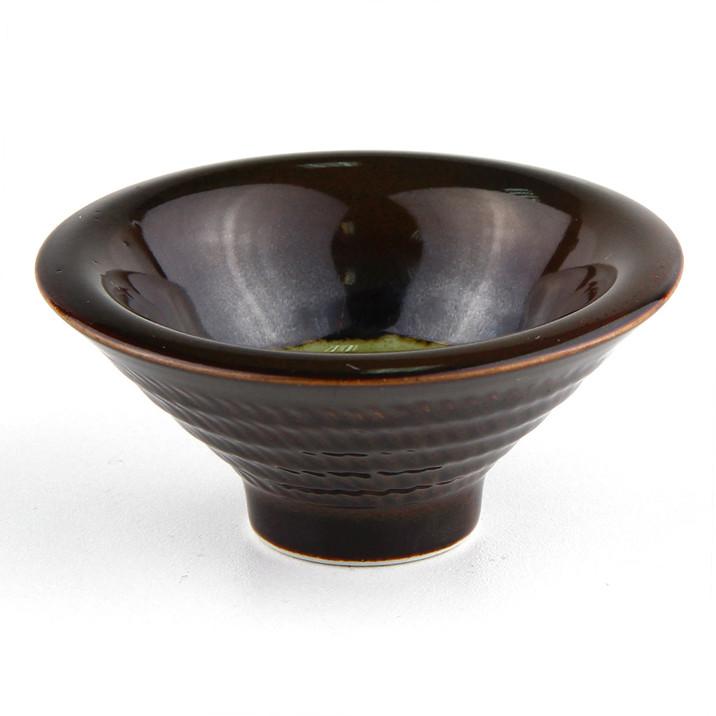Керамическая пиалка, темно-коричневая, с рыбкой на донышке.