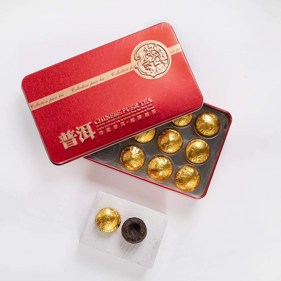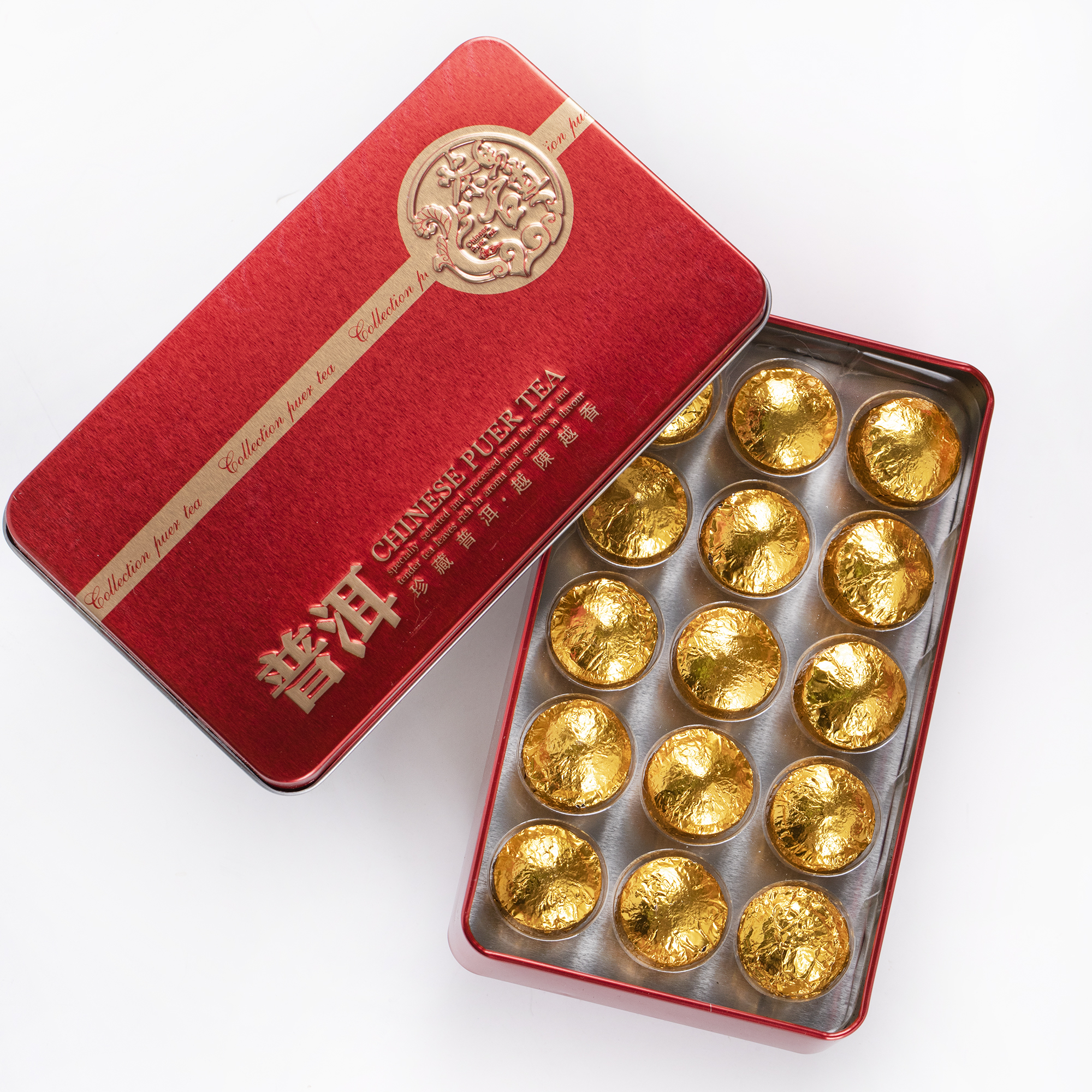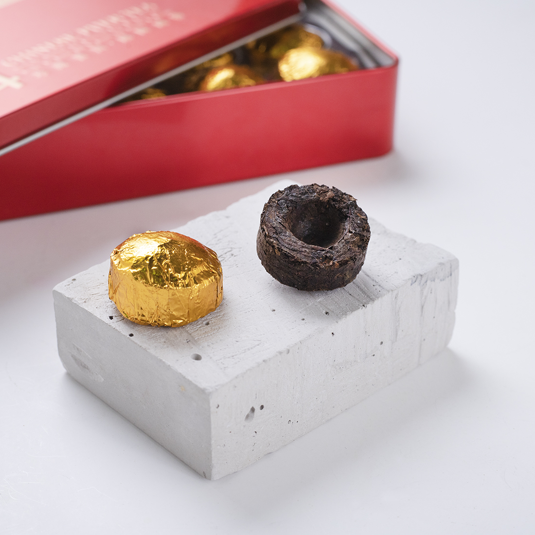 Чай Пуэр Шу пуэр мини точа в фирменной металлической упаковке. Набор состоит из 15 точ по 5 г.