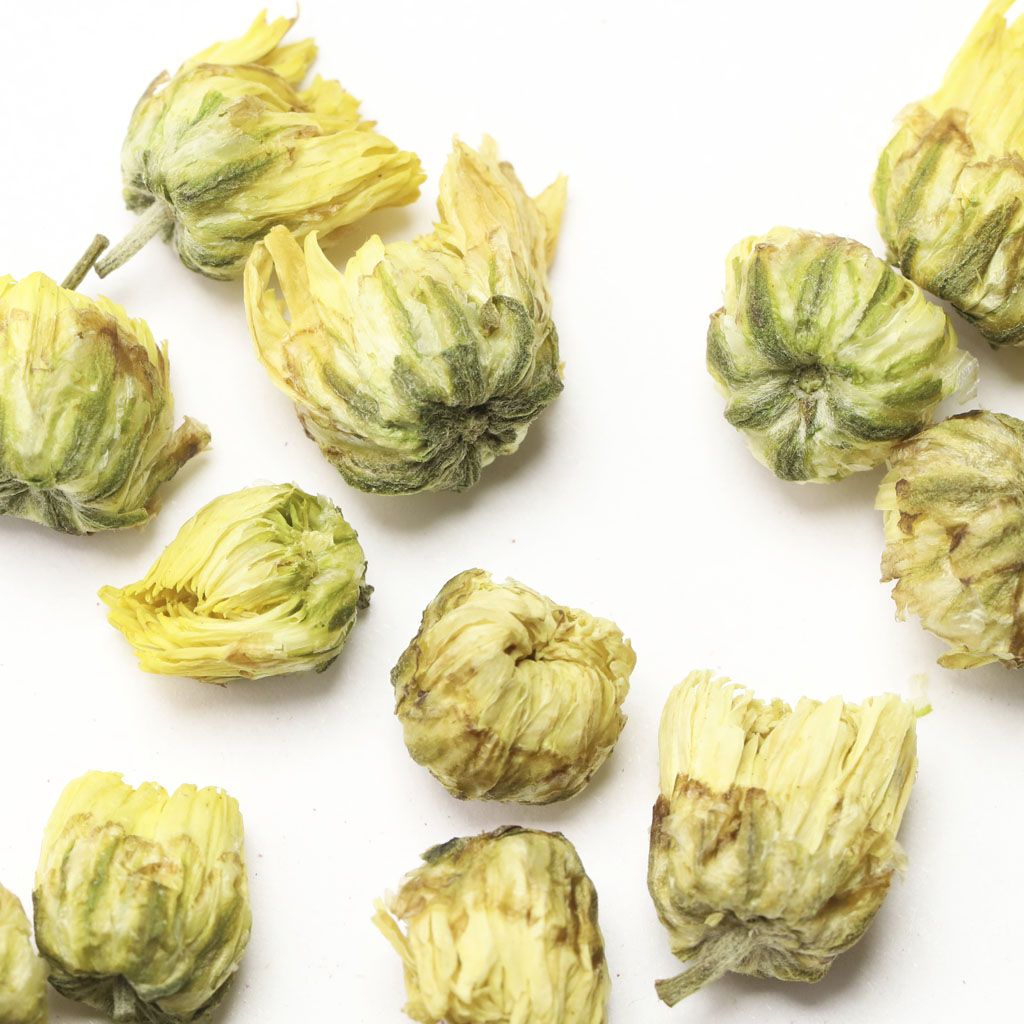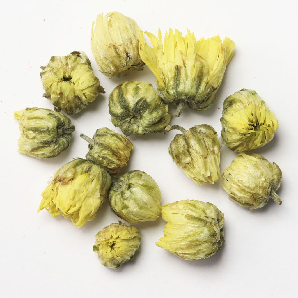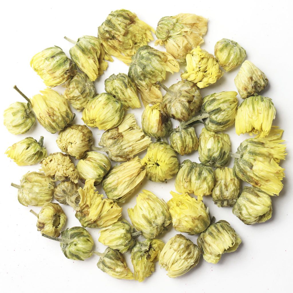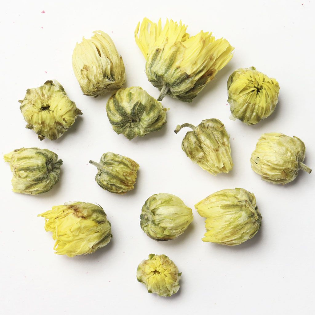 У китайской ромашки цветки собраны в соцветия, представляющие собой многоцветковые корзинки. В центре соцветия мелкие ярко-желтые трубчатые цветки, а по краю крупные язычковые цветки. Это растение образует множество желтых бутонов. Именно их используют в качестве добавки к чайным листьям для придания им аромата. При заваривании чая с китайской ромашкой напиток окрашивается в красивый янтарный цвет. Благодаря бутончикам ромашки вкус напитка становится более мягким, в нем появляются новые летние нотки.