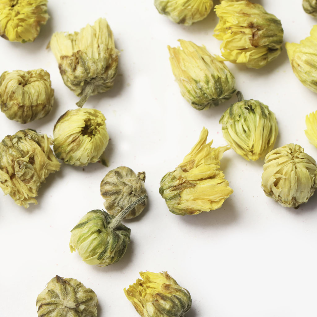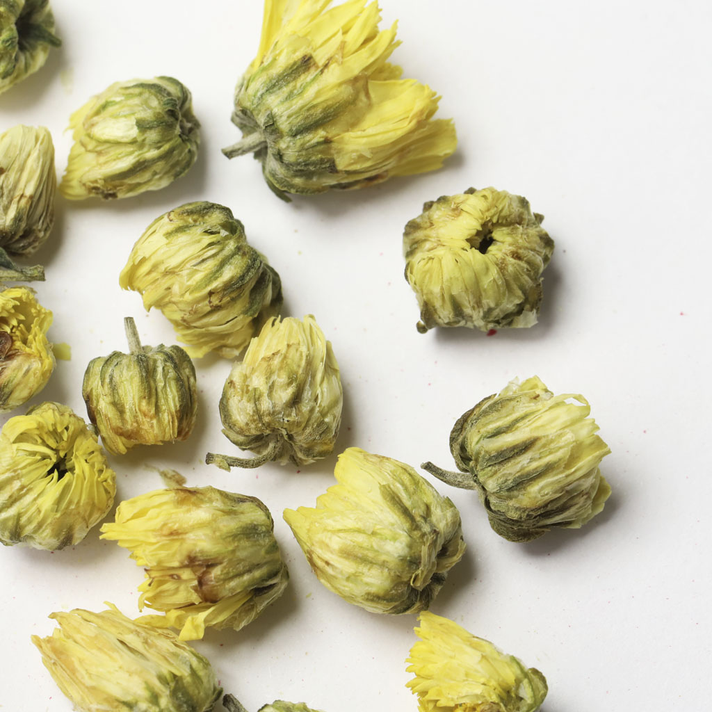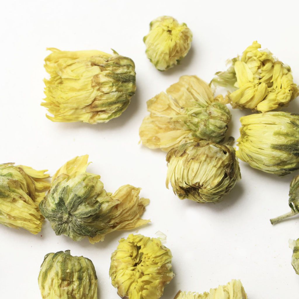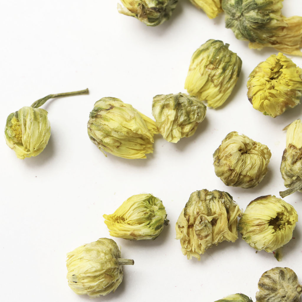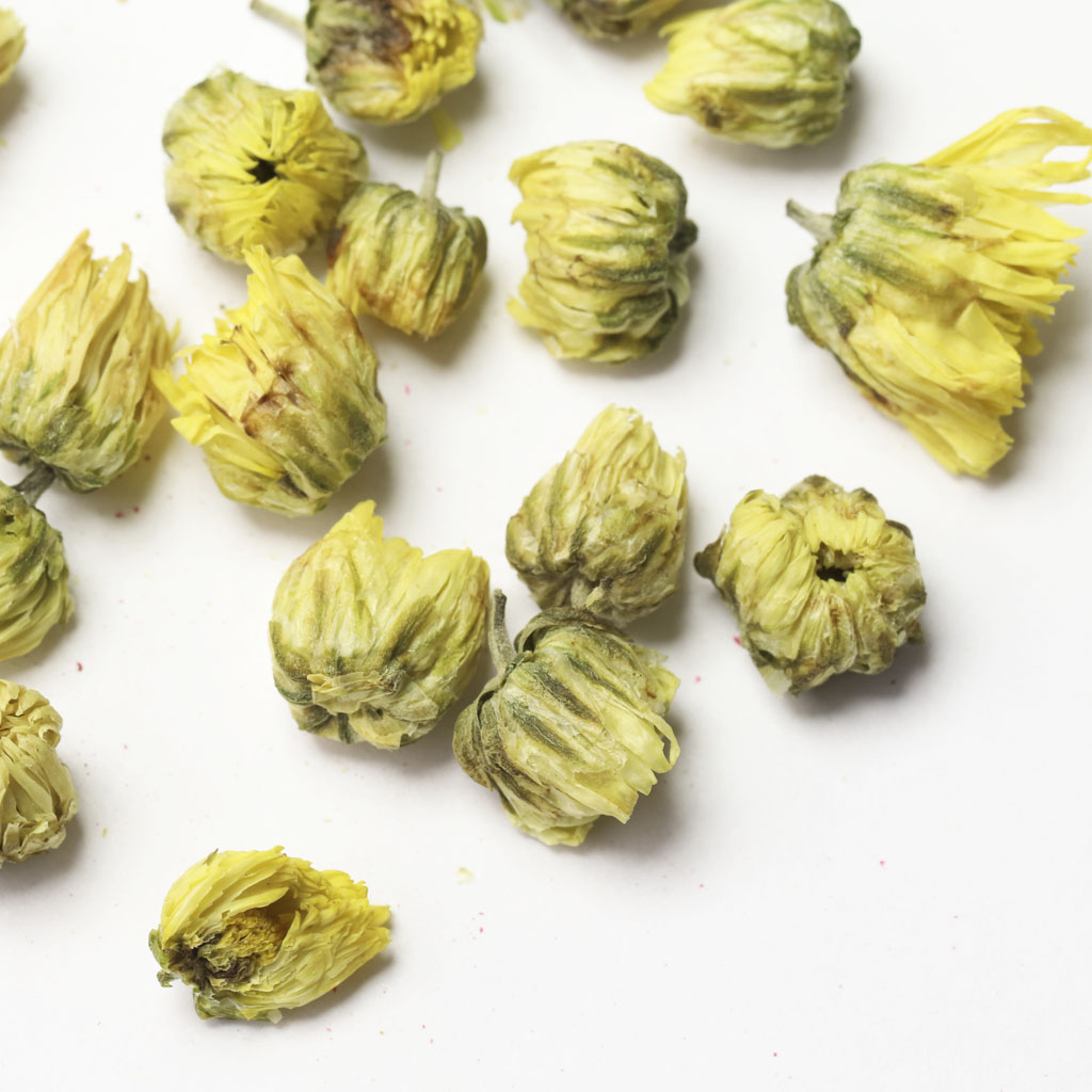 У китайской ромашки цветки собраны в соцветия, представляющие собой многоцветковые корзинки. В центре соцветия мелкие ярко-желтые трубчатые цветки, а по краю крупные язычковые цветки. Это растение образует множество желтых бутонов. Именно их используют в качестве добавки к чайным листьям для придания им аромата. При заваривании чая с китайской ромашкой напиток окрашивается в красивый янтарный цвет. Благодаря бутончикам ромашки вкус напитка становится более мягким, в нем появляются новые летние нотки.