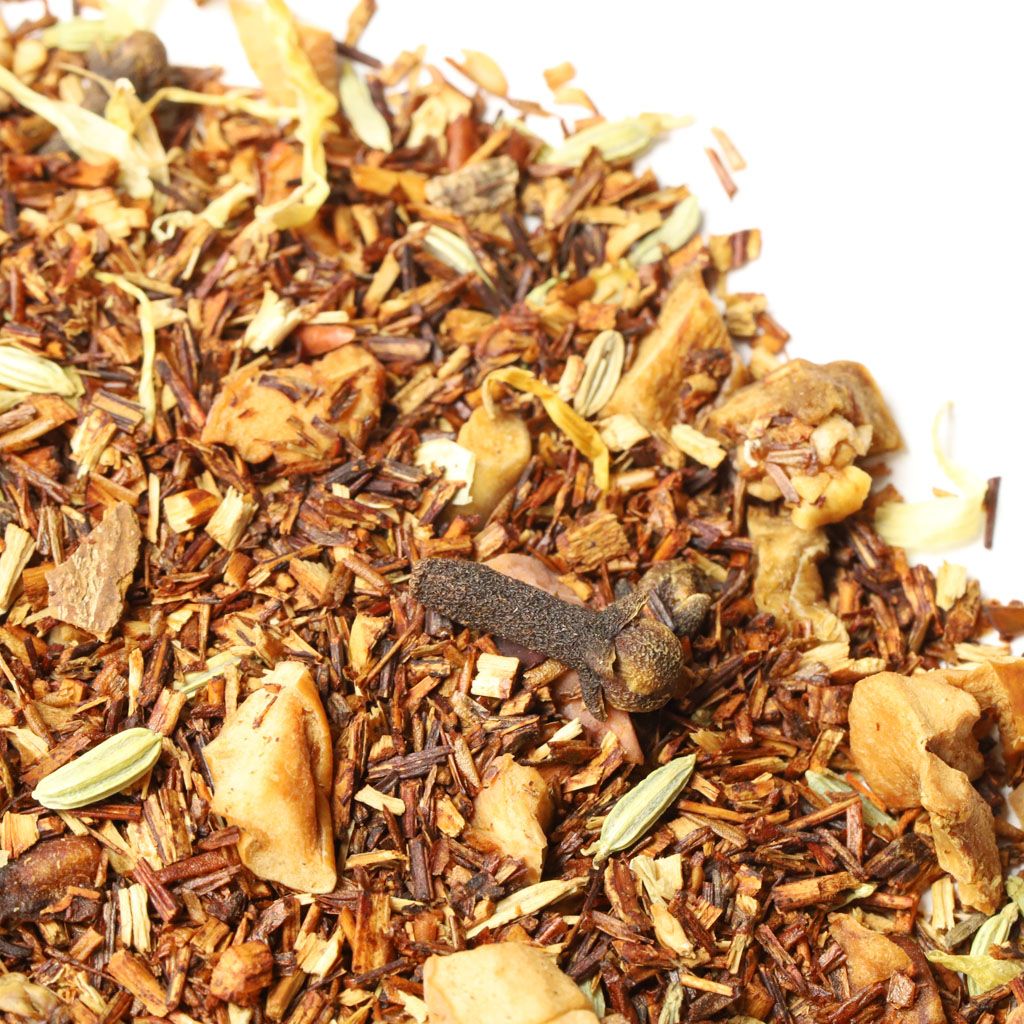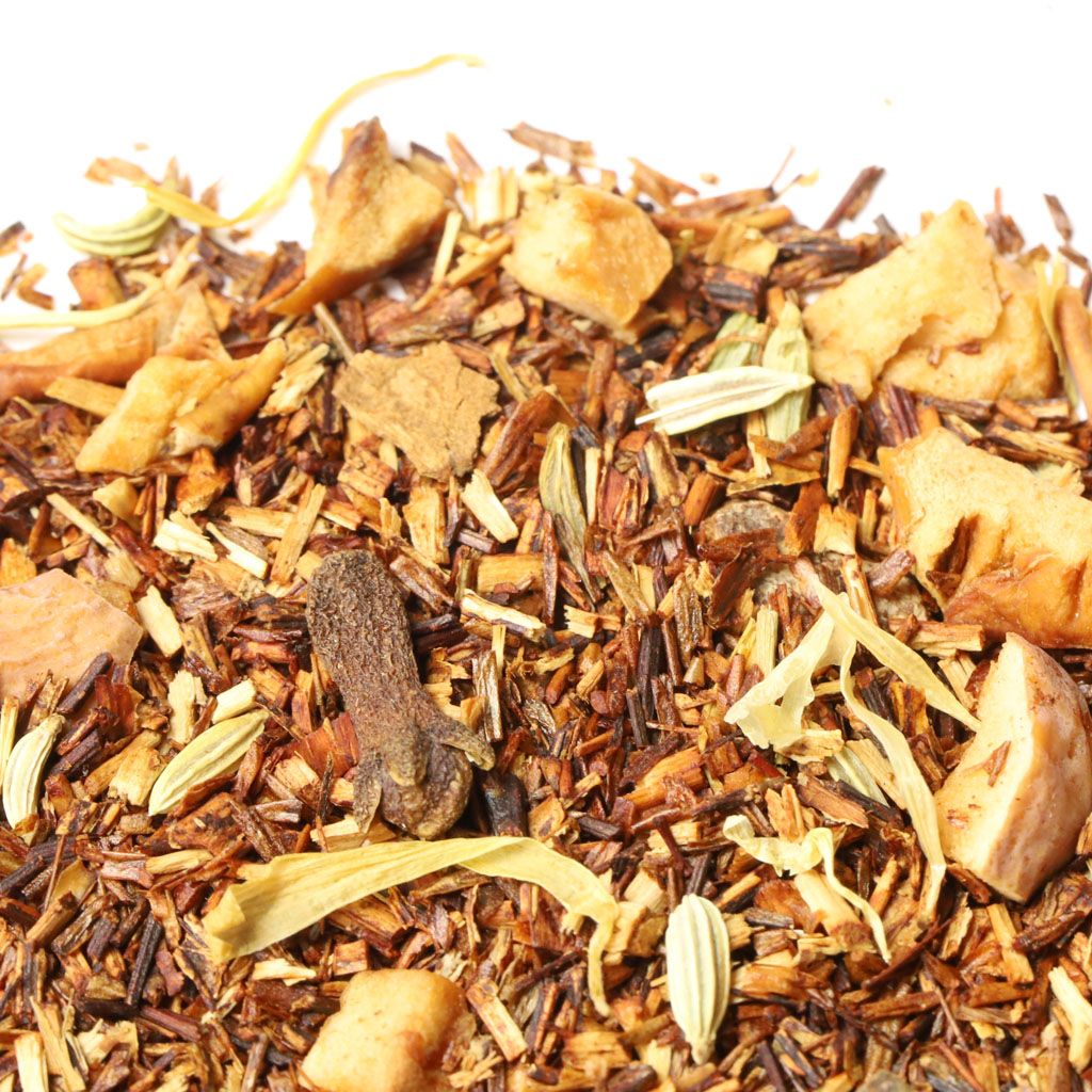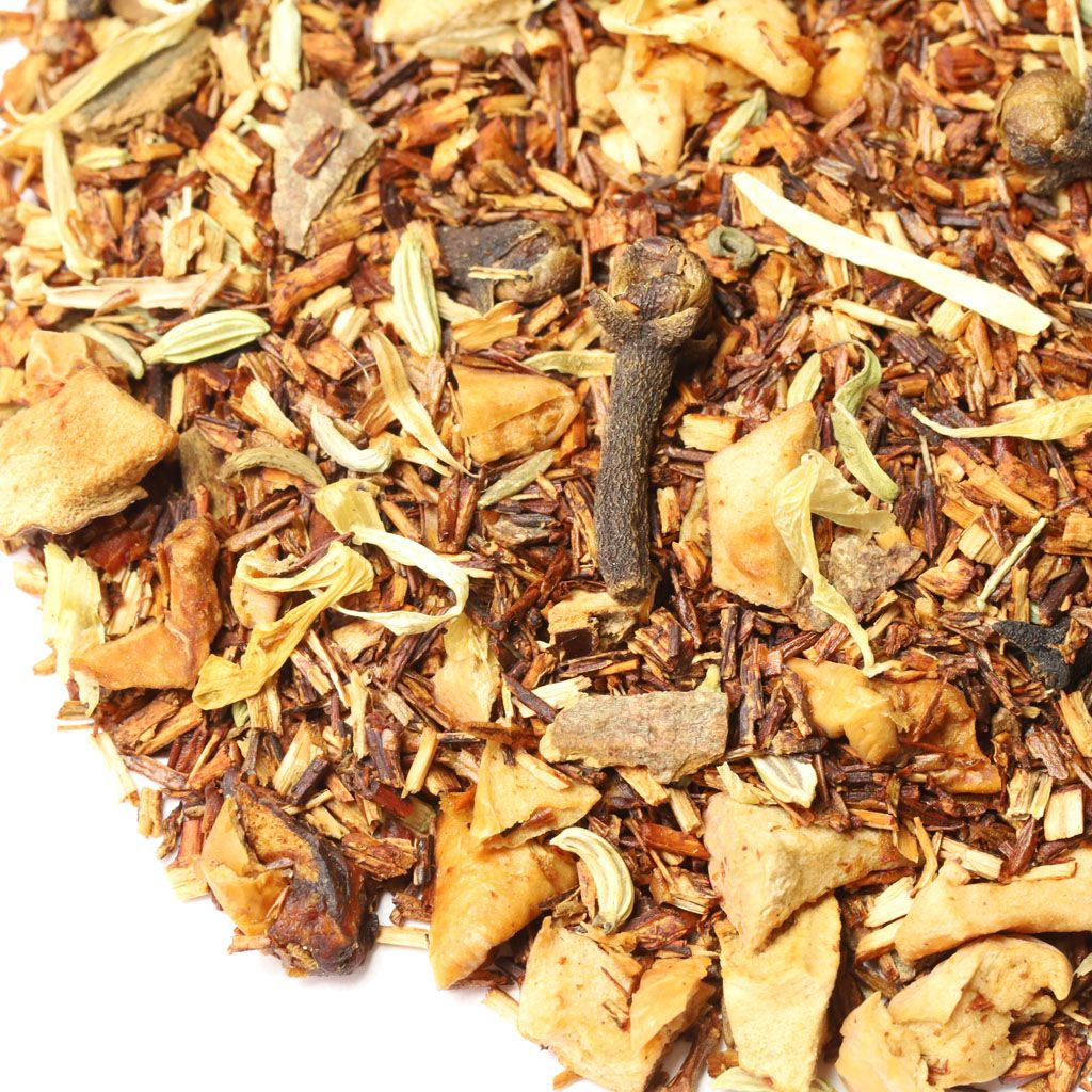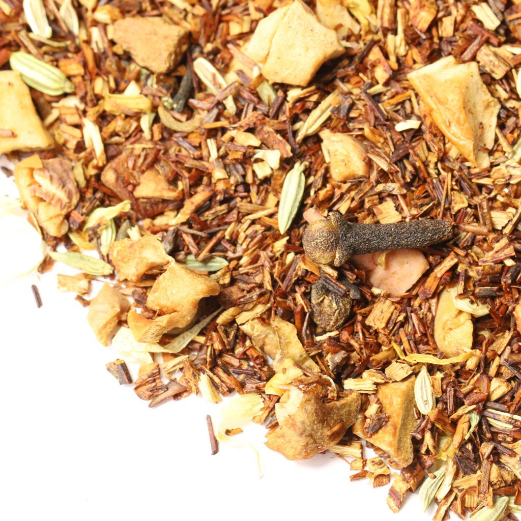 Ройбос, кусочки яблок, кусочки корицы, фенхель, гвоздика, лепестки календулы, аромат свежей выпечки