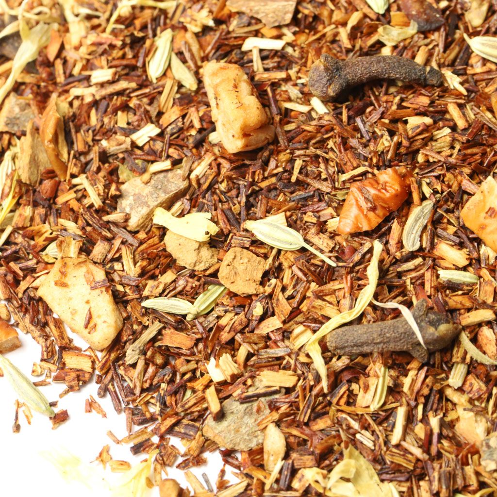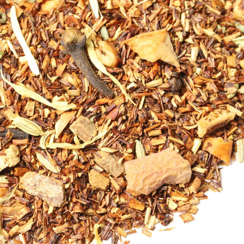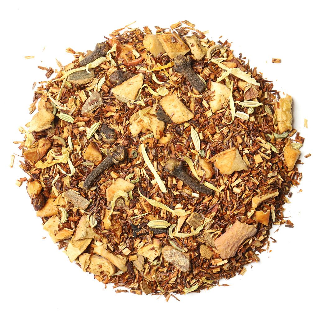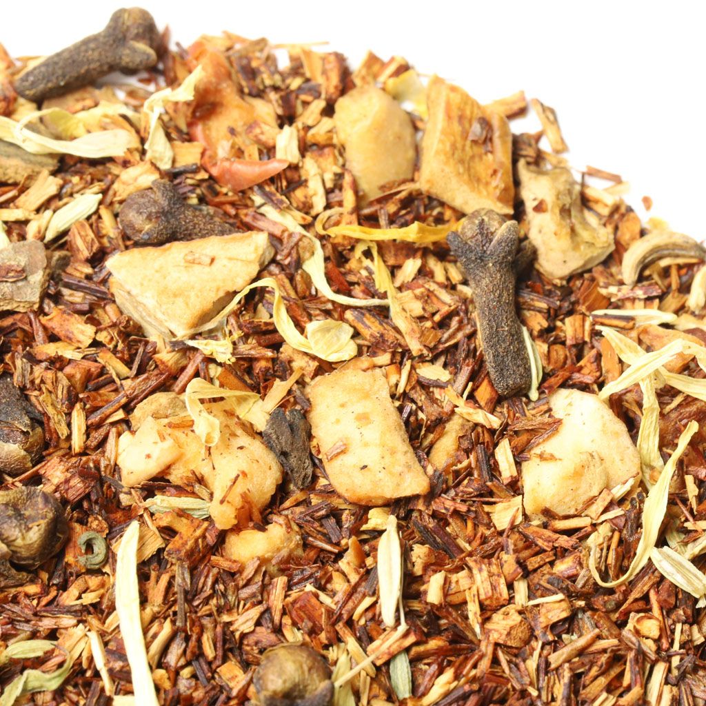 Ройбос, кусочки яблок, кусочки корицы, фенхель, гвоздика, лепестки календулы, аромат свежей выпечки