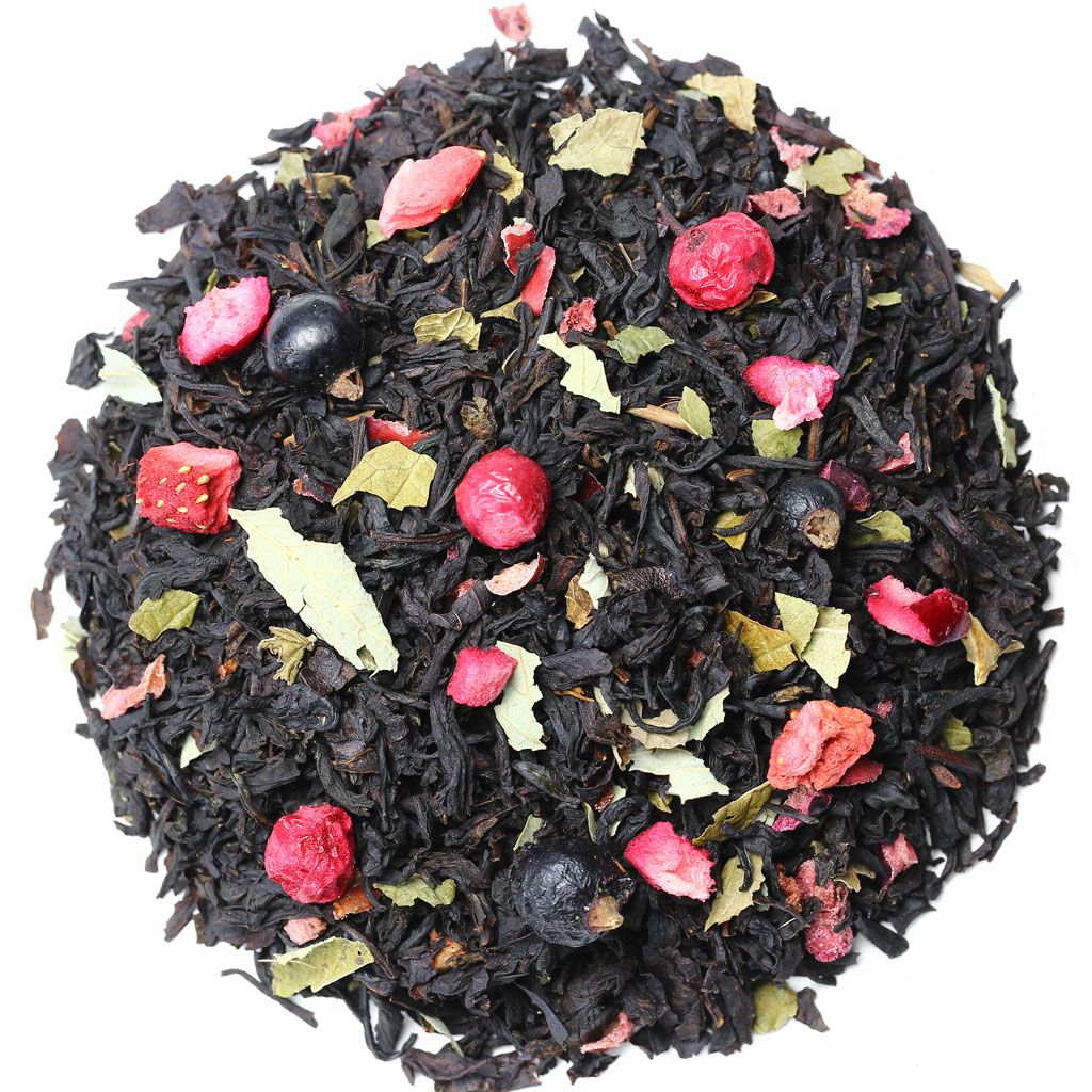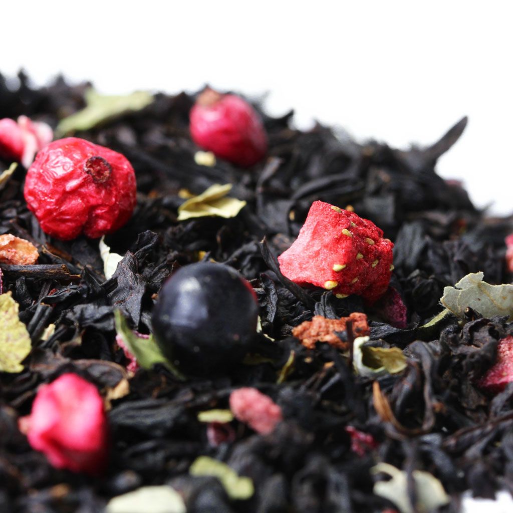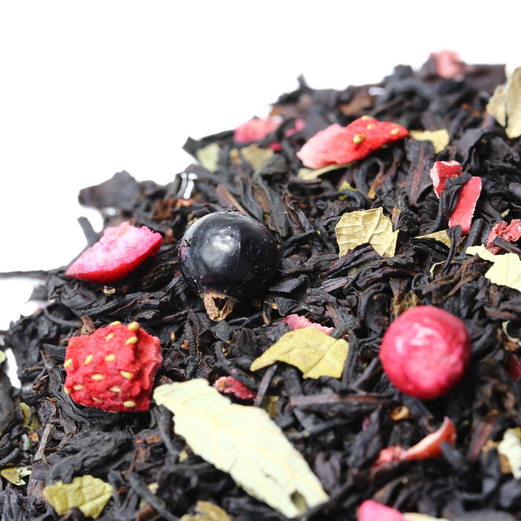 Чай черный индийский, ягоды черной смородины, ягоды красной смородины, кусочки клюквы, кусочки клубники, листья смородины, аромат черной смородины и дикой вишни.
