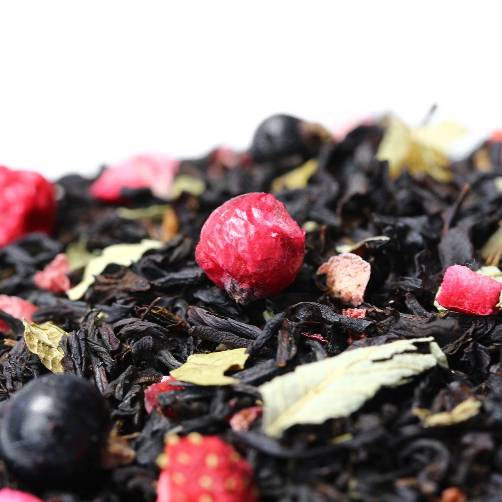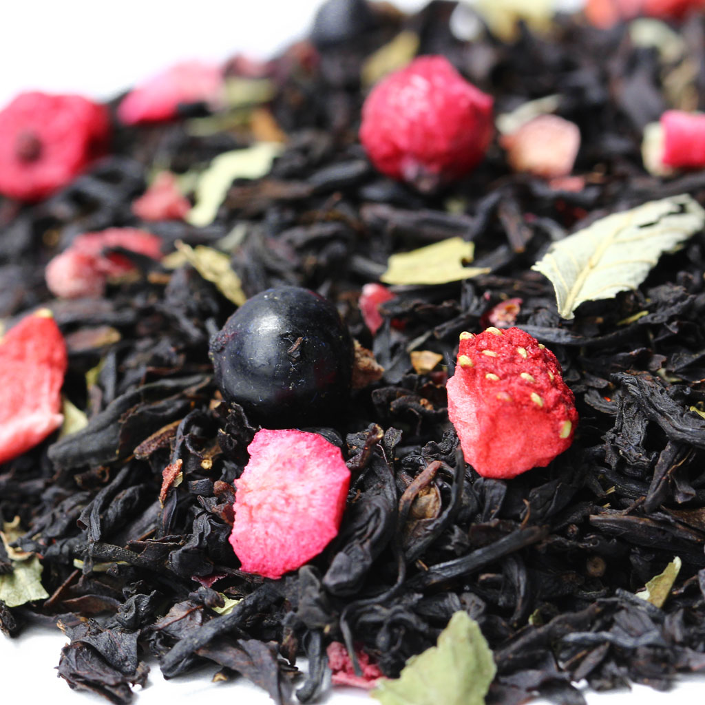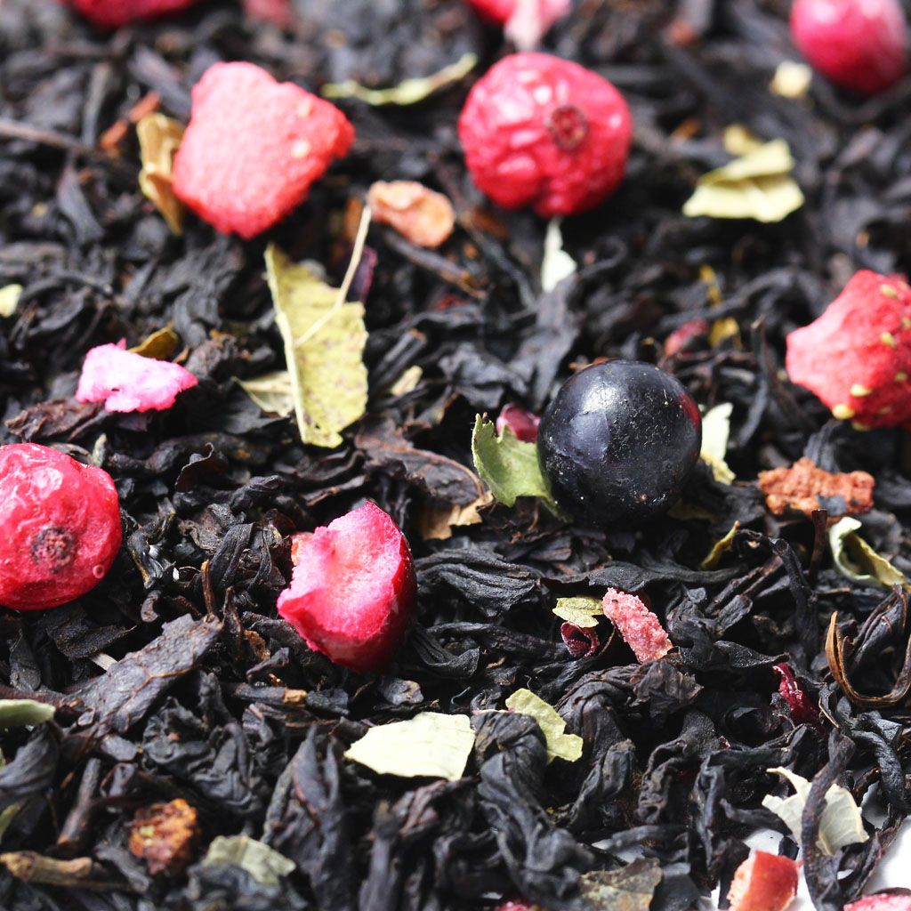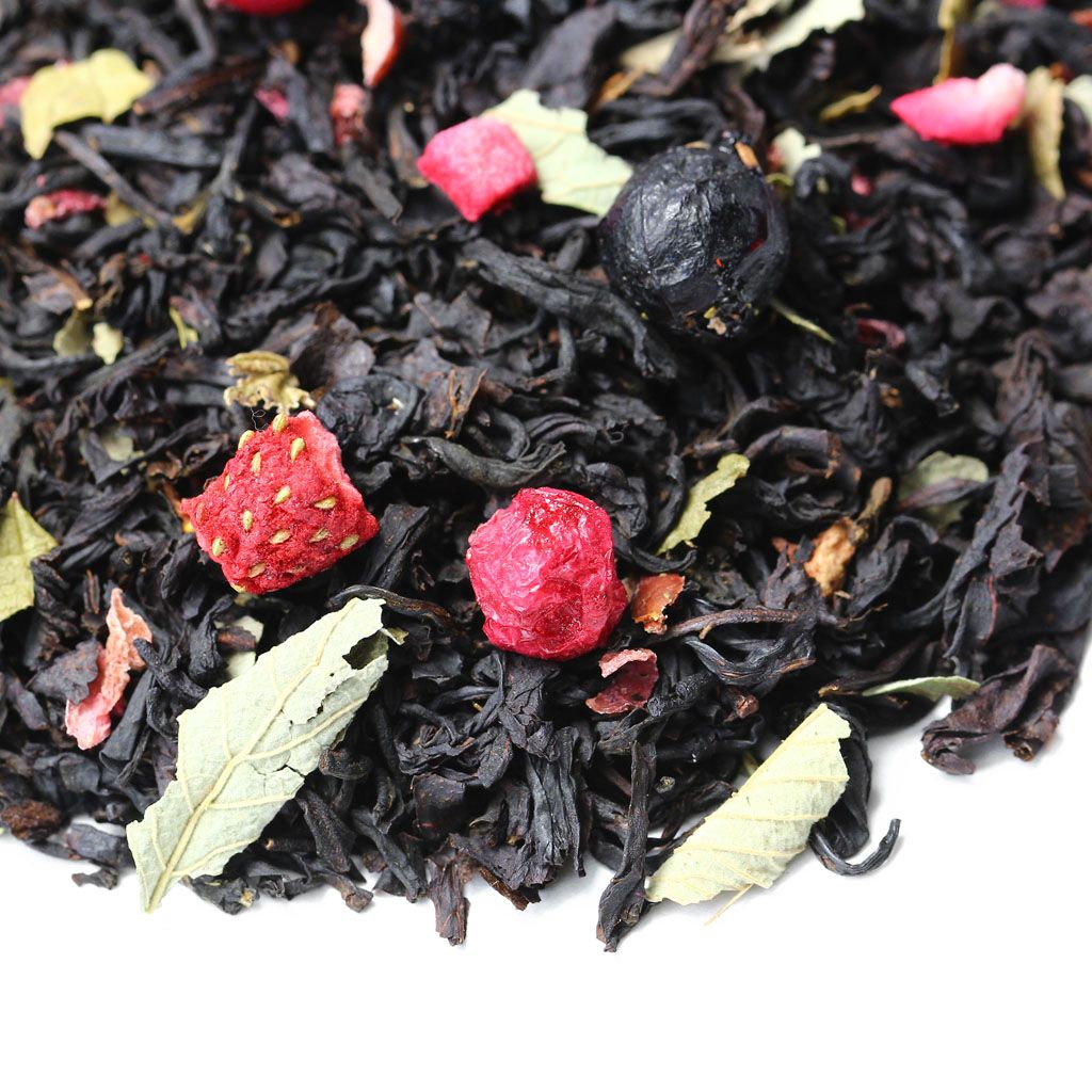 Чай черный индийский, ягоды черной смородины, ягоды красной смородины, кусочки клюквы, кусочки клубники, листья смородины, аромат черной смородины и дикой вишни.