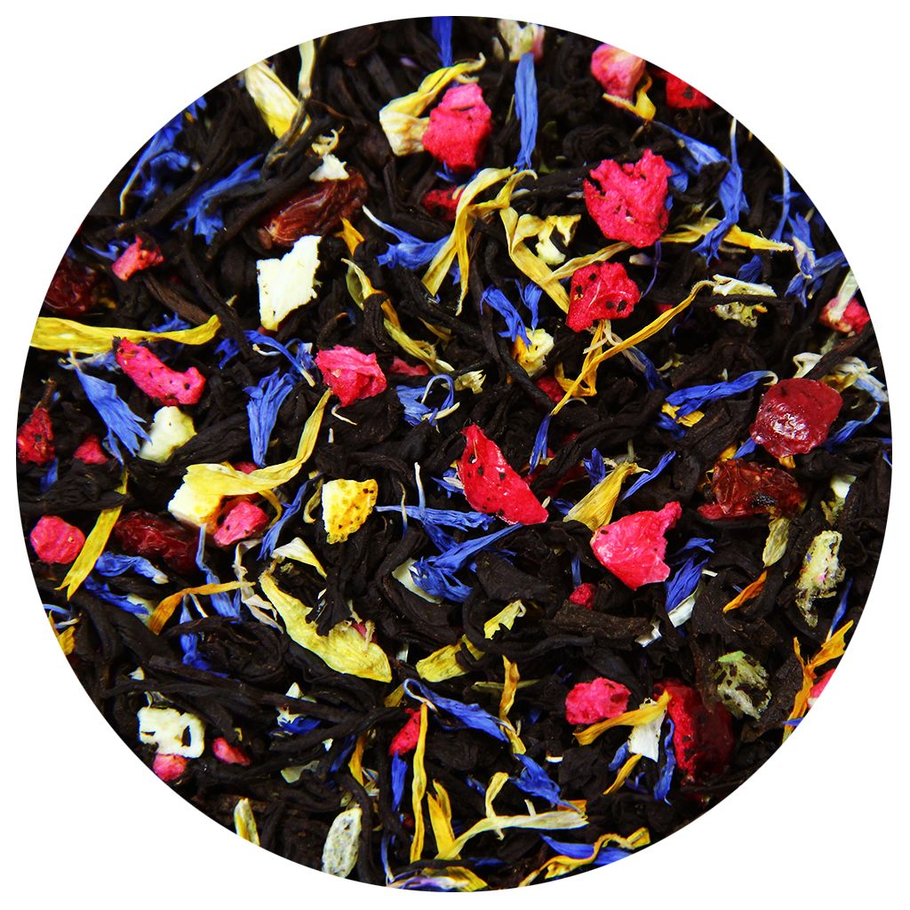 Чай черный индийский, плоды барбариса, кусочки клюквы, кусочки малины, кусочки апельсина с цедрой, лепестки василька, лепестки календулы, лепестки сафлора, аромат барбариса и цитрусовых