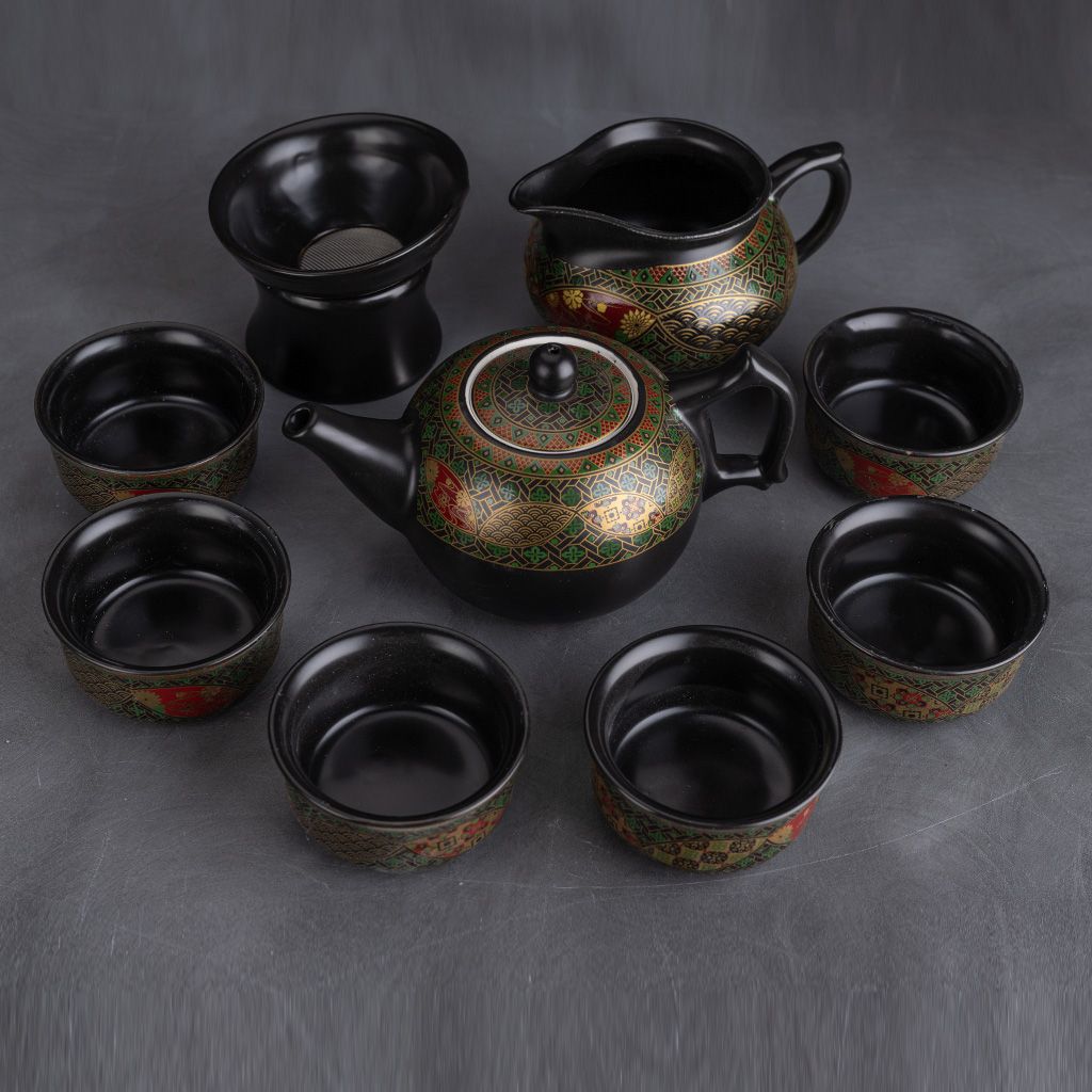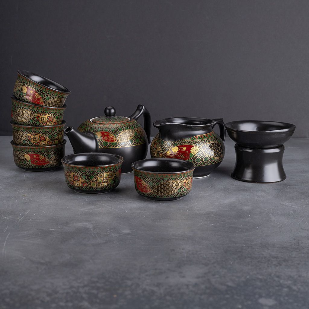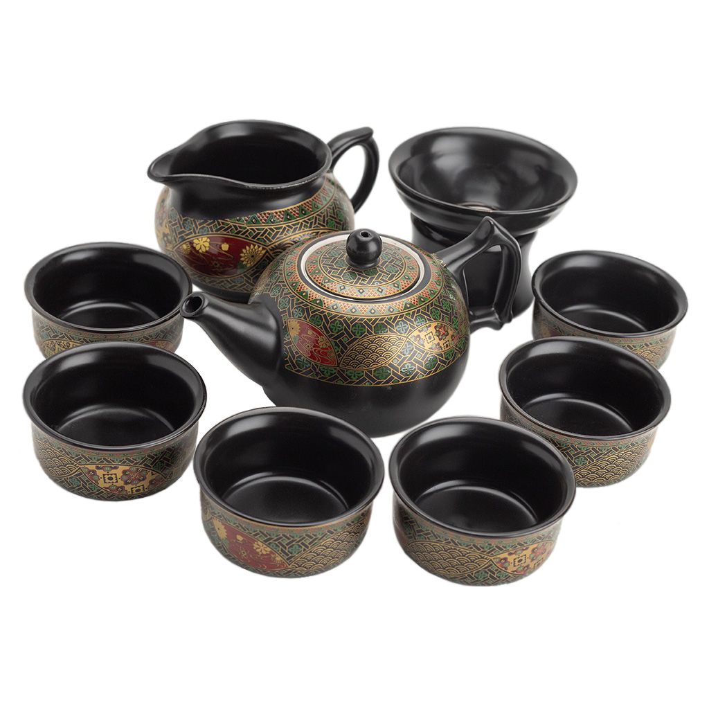 Керамический сервиз Орнамент из 9 предметов. В наборе: чайник, молочник (чахай), сито, 6 пиал.