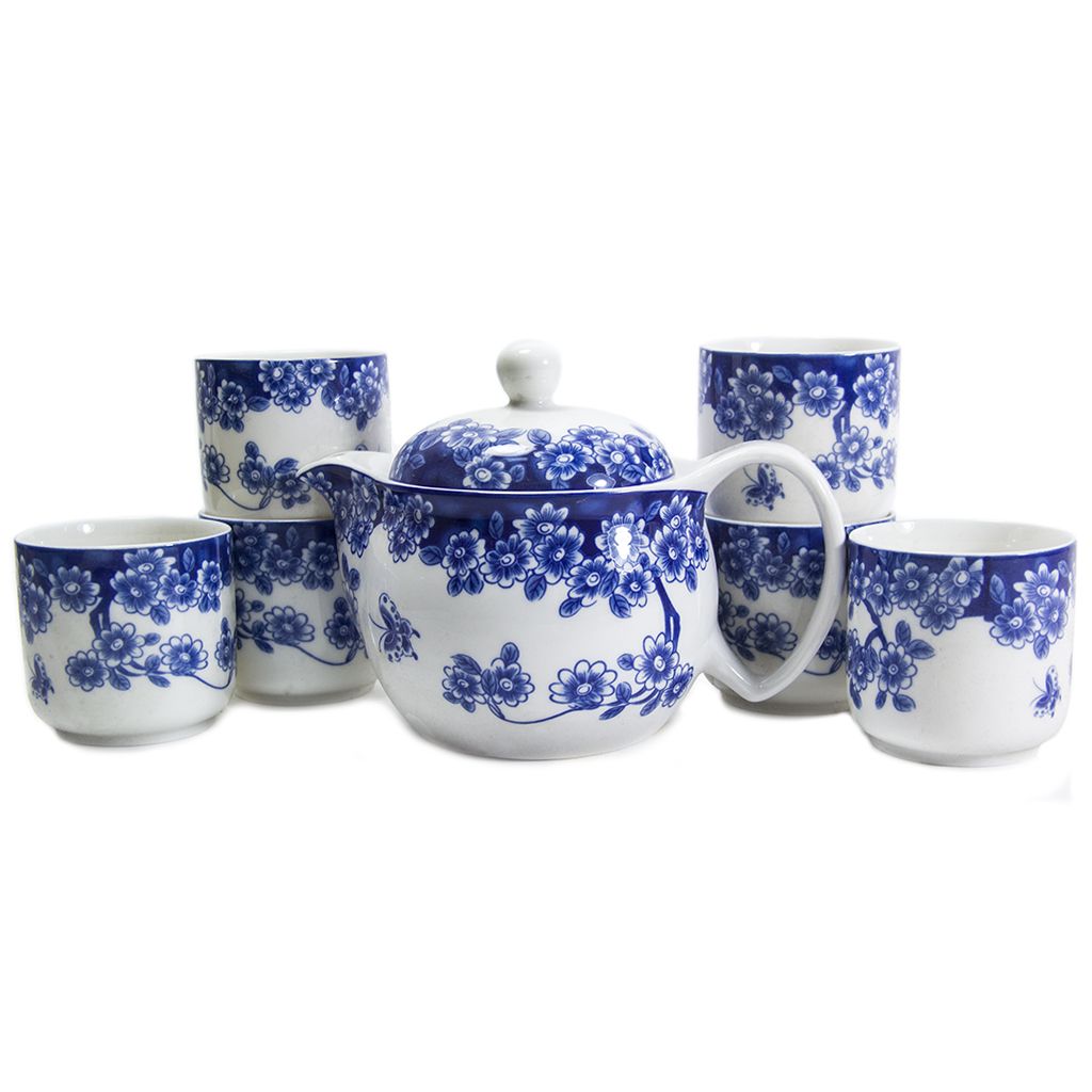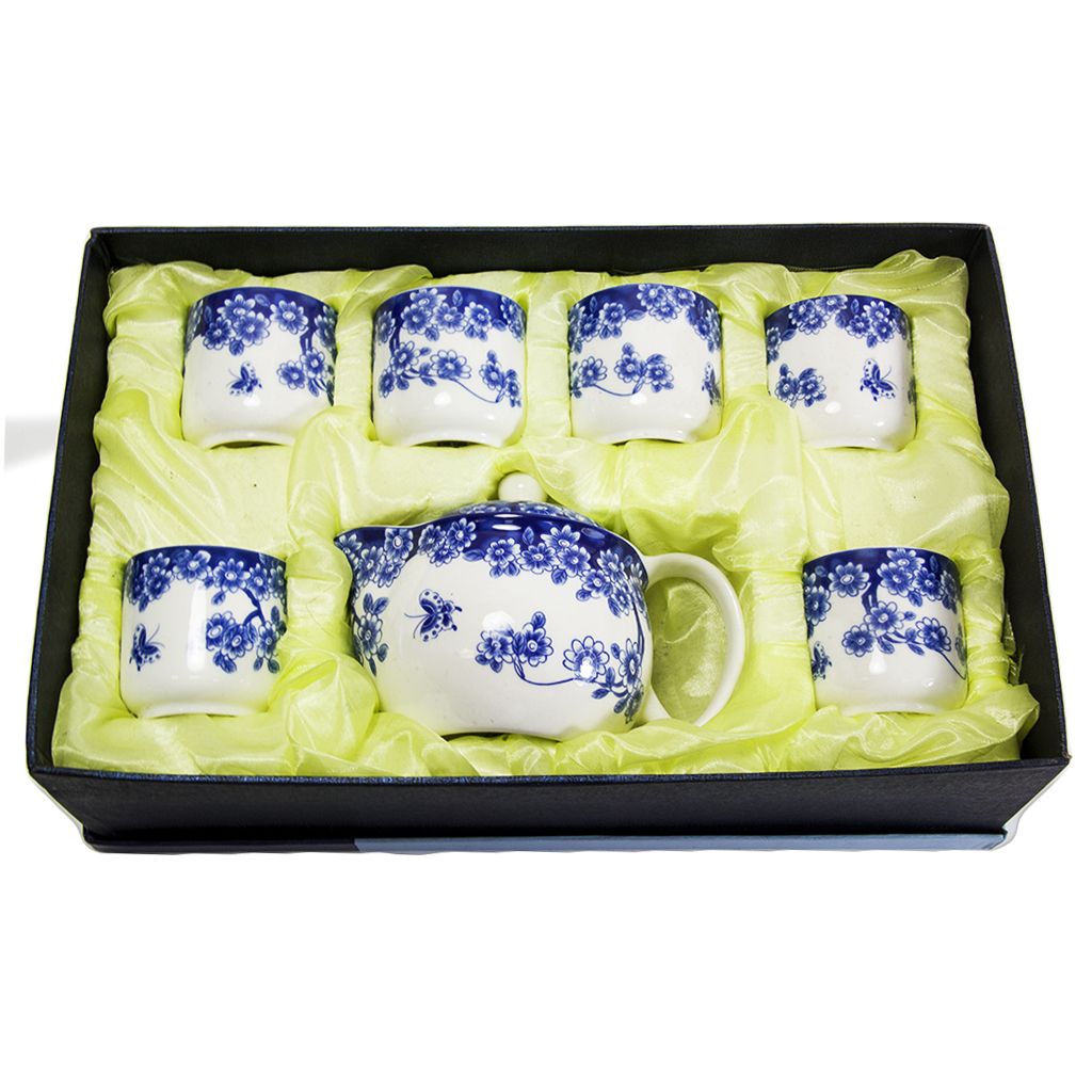 Фарфоровый чайный сервиз белый с голубым цветочным узором, включает 1 чайник - 320 мл, 6 пиал по 100 мл в картонной коробке с ложементом + нетканый белый мешочек с синим узором